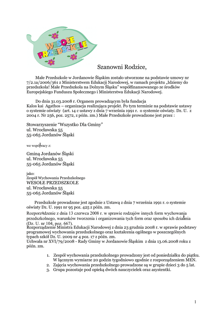 Szanowni Rodzice, Małe Przedszkole w Jordanowie Śląskim zostało utworzone na podstawie umowy nr 7/2.1a/2006/361 z Ministerstwem Edukacji Narodowej, w ramach projektu „Idziemy do przedszkola! Małe Przedszkola na Dolnym Śląsku” współfinansowanego ze środków Europejskiego Funduszu Społecznego i Ministerstwa Edukacji Narodowej. Do dnia 31.03.2008 r. Organem prowadzącym była fundacja Kalos kai Agathos – organizacja realizująca projekt. Po tym terminie na podstawie ustawy o systemie oświaty (art. 14 c ustawy z dnia 7 września 1991 r. o systemie oświaty. Dz. U. z 2004 r. Nr 256, poz. 2572, z późn. zm.) Małe Przedszkole prowadzone jest przez : Stowarzyszenie “Wszystko Dla Gminy” ul. Wrocławska 55 55-065 Jordanów Śląski ł we wspópracy z: Gminą Jordanów Śląski ul. Wrocławska 55 55-065 Jordanów Śląski jako: Zespół Wychowania Przedszkolnego WESOŁE PRZEDSZKOLE ul. Wrocławska 55 55-065 Jordanów Śląski Przedszkole prowadzone jest zgodnie z Ustawą z dnia 7 września 1991 r. o systemie oświaty Dz. U. 1991 nr 95 poz. 425 z późn. zm. Rozporządzenie z dnia 13 czerwca 2008 r. w sprawie rodzajów innych form wychowania ł przedszkolnego, warunków tworzenia i organizowania tych form oraz sposobu ich dziaania (Dz. U. nr 104, poz. 667). Rozporządzenie Ministra Edukacji Narodowej z dnia 23 grudnia 2008 r. w sprawie podstawy programowej wychowania przedszkolnego oraz kształcenia ogólnego w poszczególnych typach szkół Dz. U. 2009 nr 4 poz. 17 z późn. zm. Uchwała nr XVI/79/2008 - Rady Gminy w Jordanowie Śląskim z dnia 13.06.2008 roku z późn. zm. 1. Zespół wychowania przedszkolnego prowadzony jest od poniedziałku do piątku. W łącznym wymiarze 20 godzin tygodniowo zgodnie z rozporządzeniem MEN. 2. Zajęcia wychowania przedszkolnego prowadzone są w grupie dzieci 3 do 5 lat. 3. Grupa pozostaje pod opieką dwóch nauczycielek oraz asystentki. 1 4. Usługi świadczone w przedszkolu są odpłatne. 5. Odpłatność obejmuje koszty związane z opieką i wychowaniem dziecka w Przedszkolu i ustalana jest przez organ prowadzący Przedszkole. Opłata obejmuje cały rok kalendarzowy od września do sierpnia - włącznie. 6. Wszystkie dzieci uczęszczające do przedszkola podlegają obowiązkowemu ubezpieczeniu. Opłatę z tytułu ubezpieczenia dziecka uiszczają rodzice bądź prawni opiekunowie na początku roku szkolnego w miesiącu wrześniu. 7. Środki potrzebne na działalność przedszkola pochodzą: - ze składek wnoszonych przez rodziców- członków stowarzyszenia; - z udzielonej dotacji przez Gminę Jordanów Śląski, Rekrutacja: 1. Stowarzyszenie „Wszystko Dla Gminy” ogłasza nabór dzieci zamieszkujących na terenie gminy Jordanów Śląski. Informacje ogólnodostępne na tablicach ogłoszeń oraz na stronach internetowych www.jordanowslaski.pl , www.przedszkole.st-wdg.pl, 2. Rekrutacja dotyczy dzieci 3 i 4 -letnich. 3. Przyjmujemy dzieci do Zespołu wychowania Przedszkolnego zgodnie z Regulaminem rekrutacji na rok szkolny 2012/2013. Regulamin rekrutacji jest udostępniony do wglądu na terenie placówki . 4. Powołanie Komisji Kwalifikacyjnej ma miejsce tylko w przypadku większej liczby zgłoszeń niż miejsc w przedszkolu. Komisja Kwalifikacyjna wyłoni listę dzieci przyjętych do Wesołego Przedszkola na rok szkolny 2012/2013. 5. W przypadku, gdy liczba zgłoszeń jest nie większa niż liczba miejsc wszystkie dzieci zostają przyjęte. 6. Nabór dzieci do przedszkola prowadzi się każdego roku. Ważne daty naboru na rok szkolny 2012/2013 od 2 maja 2012 r. do 31 maja 2012 r. przedszkole wydaje i przyjmuje od rodziców wypełnione "Karty zgłoszenia dziecka" prowadząc ich ewidencję. Kartę zgłoszenia dziecka można pobrać w „Wesołym Przedszkolu” 31 maja 2012 r. Przedszkole kończy przyjmowanie „Kart zgłoszeń dzieci”. Powołanie Komisji Kwalifikacyjnej w przypadku większej liczby 08 czerwca 2012 r. zgłoszeń niż miejsc w przedszkolu. ogłoszenie wyników rekrutacji ( wywieszenie listy dzieci przyjętych) 11 czerwca 2012 r. Z poważaniem Zarząd Stowarzyszenia „Wszystko dla Gminy” 2