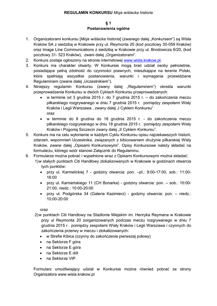 REGULAMIN KONKURSU Moja wiślacka historia §1 Postanowienia ogólne 1. 2. 3. 4. 5. 6. Organizatorami konkursu [Moja wiślacka historia] (zwanego dalej „Konkursem”) są Wisła Kraków SA z siedzibą w Krakowie przy ul. Reymonta 20 (kod pocztowy 30-059 Kraków) oraz Image Line Communications z siedzibą w Krakowie przy ul. Brodowicza 6/20, (kod pocztowy 31- 523 Kraków), zwani dalej „Organizatorami”. Konkurs zostaje ogłoszony na stronie internetowej www.wisla.krakow.pl. Konkurs ma charakter otwarty. W Konkursie mogą brać udział osoby pełnoletnie, posiadające pełną zdolność do czynności prawnych, mieszkające na terenie Polski, które spełniają wszystkie postanowienia, warunki i wymagania przewidziane Regulaminem (zwane dalej „Uczestnikiem”). Niniejszy regulamin Konkursu (zwany dalej „Regulaminem”) określa warunki przeprowadzenia Konkursu w dwóch Cyklach Konkursu przeprowadzanych: w terminie od 3 grudnia 2015 r. do 7 grudnia 2015 r. – do zakończenia meczu piłkarskiego rozgrywanego w dniu 7 grudnia 2015 r. pomiędzy zespołami Wisły Kraków i Legii Warszawa , zwany dalej „I Cyklem Konkursu” oraz w terminie do 8 grudnia do 18 grudnia 2015 r. - do zakończenia meczu piłkarskiego rozgrywanego w dniu 18 grudnia 2015 r. pomiędzy zespołami Wisły Kraków i Pogonią Szczecin zwany dalej „II Cyklem Konkursu”. Konkurs ma na celu wyłonienie w każdym Cyklu Konkursu opisu najciekawszych historii, zdarzeń, wspomnień Uczestnika, związanych z kibicowaniem drużynie piłkarskiej Wisły Kraków, zwane dalej „Opisami Konkursowymi”. Opisy Konkursowe należy składać na formularzu, którego wzór stanowi Załącznik do Regulaminu. Formularze można pobrać i wypełnione wraz z Opisami Konkursowymi można składać: 1) w stałych punktach Citi Handlowy zlokalizowanych w Krakowie w godzinach otwarcia tych punktów: przy ul. Karmelickiej 7 - godziny otwarcia: pon. –pt.: 9:00-17:00, sob.: 11:0016:00 przy ul. Kamieńskiego 11 (CH Bonarka) - godziny otwarcia: pon. – sob.: 10:0021:00, niedz.: 10:00-20:00 przy ul. Podgórska 34 (Galeria Kazimierz) - godziny otwarcia: pon. – niedz.: 10:00-20:00 oraz 2) w punktach Citi Handlowy na Stadionie Miejskim im. Henryka Reymana w Krakowie przy ul Reymonta 20 zorganizowanych podczas meczu rozgrywanego w dniu 7 grudnia 2015 r. pomiędzy zespołami Wisły Kraków i Legii Warszawa i czynnych do zakończenia przerwy w meczu i zlokalizowanych: w Strefie Kibica (czynny do zakończenia pierwszej połowy) na Sektorze F góra na Sektorze E góra na Sektorze E dół na Sektorze VIP. Formularz umożliwiający udział w Konkursie można również pobrać ze strony Organizatora www.wisla.krakow.pl 7. 8. 9. Autor najciekawszego Opisu Konkursowego zgłoszonego w danym Cyklu Konkursu otrzyma nagrodę : OFICJALNĄ KOSZULKĘ MECZOWĄ ARKADIUSZA GŁOWACKIEGO Z PODPISAMI CAŁEJ DRUŻYNY PIŁKARSKIEJ WISŁY KRAKÓW. Wisła Kraków zawiadomi o wyniku I Cyklu Konkursu w dniu 7.12.2015 r. oraz o wyniku II Cyklu Konkursu w dniu 21.12.2015r., telefonicznie na numer wskazany w formularzu przez Uczestnika. Odbiór nagród będzie możliwy w biurach spółki Wisła Kraków SA w Krakowie przy ul. Reymonta 20 w dniu ustalonym przez Organizatora oraz zwycięzcę poszczególnego cyklu konkursowego, po potwierdzeniu przez odbierającego zgodności danych wskazanych w formularzu zawierającym zwycięski Opis Konkursowy. Nagrody nieodebrane do dnia 31.12.2015r. zostaną przekazane na cele aukcji charytatywnych Fundacji Otwarte Ramię Białej Gwiazdy. §2 Warunki uczestnictwa w Konkursie 1. 2. 3. 4. 5. W Konkursie nie mogą brać udziału pracownicy Organizatorów, członkowie Komisji Konkursowej oraz ich najbliższe rodziny (małżonek, zstępni, wstępni oraz rodzeństwo). Każdy Uczestnik może złożyć dowolną liczbę opisów w każdym Cyklu Konkursu. Zabronione jest przekazywanie Opisów Konkursowych zawierających treści naruszające dobra osobiste osób trzecich, ich dane osobowe, sprzeczne z prawem lub dobrymi obyczajami, a w szczególności zawierającej wulgaryzmy, treści pornograficzne, zniesławiające, obrażające uczucia religijne, wzywające do nienawiści rasowej, etnicznej, wyznaniowej, oraz wszelkich innych zapisów, podobnych w treści i przekazie. Uczestnictwo w Konkursie jest bezpłatne i jest równoznaczne z akceptacją warunków Konkursu określonych w Regulaminie. Przystąpienie do Konkursu na zasadach wskazanych w Regulaminie, przez co rozumie się doręczenie Opisu Konkursowego Organizatorom, oznacza, że: 1) Uczestnik Konkursu potwierdza, że zapoznał się z Regulaminem, 2) osoby wymienione w Opisie Konkursowym nie będą zgłaszały żadnych roszczeń wobec Organizatorów Konkursu i Uczestnik ponosi z tego tytułu wyłączną odpowiedzialność, 3) Uczestnikowi Konkursu na datę doręczenia Opisu Konkursowego Organizatorowi przysługują prawa autorskie do Opisu Konkursowego, 4) Uczestnik Konkursu wyraża zgodę na nieodpłatne zbycie na rzecz Organizatorów majątkowych praw autorskich do Opisu Konkursowego na wszystkich następujących polach eksploatacji: utrwalania i zwielokrotniania jakąkolwiek techniką (w jakimkolwiek systemie, formacie i na jakimkolwiek nośniku), w tym m.in. drukiem, na kliszy fotograficznej, na taśmie magnetycznej, cyfrowo; wprowadzania do pamięci komputera, do sieci komputerowej i/lub multimedialnej, do baz danych; publicznego udostępniania w taki sposób, aby każdy mógł mieć do nich dostęp w miejscu i w czasie przez siebie wybranym (m.in. udostępnianie w internecie, np. w ramach dowolnych stron internetowych oraz serwisów nieodpłatnych), a także w ramach dowolnych usług telekomunikacyjnych z zastosowaniem jakichkolwiek systemów i urządzeń (m.in. telefonów stacjonarnych i/lub komórkowych, komputerów stacjonarnych i/lub przenośnych, a także przekazów z wykorzystaniem wszelkich dostępnych technologii np. GSM, UMTS itp., za pomocą telekomunikacyjnych sieci przesyłu danyc