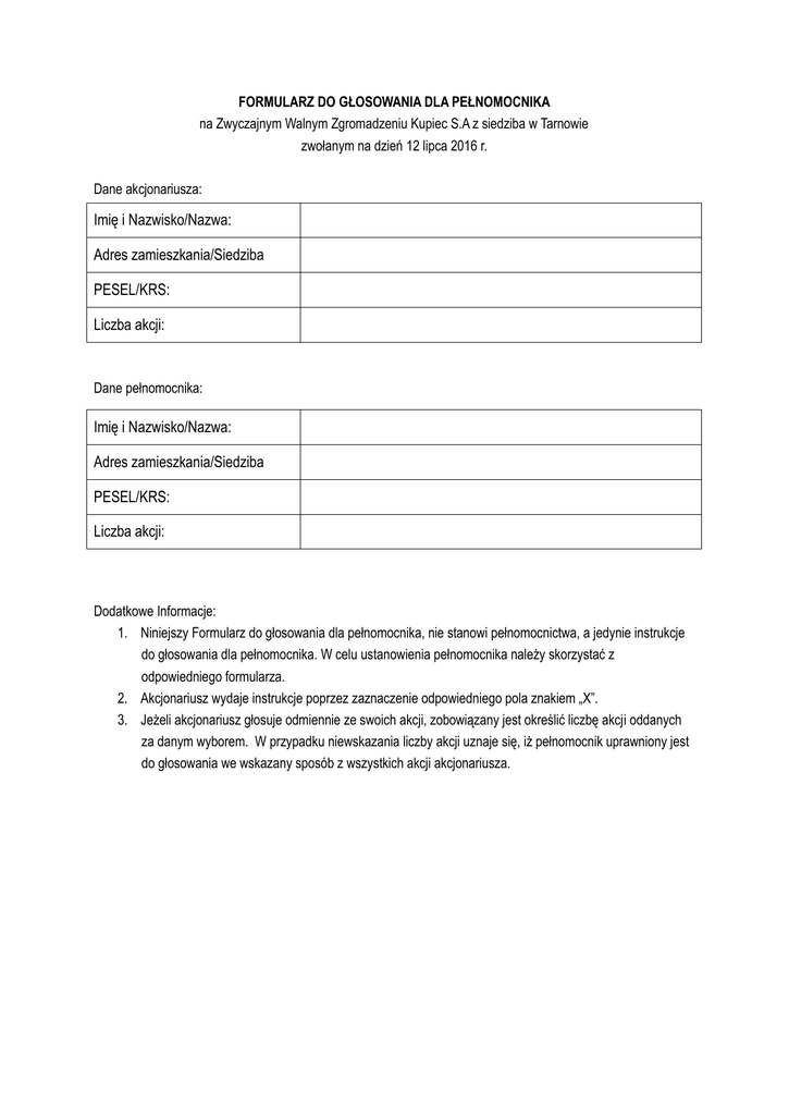 FORMULARZ DO GŁOSOWANIA DLA PEŁNOMOCNIKA na Zwyczajnym Walnym Zgromadzeniu Kupiec S.A z siedziba w Tarnowie zwołanym na dzień 12 lipca 2016 r. Dane akcjonariusza: Imię i Nazwisko/Nazwa: Adres zamieszkania/Siedziba PESEL/KRS: Liczba akcji: Dane pełnomocnika: Imię i Nazwisko/Nazwa: Adres zamieszkania/Siedziba PESEL/KRS: Liczba akcji: Dodatkowe Informacje: 1. Niniejszy Formularz do głosowania dla pełnomocnika, nie stanowi pełnomocnictwa, a jedynie instrukcje do głosowania dla pełnomocnika. W celu ustanowienia pełnomocnika należy skorzystać z odpowiedniego formularza. 2. Akcjonariusz wydaje instrukcje poprzez zaznaczenie odpowiedniego pola znakiem „X”. 3. Jeżeli akcjonariusz głosuje odmiennie ze swoich akcji, zobowiązany jest określić liczbę akcji oddanych za danym wyborem. W przypadku niewskazania liczby akcji uznaje się, iż pełnomocnik uprawniony jest do głosowania we wskazany sposób z wszystkich akcji akcjonariusza. Uchwała Nr 1 Zwyczajnego Walnego Zgromadzenia Kupiec S.A. z siedzibą w Tarnowie z dnia 12 lipca 2016 r. w sprawie wyboru Przewodniczącego Walnego Zgromadzenia Zwyczajne Walne Zgromadzenie Kupiec S.A z siedzibą w Tarnowie, uchwala co następuje: §1 Wybiera się na Przewodniczącego Zwyczajnego Walnego Zgromadzenia __________________. §2 Uchwała wchodzi w życie z momentem jej podjęcia. Za Przeciw Wstrzymuje się Głos Liczba akcji Sprzeciw Treść sprzeciwu: Uchwała Nr 2 Zwyczajnego Walnego Zgromadzenia Kupiec S.A. z siedzibą w Tarnowie z dnia 12 lipca 2016 r. w sprawie wyboru Komisji Skrutacyjnej Zwyczajne Walne Zgromadzenie Kupiec S.A z siedzibą w Tarnowie („Spółka”), uchwala co następuje: §1 Postanawia się wybrać następujących członków do składu Komisji Skrutacyjnej: 1) __________________________ 2) __________________________ 3) __________________________ §2 Uchwała wchodzi w życie z momentem jej podjęcia. Za Przeciw Wstrzymuje się Głos Liczba akcji Sprzeciw Treść sprzeciwu: Uchwała Nr 3 Zwyczajnego Walnego Zgromadzenia Kupiec S.A. z siedzibą w Tarnowie z dnia 12 lipca 2016 r. w sprawie zatwierdzenia porządku obrad §1 Zwyczajne Walne Zgromadzenie Kupiec S.A z siedzibą w Tarnowie („Spółka”), zatwierdza niniejszym poniższy porządek obrad: 1. 2. 3. 4. 5. 6. 7. 8. Otwarcie Zgromadzenia. Wybór Przewodniczącego Walnego Zgromadzenia Akcjonariuszy. Stwierdzenie przez Przewodniczącego prawidłowości zwołania Zgromadzenia oraz jego zdolności do podejmowania uchwał. Wybór komisji skrutacyjnej. Przyjęcie porządku obrad. Przedstawienie i rozpatrzenie sprawozdania finansowego za ubiegły rok obrotowy i sprawozdania Zarządu z działalności Spółki w ubiegłym roku obrotowym oraz wniosku Zarządu co do podziału zysku Spółki za ubiegły rok obrotowy. Przedstawienie i rozpatrzenie sprawozdania Rady Nadzorczej obejmującego działalność Rady Nadzorczej w ubiegłam roku obrotowym, ocen sprawozdania finansowego (wraz z opinią biegłych rewidentów) i sprawozdania Zarządu z działalności Spółki w ubiegłym roku obrotowym oraz wniosku Zarządu co do podziału zysku Spółki za ubiegły rok obrotowy. Podjęcie uchwały w sprawie zatwierdzenia sprawozdania finansowego Spółki za ubiegły rok obrotowy. 9. Podjęcie uchwały w sprawie zatwierdzenia sprawozdania Zarządu z działalności Spółki za ubiegły rok obrotowy. 10. Podjęcie uchwały w sprawie podziału zysku za ubiegły rok obrotowy. 11. Podjęcie uchwały w sprawie udzielenia Prezesowi Zarządu Spółki absolutorium z wykonania przez niego obowiązków w ubiegłym roku obrotowym. 12. Podjęcie uchwał w sprawie udzielenia członkom Rady Nadzorczej Spółki absolutorium z wykonania przez nich obowiązków w ubiegłym roku obrotowym. 13. Podjęcie uchwały w sprawie zmiany §6 Statutu Spółki. 14. Podjęcie uchwały w sprawie upoważnienia Rady Nadzorczej do ustalenia tekstu jednolitego Statutu Spółki. 15. Wolne wnioski. 16. Zakończenie obrad. §2 Uchwała wchodzi w życie z chwilą podjęcia. Za Przeciw Wstrzymuje się Głos Liczba akcji Sprzeciw Treść sprzeciwu: Uchwała nr 4 Zwyczajnego Walnego Zgromadzenia Kupiec S.A. z siedzibą w Tarnowie z dnia 12 lipca 2016 r. w sprawie zatwierdzenia sprawozdania finansowego Spółki za ubiegły rok obrotowy Zwyczajne Walne Zgromadzenie Kupiec S.A z siedzibą w Tarnowie, uchwala co następuje: 1. Zwyczajne Walne Zgromadzenie Spółki Kupiec S.A., na podstawie art. 395 § 1 i § 2 pkt 1) w zw. z art. 393 pkt 1) kodeksu spółek handlowych oraz § 19 ust. 1 lit. a) statutu Spółki, zatwierdza sprawozdanie finansowe spółki Kupiec S.A. z siedzibą w Tarnowie za rok obrotowy 2015, obejmujący okres od dnia 01.01.2015 roku do dnia 31.12.2015 roku. 2. Uchwała wchodzi w życie z dniem podjęcia. Za Przeciw Wstrzymuje się Głos Liczba akcji Sprzeciw Treść sprzeciwu: Uchwała nr 5 Zwyczajnego Walnego Zgromadzenia Kupiec S.A. z siedzibą w Tarnowie z dnia 12 lipca 2016 r. w sprawie zatwierdzenia sprawozdania Zarządu z działalności Spółki za ubiegły rok obrotowy Zwyczajne Walne Zgromadzenie Kupiec S.A z siedzibą w Tarnowie, uchwala co następuje: 1. Zwyczajne Walne Zgromadzenie Spółki Kupiec S.A. na podstawie art. 395 § 1 i § 2 pkt 1) w zw. z art. 393 pkt 1) kodeksu spółek handlowych oraz § 19 ust. 1 lit. a) statutu Spółki, zatwierdza sprawozdanie Zarządu z działalności spółki Kupiec S.A. z siedzibą w Tarnowie za rok obrotowy 2015, obejmujący okres od dnia 01.01.2015 roku do dnia 31.12.2015 roku. 2. Uchwała wchodzi w życie z dniem podjęcia. Za Przeciw Wstrzymuje się Głos Liczba akcji Sprzeciw Treść sprzeciwu: Uchwała nr 6 Zwyczajnego Walnego Zgromadzenia Kupiec S.A. z siedzibą w Tarnowie z dnia 12 lipca 2016 r. w sprawie podziału zysku za ubiegły rok obrotowy. Zwyczajne Walne Zgromadzenie Kupiec S.A z siedzibą w Tarnowie, uchwala co następuje: 1. Zwyczajne Walne Zgromadzenie Spółki Kupiec S.A., na podstawie art. 395 § 1 i § 2 pkt 2) kodeksu spółek handlowych 