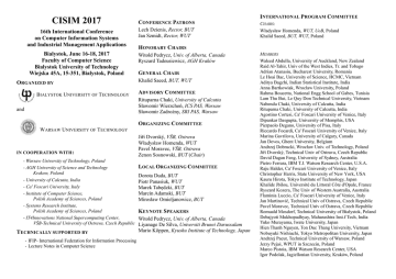CISIM 2017 16th International Conference on Computer Information Systems and Industrial Management Applications Bialystok, June 16-18, 2017 Faculty of Computer Science Bialystok University of Technology Wiejska 45A, 15-351, Bialystok, Poland ORGANIZED BY BIALYSTOK UNIVERSITY OF T ECHNOLOGY INTERNATIONAL PROGRAM COMMITTEE CONFERENCE PATRONS Lech Dzienis, Rector, BUT Jan Szmidt, Rector, WUT HONORARY CHAIRS Witold Pedrycz, Univ. of Alberta, Canada Ryszard Tadeusiewicz, AGH Kraków GENERAL CHAIR Khalid Saeed, BUT, WUT ADVISORY COMMITTEE Rituparna Chaki, University of Calcutta Sławomir Wierzchoń, ICS PAS, Warsaw Sławomir Zadrożny, SRI PAS, Warsaw and ORGANIZING COMMITTEE WARSAW UNIVERSITY OF T ECHNOLOGY IN COOPERATION WITH : - Warsaw University of Technology, Poland - AGH University of Science and Technology Krakow, Poland - University of Calcutta, India - Ca' Foscari University, Italy - Institute of Computer Science, Polish Academy of Sciences, Poland - Systems Research Institute, Polish Academy of Sciences, Poland - IT4Innovations National Supercomputing Center, VŠB-Technical University of Ostrava, Czech Republic TECHNICALLY SUPPORTED BY - IFIP- International Federation for Information Processing - Lecture Notes in Computer Science CHAIRS: Władysław Homenda, WUT, UoB, Poland Khalid Saeed, BUT, WUT, Poland Jiří Dvorský, VŠB, Ostrava Władysław Homenda, WUT Pavel Moravec, VŠB, Ostrava Zenon Sosnowski, BUT (Chair) LOCAL ORGANIZING COMMITTEE Dorota Duda, BUT Piotr Panasiuk, WUT Marek Tabędzki, BUT Marcin Adamski, BUT Mirosław Omieljanowicz, BUT KEYNOTE SPEAKERS Witold Pedrycz, Univ. of Alberta, Canada Liyanage De Silva, Universiti Brunei Darussalam Mario Köppen, Kyushu Institute of Technology, Japan MEMBERS Waleed Abdulla, University of Auckland, New Zealand Raid Al-Tahir, Univ of the West Indies, Tr. and Tobago Adrian Atanasiu, Bucharest University, Romania Le Hoai Bac, University of Science, HCMC, Vietnam Aditya Bagchi, Indian Statistical Institute, India Anna Bartkowiak, Wrocław University, Poland Rahma Boucetta, National Engg School of Gabes, Tunisia Lam Thu Bui, Le Quy Don Technical University, Vietnam Nabendu Chaki, University of Calcutta, India Rituparna Chaki, University of Calcutta, India Agostino Cortesi, Ca' Foscari University of Venice, Italy Dipankar Dasgupta, University of Memphis, USA Pierpaolo Degano, University of Pisa, Italy Riccardo Focardi, Ca' Foscari University of Venice, Italy Marina Gavrilova, University of Calgary, Canada Jan Devos, Ghent University, Belgium Andrzej Dobrucki, Wrocław Univ. of Technology, Poland Jiří Dvorský, Technical Univ of Ostrava, Czech Republic David Dagan Feng, University of Sydney, Australia Pietro Ferrara, IBM T.J. Watson Research Center, U.S.A. Raju Halder, Ca' Foscari University of Venice, Italy Christopher Harris, State University of New York, USA Kauru Hirota, Tokyo Institute of Technology, Japan Khalide Jbilou, Université du Littoral Côte d'Opale, France Ryszard Kozera, The Univ of Western Australia, Australia Flaminia Luccio, Ca' Foscari University of Venice, Italy Jan Martinovič, Technical Univ of Ostrava, Czech Republic Pavel Moravec, Technical Univ of Ostrava, Czech Republic Romuald Mosdorf, Technical University of Białystok, Poland Debajyoti Mukhopadhyay, Maharashtra Inst.f Tech, India Yuko Murayama, Iwate University, Japan Hien Thanh Nguyen, Ton Duc Thang University, Vietnam Nobuyuki Nishiuchi, Tokyo Metropolitan University, Japan Andrzej Pacut, Technical University of Warsaw, Poland Jerzy Pejaś, WPUT in Szczecin, Poland Marco Pistoia, IBM Watson Research Center, USA Igor Podolak, Jagiellonian University, Kraków, Poland Jaroslav Pokorný, Charles University, Czech Republic Piotr Porwik, University of Silesia, Poland Jan Preis-Heje, Ghent University, Denmark Tho Thanh Quan, Ho Chi Minh Univ of Technology, Vietnam Isabel Ramos, University of Minho, Portugal Anirban Sarkar, NIT, Durgapore Ewa Skubalska-Rafajłowicz, Wrocław Univ of Tech, Poland Kateřina Slaninova, Tec. Univ of Ostrava, Czech Republic Krzysztof Ślot, Lodz University of Technology, Poland Vaclav Snaśel, Technical Univ of Ostrava, Czech Republic Zenon Sosnowski, Bialystok Univ of Tech, Poland Jaroslaw Stepaniuk, Bialystok Univ of Tech, Poland Marcin Szpyrka, AGH Univ. of Sc and Tech, Kraków, Poland Jacek Tabor, Jagiellonian University, Kraków, Poland Andrea Torsello, Ca' Foscari University of Venice, Italy Dao Trong Tran, Ton Duc Thang University, Vietnam Nitin Upadhyay, BITS Pilani, India Bay Dinh Vo, Ton Duc Thang University, Vietnam Qiang Wei, Tsinghua University, Beijing, China Sławomir Wierzchoń, Polish Academy of Sc, Warsaw, Poland Michał Woźniak, Wroclaw University of Technology, Poland Sławomir Zadrożny, Polish Academy of Sciences, Poland Ivan Zelinka, Technical Univ of Ostrava, Czech Republic PURPOSE OF CONFERENCE This conference aims to bring many important research streams together. Computer Information Systems and their applications in Image Analysis and Processing, Biometrics in both behavioral and physiological categories comprise researches in Information Processing Systems and Human Identification and Recognition Techniques. Therefore, researchers are encouraged to submit their contributions in both theoretical and practical aspects of the following Topics. TOPICS The topics of the conference include the following scientific research areas of Computer Science. - Biometrics Security and Multi-media Preprocessing Methods, Feature Extraction, Face Description and Identification, Retinal and Iris, Tongue, DNA and EEG Biometrics, Multi-modal Biometric Methods, Medical Analysis, Border Control, Biometric Cryptosystems, Fingerprints, Hand Palm and Hand Geometry, Speech and Speaker Verification and all other topics on Human Description, Classification, Identification and Recognition; Kansei Engineering, Affective Systems and Human Emotion Measuring Techniques - Computer Information Systems Signal & Image Analysis and Processing
