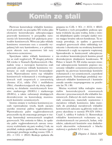 nr 6/72013 ABC Magazynu Instalatora Komin ze stali www.instalator.pl propanu to: C3H8 + 5O2 -> 3CO2 + 4H2O. W każdym z tych przypadków podczas spalania wydziela się para wodna, która z innymi składnikami spalin (związki siarki) tworzy mający kwaśny odczyn kondensat. Ta sytuacja powoduje, że spaliny z gazowych urządzeń grzewczych silnie oddziałują termicznie i chemicznie na strukturę kominów wykonanych z cegły na zaprawie wapiennej. Spowodowało to konieczność zabezpieczania struktur konstrukcyjnych komina przed destrukcyjnym działaniem kondensatu. W Polsce w latach 70. XX wieku zaczęto stosować zabezpieczenie kominów poprzez stosowanie wkładów cementowo-azbestowych, pojawiły się pierwsze konstrukcje kominów wykonanych z rur ceramicznych, częstokroć glazurowanych. Technologia produkcji metalowych wkładów kominowych i kominów została szeroko rozpropagowana na przełomie lat 70. i 80. Można wyróżnić kilka rodzajów materiałów konstrukcyjnych stosowanych obecnie i przeznaczonych dla wkładów kominowych. Zaliczyć do nich można: materiały ceramiczne, materiały szamotowe i metalowe wkłady kominowe. Jako materiały do produkcji metalowych wkładów kominowych zalecane są głównie stale stopowe określone w normie PN-EN 1856-1 Część 1, tablica 4 (tabela 1). Konstrukcje wkładów kominowych wykonane są z cienkościennych rur prostych, kolan, trójników, zakończeń kominów oraz dodatkowych akcesoriów wykonanych z blachy stalowej o grubości 0,5-1 mm. Zbigniew A. Tałach, SKP 15 ABC odprowadzania spalin Pierwsze konstrukcje wkładów kominowych powstały na początku XX wieku jako elementy konstrukcyjne zabezpieczające przewody kominowe w przypadku naruszenia ich konstrukcji lub pęknięcia przewodów kominowych. Wówczas jako wkłady kominowe stosowano rury z ceramiki wypalanej lub rury kamionkowe, a w późniejszym okresie rury szamotowe lub rury azbestowo-cementowe. Spotykano także wkłady kominowe z rur ze stali węglowych. W drugiej połowie XX wieku w Stanach Zjednoczonych i Kanadzie wraz z rozwojem hutnictwa stali powstały pierwsze wkłady kominowe wykonane ze stali stopowych kwasoodpornych. Wprowadzono nowy typ wkładów kominowych wykonanych z wysokogatunkowych stali stopowych z zawartością chromu (Cr), niklu (Ni) i molibdenu (Mo), charakteryzujących się dużą odpornością na działanie rozcieńczonych kwasów: siarkawego (H2SO3) i siarkowego (H2SO4), a także substancji działających destruktywnie na konstrukcję murowanych kominów ceramicznych. Istotne zmiany w technice kominowej zostały wprowadzone wtedy, kiedy zaczęto szeroko stosować paliwa węglowodorowe. Wprowadzenie paliw węglowodorowych przyczyniło się do znacznego postępu w rozwoju konstrukcji nowoczesnych urządzeń grzewczych. Nie zmienia to faktu, że spalaniu paliw węglowodorowych zawsze towarzyszy wydzielanie się pary wodnej. I tak, na przykład, reakcja spalania dla metanu (gazu ziemnego) przebiega według wzoru: CH4 + 2O2 -> CO2 + 2H2O. Reakcja spalania dla