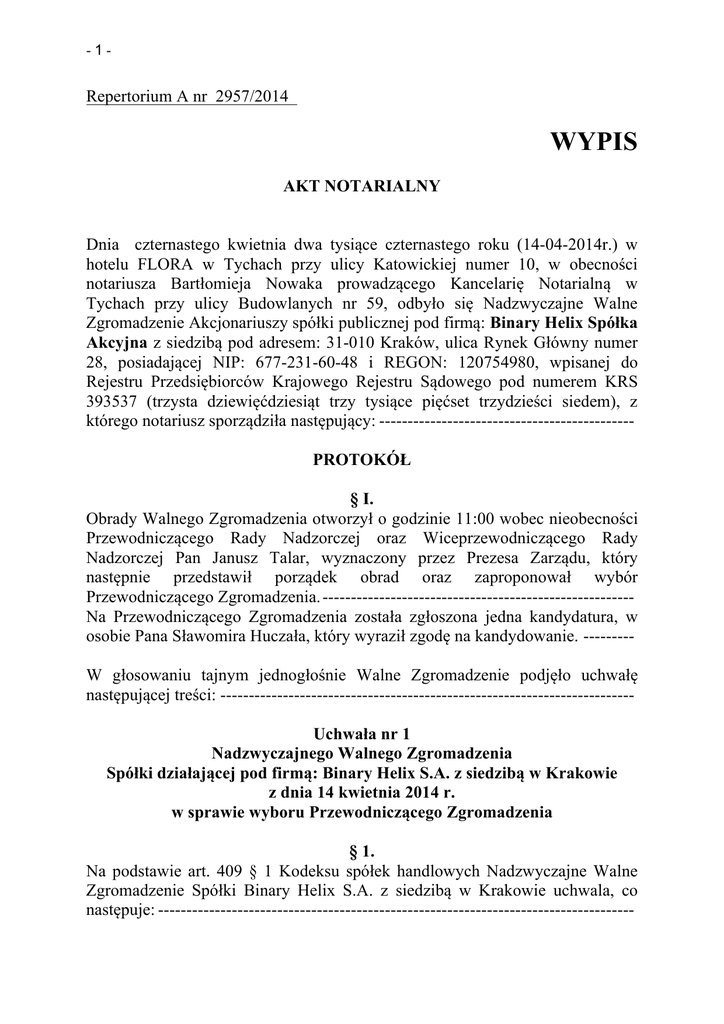-1- Repertorium A nr 2957/2014 WYPIS AKT NOTARIALNY Dnia czternastego kwietnia dwa tysiące czternastego roku (14-04-2014r.) w hotelu FLORA w Tychach przy ulicy Katowickiej numer 10, w obecności notariusza Bartłomieja Nowaka prowadzącego Kancelarię Notarialną w Tychach przy ulicy Budowlanych nr 59, odbyło się Nadzwyczajne Walne Zgromadzenie Akcjonariuszy spółki publicznej pod firmą: Binary Helix Spółka Akcyjna z siedzibą pod adresem: 31-010 Kraków, ulica Rynek Główny numer 28, posiadającej NIP: 677-231-60-48 i REGON: 120754980, wpisanej do Rejestru Przedsiębiorców Krajowego Rejestru Sądowego pod numerem KRS 393537 (trzysta dziewięćdziesiąt trzy tysiące pięćset trzydzieści siedem), z którego notariusz sporządziła następujący: --------------------------------------------PROTOKÓŁ § I. Obrady Walnego Zgromadzenia otworzył o godzinie 11:00 wobec nieobecności Przewodniczącego Rady Nadzorczej oraz Wiceprzewodniczącego Rady Nadzorczej Pan Janusz Talar, wyznaczony przez Prezesa Zarządu, który następnie przedstawił porządek obrad oraz zaproponował wybór Przewodniczącego Zgromadzenia. ------------------------------------------------------Na Przewodniczącego Zgromadzenia została zgłoszona jedna kandydatura, w osobie Pana Sławomira Huczała, który wyraził zgodę na kandydowanie. --------W głosowaniu tajnym jednogłośnie Walne Zgromadzenie podjęło uchwałę następującej treści: ------------------------------------------------------------------------Uchwała nr 1 Nadzwyczajnego Walnego Zgromadzenia Spółki działającej pod firmą: Binary Helix S.A. z siedzibą w Krakowie z dnia 14 kwietnia 2014 r. w sprawie wyboru Przewodniczącego Zgromadzenia § 1. Na podstawie art. 409 § 1 Kodeksu spółek handlowych Nadzwyczajne Walne Zgromadzenie Spółki Binary Helix S.A. z siedzibą w Krakowie uchwala, co następuje: ------------------------------------------------------------------------------------ -2- „Nadzwyczajne Walne Zgromadzenie Spółki pod firmą: Binary Helix S.A. z siedzibą w Krakowie wybiera na Przewodniczącego Nadzwyczajnego Walnego Zgromadzenia Pana Sławomira Huczała.” ---------------------------------------------§ 2. Uchwała wchodzi w życie z dniem jej podjęcia. --------------------------------------Otwierający Zgromadzenie stwierdził, że w głosowaniu tajnym oddano 2933000 (dwa miliony dziewięćset trzydzieści trzy tysiące) ważnych głosów z 2933000 (dwa miliony dziewięćset trzydzieści trzy tysiące) akcji stanowiących 86,87 % (osiemdziesiąt sześć i osiemdziesiąt siedem setnych procenta) kapitału zakładowego, łączna liczba ważnych głosów wynosiła 2933000. Za uchwałą głosowało: za: 2933000, przeciw: 0 (zero), wstrzymało się: 0 (zero). Nie zgłoszono sprzeciwu. ---------------------------------------------------------------------Przewodniczący Walnego Zgromadzenia Pan Sławomir Huczała, syn ………… i …………., posiadający PESEL: ………………, zamieszkały pod adresem: …………………….., ul. ………………….., którego tożsamość notariusz ustalił na podstawie dowodu osobistego ……………… - stwierdził, że: -----------------A/ Zgromadzenie zostało zwołane w trybie art. 4021 Kodeksu spółek handlowych, --------------------------------------------------------------------------------B/ wszystkie formalności wynikające z art. 4022 i 3 Kodeksu spółek handlowych zostały spełnione, ----------------------------------------------------------C/ wykaz Akcjonariuszy uprawnionych do udziału w Nadzwyczajnym Walnym Zgromadzeniu stanowi załącznik numer 1 (jeden) do niniejszego protokołu, ----D/ w Zgromadzeniu uczestniczy jeden Akcjonariusz oraz pełnomocnik Akcjonariusza prawidłowo umocowany, dysponujący 2933000 akcjami o liczbie głosów 2933000, na ogólną liczbę 3376321 (trzy miliony trzysta siedemdziesiąt sześć tysięcy trzysta dwadzieścia jeden) akcji, o łącznej liczbie 3376321 (trzy miliony trzysta siedemdziesiąt sześć tysięcy trzysta dwadzieścia jeden) głosów, co stanowi 86,87% kapitału zakładowego, zgodnie z załączoną listą obecności, E/ pełnomocnik Akcjonariusza uczestniczyć będzie w głosowaniach na podstawie pisemnej instrukcji głosowania udzielonej przez Akcjonariusza, którego reprezentuje, ----------------------------------------------------------------------F/ porządek obrad obejmuje następujące punkty:-------------------------------------Nadzwyczajne Walne Zgromadzenie zatwierdza następujący porządek obrad: --1. otwarcie Zgromadzenia, ---------------------------------------------------------------2. wybór przewodniczącego, -------------------------------------------------------------3. odstąpienie od wyboru komisji skrutacyjnej, ---------------------------------------4. stwierdzenie prawidłowości zwołania Walnego Zgromadzenia oraz jego zdolności do podejmowania uchwał, ------------------------------------------------5. przyjęcie porządku obrad, -------------------------------------------------------------- -3- 6. podjęcie uchwał w przedmiocie: -----------------------------------------------------a. powołanie członków Rady Nadzorczej ----------------------------------------------7. wolne wnioski, --------------------------------------------------------------------------8. zamknięcie Zgromadzenia ------------------------------------------------------------a zatem Zgromadzenie zostało prawidłowo zwołane oraz jest władne do powzięcia wiążących uchwał w zakresie przedstawionego porządku obrad. -----W głosowaniu jawnym jednogłośnie Walne Zgromadzenie podjęło uchwałę następującej treści: ------------------------------------------------------------------------Uchwała nr 2 Nadzwyczajnego Walnego Zgromadzenia Spółki działającej pod firmą: Binary Helix S.A. z siedzibą w Krakowie z dnia 14 kwietnia 2014 r. w sprawie odstąpienia od wyboru komisji skrutacyjnej § 1. Nadzwycz
