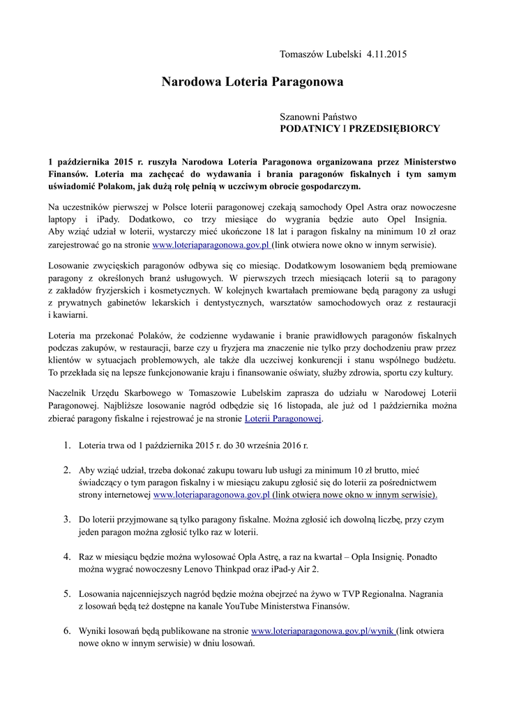 Tomaszów Lubelski 4.11.2015 Narodowa Loteria Paragonowa Szanowni Państwo PODATNICY I PRZEDSIĘBIORCY 1 października 2015 r. ruszyła Narodowa Loteria Paragonowa organizowana przez Ministerstwo Finansów. Loteria ma zachęcać do wydawania i brania paragonów fiskalnych i tym samym uświadomić Polakom, jak dużą rolę pełnią w uczciwym obrocie gospodarczym. Na uczestników pierwszej w Polsce loterii paragonowej czekają samochody Opel Astra oraz nowoczesne laptopy i iPady. Dodatkowo, co trzy miesiące do wygrania będzie auto Opel Insignia. Aby wziąć udział w loterii, wystarczy mieć ukończone 18 lat i paragon fiskalny na minimum 10 zł oraz zarejestrować go na stronie www.loteriaparagonowa.gov.pl (link otwiera nowe okno w innym serwisie). Losowanie zwycięskich paragonów odbywa się co miesiąc. Dodatkowym losowaniem będą premiowane paragony z określonych branż usługowych. W pierwszych trzech miesiącach loterii są to paragony z zakładów fryzjerskich i kosmetycznych. W kolejnych kwartałach premiowane będą paragony za usługi z prywatnych gabinetów lekarskich i dentystycznych, warsztatów samochodowych oraz z restauracji i kawiarni. Loteria ma przekonać Polaków, że codzienne wydawanie i branie prawidłowych paragonów fiskalnych podczas zakupów, w restauracji, barze czy u fryzjera ma znaczenie nie tylko przy dochodzeniu praw przez klientów w sytuacjach problemowych, ale także dla uczciwej konkurencji i stanu wspólnego budżetu. To przekłada się na lepsze funkcjonowanie kraju i finansowanie oświaty, służby zdrowia, sportu czy kultury. Naczelnik Urzędu Skarbowego w Tomaszowie Lubelskim zaprasza do udziału w Narodowej Loterii Paragonowej. Najbliższe losowanie nagród odbędzie się 16 listopada, ale już od 1 października można zbierać paragony fiskalne i rejestrować je na stronie Loterii Paragonowej. 1. Loteria trwa od 1 października 2015 r. do 30 września 2016 r. 2. Aby wziąć udział, trzeba dokonać zakupu towaru lub usługi za minimum 10 zł brutto, mieć świadczący o tym paragon fiskalny i w miesiącu zakupu zgłosić się do loterii za pośrednictwem strony internetowej www.loteriaparagonowa.gov.pl (link otwiera nowe okno w innym serwisie). 3. Do loterii przyjmowane są tylko paragony fiskalne. Można zgłosić ich dowolną liczbę, przy czym jeden paragon można zgłosić tylko raz w loterii. 4. Raz w miesiącu będzie można wylosować Opla Astrę, a raz na kwartał – Opla Insignię. Ponadto można wygrać nowoczesny Lenovo Thinkpad oraz iPad-y Air 2. 5. Losowania najcenniejszych nagród będzie można obejrzeć na żywo w TVP Regionalna. Nagrania z losowań będą też dostępne na kanale YouTube Ministerstwa Finansów. 6. Wyniki losowań będą publikowane na stronie www.loteriaparagonowa.gov.pl/wynik (link otwiera nowe okno w innym serwisie) w dniu losowań. 7. Zwycięzcy losowań nie mogą wymieniać nagród na inne ani otrzymać jej wartości w gotówce. 8. Wszystkie nagrody w Narodowej Loterii Paragonowej są zwolnione z podatku! 9. W loterii nie mogą brać udziału pracownicy Ministerstwa Finansów i organizatora loterii oraz członkowie ich najbliższej rodziny. Wszystkie informacje o Loterii dostępne są na stronie: www.loteriaparagonowa.gov.pl (link otwiera nowe okno w innym serwisie). Jednocześnie Naczelnik Urzędu Skarbowego w Tomaszowie Lubelskim informuje, że w ramach współpracy z organizacjami przedsiębiorców i przedsiębiorcami Ministerstwo Finansów organizuje akcje: 1. Akcja banerowa „Jestem partnerem Loterii Paragonowej – wystawiam Paragony, wspieram Gospodarkę”. Na stronie Loterii znajdziecie Państwo stosowne banery dla przedsiębiorców do pobrania i umieszczenia na ich stronach internetowych. W zamian za pobranie baneru i wsparcie Loterii, zostanie przedsiębiorcą zaproponowane umieszczenie ich logotypu na stronie www Loterii. 2. Ambasador Uczciwej Konkurencji – wśród przedsiębiorców biorących udział w promocji Loterii Ministerstwo Finansów wybierze tych najbardziej aktywnych i zaangażowanych i nagrodzi ich tytułem Ambasadora Uczciwej Konkurencji. 3. Akcja naklejkowa dla przedsiębiorców z MSP. Przedsiębiorcy, którzy zdecydują się na wsparcie akcji, otrzymają naklejkę, którą będą mogli przykleić w dowolnie wybranym, widocznym dla klientów miejscu w siedzibie swojej firmy i promować Loterie Paragonową. z poważaniem Zbigniew Czubek Naczelnik Urzędu Skarbowego w Tomaszowie Lubelskim
