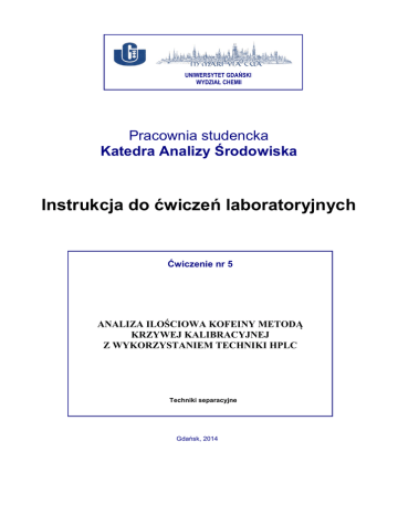 UNIWERSYTET GDAŃSKI WYDZIAŁ CHEMII Pracownia studencka Katedra Analizy Środowiska Instrukcja do ćwiczeń laboratoryjnych Ćwiczenie nr 5 ANALIZA ILOŚCIOWA KOFEINY METODĄ KRZYWEJ KALIBRACYJNEJ Z WYKORZYSTANIEM TECHNIKI HPLC Techniki separacyjne Gdańsk, 2014 Analiza ilościowa kofeiny metodą krzywej kalibracyjnej z wykorzystaniem techniki HPLC 2 1. Wprowadzenie Kofeina (3,7-dihydro-1,3,7-trimetylo-1H-puryno-2,6-dion) znana również pod nazwą 1,3,7trimetyloksantyna jest związkiem chemicznym o masie molowej 194,19 g/mol. W stanie czystym tworzy białe, długie, giętkie kryształy o temperaturze topnienia 237°C i o gęstości 1,2 g/cm³. Rozpuszcza się w gorącej wodzie, chloroformie i benzenie. Jest gorzka w smaku. W budowie jest zbliżona do dwóch innych alkaloidów purynowych: teobrominy i teofiliny. Kofeina zbudowana jest z dwóch pierścieni: pierwszym sześciowęglowym, drugim natomiast pieciowęglowym, w których po dwa atomy węgla zastąpione zostały atomami azotu. Każdy atom azotu w pierścieniu sześciowęglowym połączony jest wiązaniem pojedynczym z grupą metylową – CH3, pozostałe wolne atomy węgla połączone są wiązaniem podwójnym z atomem tlenu. W drugim pierścieniu natomiast tylko jeden z atomów azotu połączony jest wiązaniem pojedynczym z grupą metylową – CH3. Kofeina jest alkaloidem czyli związkiem organicznym pochodzenia roślinnego, zawierającym układ cykliczny z atomami azotu w pierścieniu. Alkaloidy wykazują silne działanie fizjologiczne na organizm człowieka, niejednokrotnie toksyczne. Kofeina do krwi dostaje się z przewodu pokarmowego. Jest wchłaniana już po około 30 - 45 minutach po jej spożyciu. Czas utrzymywania się jej we krwi to w przybliżeniu 4 godziny. W zależności od organizmu może się on wahać od 2 do 10 godzin. Kofeina jest stymulatorem centralnego układu nerwowego, łatwo przenika z krwi do mózgu, a tam ze względu na swoje znaczne podobieństwo w budowie do adenozyny wiąże się z receptorami adenozynowymi i blokuje je. Adenozyna jest substancją naturalnie występującą w organizmie człowieka, która pośredniczy w aktywności mózgu, wpływając na stan snu i czuwania. W konsekwencji podnosi się aktywność dopaminy. Dopamina jest to neuroprzekaźnik, który odpowiada ze większość efektów kawy takich jak poprawę koncentracji, zmniejszenie uczucia senności. Blokowanie receptorów adenozynowych może również wpłynąć na kurczenie się naczyń krwionośnych, co oddziałuje na napięcie naczyń znajdujących się w mózgu, a tym samym zmniejszyć objawy migreny oraz bólów głowy innego pochodzenia. Te właściwości kofeiny wykorzystane zostały przez producentów leków, którzy stosują ja jako istotny składnik leków przeciwbólowych. Spożywanie kofeiny może spowodować ogólne polepszenie koordynacji organizmu oraz poprawienie koncentracji. Jednakże zbyt duża Analiza ilościowa kofeiny metodą krzywej kalibracyjnej z wykorzystaniem techniki HPLC 3 dawka kofeiny może mieć negatywny wpływ na funkcjonowanie organizmu powodując uczucie zmęczenia lub zaburzenia koordynacji ruchowej. Dawki powyżej 2000 mg mogą również powodować bezsenność, drżenie mięśni lub przyśpieszenie oddechu. Częste picie napojów, których składnikiem jest kofeina może także przyczynić się do podniesienia się ciśnienia tętniczego krwi, a tym samym przyśpieszenia bicia serca, gdyż powoduje ona uwalnianie się kortyzolu i adrenaliny, które są odpowiedzialne za występowanie takich efektów. Kofeina również posiada właściwości moczopędne, powoduje zwiększenie wydzielania kwasu żołądkowego oraz prowadzi do przyśpieszenia metabolizmu. Kofeina jest głównym alkaloidem nasion krzewu kawowego Coffea arabica. Występuje także w innych roślinach z rodzin Theacei Sterculiaceae. Kofeina znajduje się również w liściach herbaty (teina). Źródłami kofeiny są rośliny z rodziny Marzanowatych (Rubiaceceae), miedzy innymi przedstawiciel flory polskiej przytulia (Galium) czy chinowiec (Cinchona), oraz rodziny Theacei Sterauliaceae. Znaczne ilości kofeiny znaleźć możemy również w guaranie (Pasta Guarana), liściach mate (Herba mate) oraz w nasionach kawowca (Theabroma caco L.). Prawa absorpcji Promieniowanie elektromagnetyczne, przechodząc przez roztwór, może ulegać: absorpcji, odbiciu i rozproszeniu. Natężenie wiązki padającej wyraża się wzorem: Io = Ia + It + Ir gdzie: Ia - natężenie promieniowania zaabsorbowanego przez roztwór, It - natężenie promieniowania przechodzącego przez roztwór, Ir -natężenie promieniowania odbitego i rozproszonego. Ponieważ pomiary absorpcji promieniowania wykonuje się najczęściej w stosunku do roztworu porównawczego (odnośnika), którego skład powinien być zbliżony do składu próbki i który znajduje się w identycznych kuwetach, promieniowanie odbite i rozproszone (Ir) w obu przypadkach jest jednakowe i może być pominięte. Roztwór odnośnika w warunkach pomiaru nie absorbuje promieniowania, gdyż nie zawiera substancji oznaczanej i można przyjąć, że natężenie wiązki promieniowania przechodzącej przez roztwór odnośnika jest równe natężeniu wiązki padającej na roztwór badanej próbki. Stosunek natężenia promieniowania przechodzącego przez próbkę (It) do natężenia promieniowania padającego na próbkę (Ia) (równego natężeniu promieniowania przechodzącego przez odnośnik), nazywamy transmitancją lub przepuszczalnością i oznaczamy: Analiza ilościowa kofeiny metodą krzywej kalibracyjnej z wykorzystaniem techniki HPLC 4 Transmitancję najczęściej wyrażamy w procentach: Może ona przybierać wartości od 0% do 100%. Natężenie promieniowania zaabsorbowanego zależy od stężenia roztworu i od grubości warstwy absorbującej. Matematycznie zależność tę opisuje prawo Lamberta-Beera, które w postaci logarytmicznej przyjmuje postać: Logarytm dziesiętny stosunku natężenia wiązk