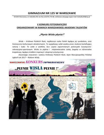 GIMNAZJUM NR 125 W WARSZAWIE 03-044 Warszawa, ul. Kobiałka 49, tel./fax (22)741-70-48, zs43www.edupage.org/e-mail: [email protected] V KONKURS FOTOGRAFICZNY ORGANIZOWANY W RAMACH WARSZAWSKIEJ AKADEMII TALENTÓW „Płynie Wisła płynie!“ Wisła – Królowa Polskich Rzek, najdłuższa rzeka Polski będąca jej symbolem, oraz historyczno-kulturowym dziedzictwem. To wyjątkowy szlak wodny przez stulecia kształtujący naturę i ludzi. To szlak o wielkim, lecz często zapomnianym potencjale turystycznorekreacyjno-sportowym. Wisła to piękna i niepowtarzalna rzeka, bogata w różnorodne krajobrazy, będąca źródłem inspiracji i ekspresji artystycznej. Doceniając znaczenie i walory Królowej Polskich Rzek, Sejm Rzeczpospolitej Polskiej ogłosił rok 2017 – Rokiem Wisły. REGULAMIN §1. POSTANOWIENIA OGÓLNE I CELE KONKURSU 1. Organizatorem konkursu jest Gimnazjum nr 125 w Warszawie. 2. Zasady Konkursu określa niniejszy regulamin, który wchodzi w życie z dniem rozpoczęcia konkursu i obowiązuje do czasu jego zakończenia. 3. Udział w konkursie oznacza zgodę na zastosowanie się do wszystkich zasad niniejszego regulaminu. 4. Cele konkursu: a) rozwijanie wrażliwości estetycznej inspirowanej umiejętnością obserwacji rzeczywistości; b) obserwacja przyrody; , c) rozwijanie umiejętności prezentacji walorów przyrodniczych, krajobrazowych, historycznych i kulturowych rzeki Wisły; d) kształtowanie emocjonalnej więzi z kulturowym dziedzictwem Polski; e) popularyzacja fotografii jako kreatywnej formy spędzania wolnego czasu. §2. ZDJĘCIA 1. 2. 3. 4. Każdy uczestnik może nadesłać maksymalnie 2 fotografie. Zdjęcia mogą być wykadrowane zarówno w poziomie, jak i w pionie. Stylistyka prac dowolna, proponowane i zalecane techniki to fotokolaż, fotomontaż. Najważniejsze kryteria oceny zdjęć: a) zgodność z tematem przewodnim konkursu; b) jakość wykonania; c) pomysłowość; d) oryginalność. 5. Wraz ze zdjęciami uczestnik zobowiązany jest dostarczyć szkolnemu koordynatorowi wypełnioną Kartę Zgłoszenia (załącznik 1). 6. Wypełnione Karty Zgłoszenia szkolny koordynator dostarcza do siedziby organizatora wraz ze zdjęciami. 7. Zdjęcia należy przesłać w formie: 1. wydrukowanej na papierze fotograficznym w formacie 15/21 cm; 2. cyfrowej zapisanej na płycie CD/DVD. 8. Zdjęcia tylko w formie cyfrowej lub tylko w formie papierowej nie wezmą udziału w konkursie. 9. Termin zgłaszania zdjęć upływa 19 maja 2017 r. Za datę zgłoszenia uważa się datę wpłynięcia pracy konkursowej do siedziby Organizatora. 10. Zdjęcia należy czytelnie opisać z tyłu. Opis musi zawierać: a) imię i nazwisko autora; b) numer szkoły; c) tytuł zdjęcia. 11. Każda szkoła proszona jest o dostarczenie maksymalnie 10 najlepszych prac. 12. Każda szkoła biorąca udział w konkursie dostarcza tylko jedną płytę CD/DVD z pracami wszystkich uczestników konkursu. Zdjęcia poszczególnych uczniów powinny znajdować się w odrębnych folderach nazwanych imieniem i nazwiskiem autora. 13. Płyta ze zdjęciami powinna być czytelnie podpisana. Opis musi zawierać: a) tytuł konkursu; b) imię i nazwisko szkolnego koordynatora konkursu c) numer szkoły. §3. HARMONOGRAM KONKURSU 1. Do dnia 3 marca 2017 r. do Organizatora – poprzez wysłanie wiadomości e-mail na adres [email protected] – zgłaszają się szkolni koordynatorzy odpowiedzialni za przeprowadzenie konkursu w danym gimnazjum. Nawiązanie współpracy jest niezbędne dla dobrej komunikacji między Organizatorem a Szkołami w celu ustalenia szczegółów organizacyjnych. 2. Uczniowie składają prace u koordynatorów konkursu w swojej szkole. 3. Szkolni koordynatorzy konkursu przekazują prace Organizatorowi do dnia 19 maja 2017 r. 4. W skład Komisji Konkursowej oceniającej prace uczniów wchodzą szkolni koordynatorzy konkursu. 5. W ustalonym ze szkolnymi koordynatorami terminie, jednak nie później niż do 1 czerwca 2017 r., odbędzie się posiedzenie Komisji Konkursowej, na którym prace konkursowe będą oceniane i zostanie ustalony werdykt. 6. Z posiedzenia Komisji Konkursowej zostanie sporządzony pisemny protokół. 7. Ogłoszenie wyników konkursu nastąpi 2 czerwca 2017 r. na stronie internetowej organizatora, informacja zostanie również przesłana do szkół poczta elektroniczną. §4. PUBLIKOWANIE ZDJĘĆ 1. Zgłoszenie zdjęć do konkursu oznacza wyrażenie zgody na ich nieodpłatne wykorzystywanie do promocji Gimnazjum nr 125 w Warszawie. Organizator zastrzega sobie prawo do publikowania fotografii zgłoszonych do konkursu, umieszczania ich na stronach internetowych, w mediach i wykorzystania ich w innej formie, wraz z podaniem danych autora (imię i nazwisko). 2. Zdjęcia reprezentujące wysoki poziom techniczny i merytoryczny zostaną po zakończeniu konkursu opublikowane na stronie internetowej Zespołu Szkół nr 43 w Warszawie. Także i w tym przypadku fotografie będą opisane nazwiskami autorów. §5. POSTANOWIENIA KOŃCOWE 1. Zgłoszenie fotografii do konkursu jest jednoznaczne z przyjęciem warunków niniejszego regulaminu i oświadczeniem, że fotografie złożone na konkurs zostały wykonane osobiście, a w przypadku portretów uzyskano zgodę na rozpowszechnianie wizerunku osób portretowanych. 2. Fotografie zgłoszone do konkursu nie będą zwracane i pozostaną w zbiorach Organizatora. 3. Organizator nie ponosi odpowiedzialności za ewentualne szkody spowodowane opublikowaniem nieprawdziwych danych osobowych bądź innych nieprawdziwych informacji opartych na zgłoszeniach sporządzonych przez Uczestników. 4. Decyzje Jury są ostateczne i wiążące dla Uczestników 5. Organizator zastrzega sobie prawo do zmiany harmonogramu konkursu. 6. Ostateczna interpretacja niniejszego regulaminu należy do Organizatora. 7. Wszelkich informacji dotyczących przebiegu konkursu udziela: Magdalena Topolska Gimnazjum nr 125 w Warszawie e. mail – [email protected] Zuzanna Książkiewicz e-mail: