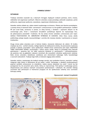 SYMBOLE SZKOŁY SZTANDAR Tradycja sztandaru wywodzi się z dawnych chorągwi, będących znakami państwa, ziemi, miasta, oddziałów lub organizacji cywilnych. Obecnie sztandary swoje posiadają: jednostki wojskowe, partie polityczne, organizacje społeczne, zawodowe, organizacje młodzieżowe, szkoły. Sztandar szkolny składa się z płata materii osadzonego na drzewcu. Płatem jest tkanina prostokątna, z prawej strony w barwach biało -czerwonych i umieszczonym na nim godłem państwowym. Godłem RP jest orzeł biały, zwrócony w prawo, ze złotą koroną, z dziobem i szponami złotymi na tle czerwonego pola. Orzeł z rozwartymi skrzydłami symbolizuje dążenie do najwyższego lotu, do pokonywania przeszkód i trudności. Na tej samej stronie sztandaru umieszczony jest napis: SZKOŁA PODSTAWOWA IM. OBROŃCÓW WYBRZEŻA W ŻUKOWIE. Złote litery nazwy szkoły podkreślają zasługi zespołu nauczycielskiego i uczniów dla rozwoju oświaty i wychowania w naszym środowisku. Druga strona płata sztandaru jest w kolorze białym, stosownie dobranym do całości. W środku znajduje się znicz - symbol oświaty, stałego dążenia do zdobywania wiedzy, do poznawania naukowej prawdy o świecie, przyrodzie i życiu społecznym. Wokół znicza umieszczony jest napis: WSZYSTKO TOBIE UKOCHANA ZIEMIO, zaczerpnięty z tekstu pieśni szkoły. Słowa te posiadają duży ładunek patriotyzmu i powinny być nie tylko wytyczną działania w wychowaniu i samowychowaniu, ale powinny stać się głębokim nakazem moralnym dla wszystkich członków społeczności szkolnej. Biała strona sztandaru dodatkowo ozdobiona jest elementami ludowego haftu kaszubskiego o wzorach żukowskich. Tradycje tego haftu w Żukowie sięgają wielu wieków. Sztandar szkolny, nawiązujący do tradycji naszego narodu, jest symbolem honoru, zwartości i pełnej integracji całej szkoły w odniesieniu do jej zadań i celów. Pamiętając o ideałach przekazywanych poprzez symbole umieszczone na sztandarze, należy zawsze okazywać mu cześć i starać się tak postępować by nie przynieść ujmy szkole, którą on reprezentuje. Pod opieką 3 osobowego pocztu eksponowany jest podczas ważnych uroczystości państwowych i szkolnych. Na sztandar ślubują uczniowie klas pierwszych w momencie przyjęcia ich do społeczności szkolnej oraz uczniowie kończący szkołę. Opracował: Antoni Grzędzicki GODŁO SZKOŁY XX rocznica nadania szkole imienia i wręczenia sztandaru stała się bodźcem do wzbogacenia symboliki szkolnej o godło. Przeprowadzony wśród uczniów konkurs plastyczny na projekt godła przyniósł wiele ciekawych propozycji wykorzystanych w zatwierdzonym wzorcu. Jego autorem jest Zbigniew Matyka, a wykonawcą Jerzy Pontus. Godło składa się z pierścienia kołowego i małego koła. Pierścień w kolorze piaskowym zawiera ciemnoniebieski napis "SP im. Obrońców Wybrzeża Żukowo". Kolory pierścienia symbolizują miejsca walk obronnych na Wybrzeżu. W białym małym kole umieszczono zieloną rogatywkę żołnierską, fragment liniatury z pisanymi literami "abcd" wraz z obsadką oraz haft kaszubski z tzw. szkoły żukowskiej. Rogatywka stanowi część umundurowania żołnierza polskiej piechoty, broniącego w 1939 r. naszego Wybrzeża. Pisane litery alfabetu oznaczają szkołę podstawową, w której prowadzi się naukę pisania. Zaś haft kaszubski to relikt naszej miejscowości mający swe tradycje wywodzące się z klasztoru Sióstr Norbertanek. Opracował: Jerzy Formela Elementy wychowania ucznia: 1. HISTORIA - Jesteśmy szkoła z tradycjami, rozwijającą się ku przyszłości. - współpracujemy społecznością lokalną; - pracujemy zgodnie z hasłem szkoły: "Z przeszłością ku przyszłości"; - pomagamy uczniom znaleźć swoje miejsce we współczesnym świecie; - szanujemy tradycje szkolne, regionalne, narodowe i religijne; 2. ETYKA - Jesteśmy szkołą, w której poszanowanie godności człowieka jest podstawą wychowania. - rozbudzamy i rozwijamy wrażliwość estetyczną i moralną dziecka oraz jego indywidualne zdolności twórcze; - inspirujemy uczniów do wyrażania własnych myśli i przeżyć w poszanowaniu innych; - kształcimy umiejętności skutecznego nawiązywania i podtrzymywania kontaktów międzyludzkich z uwzględnieniem zasad grzeczności, bezinteresowności, tolerancji; - upowszechniamy zachowania zgodne z przyjętymi normami społecznymi; - tworzymy hierarchię ogólnie przyjętych norm etycznych opartych na wartościach chrześcijańskich; - wyrabiamy poczucie szacunku dla dobra wspólnego; 3. PATRIOTYZM - Jesteśmy szkołą rozbudzającą umiłowanie regionu i Polski w kontekście zjednoczonej Europy. - wzmacniamy poczucie tożsamości kulturowej, historycznej, etycznej i narodowej; - współpracujemy z zaprzyjaźnionymi szkołami w kraju i za granicą; - poznajemy języki obce i język kaszubski; - poznajemy dziedzictwo kultury regionalnej; - uczymy szacunku do dorobku historyczno-kulturowego Kaszub, Polski i świata; - jesteśmy otwarci na różnorodność kultur i tradycji w wymiarze ponadnarodowym; 4. EDUKACJA - Jesteśmy szkołą, która przez zabawę, aktywizację i edukację zmierza do osiągania wysokich wskaźników w sprawdzianach wiedzy i umiejętności. - ustawicznie podnosimy kwalifikacje kadry pedagogicznej; - otaczamy wszechstronną pomocą uczniów z trudnościami - zapewniamy warunki do harmonijnego rozwoju fizycznego i psychicznego oraz zachowań prozdrowotnych; - staramy się stworzyć lepsze warunki pracy i nauki w szkole; - oceniamy według wewnątrzszkolnego systemu oceniania (WSO) oraz przedmiotowego systemu oceniania (PSO), uwzględniających indywidualne możliwości i predyspozycje uczniów; - realizujemy ścieżki międzyprzedmiotowe; - pracujemy według programów nauczania dopuszczonych przez MENiS, które poszerzamy o elementy autorskie; - ewaluujemy osiągnięcia i porażki; 5. RODZINA - Jesteśmy szkołą, która współpracuje i wspomaga rodzinę