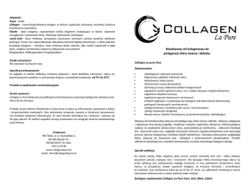 Składniki: Składniki: Aqua Aqua - woda. - woda. - naturalny, bioaktywny kolagen, w którym cząsteczka zachowuje naturalną strukturę Collagen Collagen - naturalny, bioaktywny kolagen, w którym cząsteczka zachowuje naturalną strukturę lewoskrętnej superhelisy. lewoskrętnej superhelisy. - obok- obok kolagenu, najważniejsze białkobiałko biogenne występujące w skórze. Zapewnia ElastinElastin kolagenu, najważniejsze biogenne występujące w skórze. Zapewnia rozciągliwość i sprężystość skóry.skóry. Wykazuje właściwości nawilżające. rozciągliwość i sprężystość Wykazuje właściwości nawilżające. kwas- kwas mlekowy, przyspiesza złuszczanie martwych warstw naskórka (działanie LacticLactic Acid -Acid mlekowy, przyspiesza złuszczanie martwych warstw naskórka (działanie peelingu). ProcesProces ten zapoczątkowuje odbudowę komórek głębiej położonych, a także pobudza peelingu). ten zapoczątkowuje odbudowę komórek głębiej położonych, a także pobudza produkcję kolagenu i elastyny. Kwas Kwas mlekowy działadziała również, jakojako nośnik cząsteczek w głąb produkcję kolagenu i elastyny. mlekowy również, nośnik cząsteczek w głąb skóry, skóry, zwiększa wchłanianie substancji odżywczych oraz oraz witamin. zwiększa wchłanianie substancji odżywczych witamin. Ethylparaben, Methylparaben, Propyhparaben. Ethylparaben, Methylparaben, Propyhparaben. ŚrodkiŚrodki ostrożności: ostrożności: Nie stosować na otwarte rany. rany. Nie stosować na otwarte Sposób przechowywania: Sposób przechowywania: Ze względu na bardzo delikatną strukturę preparatu i brak dodatków sztucznych, zaleca się się Ze względu na bardzo delikatną strukturę preparatu i brak dodatków sztucznych, zaleca o o C 5°C do 25 C. od 5od przechowywanie produktu w zacienionym miejscu w przedziale temperatur przechowywanie produktu w zacienionym miejscu w przedziale temperatur do 25°C. Produkt w opakowaniu termoizolacyjnym. Produkt w opakowaniu termoizolacyjnym. TerminTermin ważności: ważności: Collagen La Pure przechowywaniu pozostaje biologicznie aktywny przez Collagen LaBody Pure przy Bodyprawidłowym przy prawidłowym przechowywaniu pozostaje biologicznie aktywny przez okres 18-stu miesięcy. okres 18-stu miesięcy. Produkt nie jest Wiadomości umieszczone w ulotce są informacjami uzyskanymi z badań Produkt nielekiem! jest lekiem! Wiadomości umieszczone w ulotce są informacjami uzyskanymi z badań i eksperymentów naukowych. Opis Opis właściwości preparatu zawarty w niniejszym opracowaniu i eksperymentów naukowych. właściwości preparatu zawarty w niniejszym opracowaniu ma charakter wyłącznie informacyjny. W razie choroby skontaktuj się zsię lekarzem i zastosuj się się ma charakter wyłącznie informacyjny. W razie choroby skontaktuj z lekarzem i zastosuj do jego W żadnym wypadku kuracja preparatem nie zastępuje leczenia prowadzonego dozaleceń. jego zaleceń. W żadnym wypadku kuracja preparatem nie zastępuje leczenia prowadzonego przez lekarza. przez lekarza. Producent: Producent: PW TAGO, ul. A.ul. Huenefelda 4, 4, PW TAGO, A. Huenefelda 80-180 Gdańsk 80-180 Gdańsk Tel. Tel. 58/304-99-87 Tel. kom. 58/304-99-87 Tel. kom. 533-11-55-66 533-11-55-66 www.collagenlapure.pl www.collagenlapure.pl [email protected] email:email: [email protected] Bioaktywny żelżel kolagenowy dodo Bioaktywny kolagenowy pielęgnacji skóry twarzy i dekoltu. pielęgnacji skóry twarzy i dekoltu. Collagen La Pure Face Face Collagen La pure Zastosowanie: Zastosowanie: • • • • • • • • • • • • • • • • • • • • • • • • Zapobieganie i spłycanie zmarszczek Zapobieganie i spłycanie zmarszczek Regeneracja i głębokie nawilżanie Regeneracja i głębokie nawilżanieskóry skóry Modelowanie owalu twarzy Modelowanie owalu twarzy Wzmacnianie naczyń włosowatych Wzmacnianie naczyń włosowatych Stymulacja procesu odbudowy włókien Stymulacja procesu odbudowy włókienkolagenowych kolagenowych Łagodzenie stanów zapalnych skóry, Łagodzenie stanów zapalnych skóry,m.in. m.in.trądzik trądzikróżowaty różowatyi trądzik i trądzikmłodzieńczy młodzieńczy Łagodzenie objawów łuszczycy Łagodzenie objawów łuszczycy Łagodzenie oparzeń słonecznych i termicznych Łagodzenie oparzeń słonecznych i termicznych Działanie łagodzące i uzupełniające Działanie łagodzące i uzupełniającepopozabiegach zabiegachmikrodermabrazji mikrodermabrazjidiamentowej, diamentowej, peelingach chemicznych i mechanicznych peelingach chemicznych i mechanicznych Zabiegi jonoforezy i sonoforezy jako Zabiegi jonoforezy i sonoforezy jakoserum serumi żel i żelprzewodzący przewodzący Zabiegi mezoterapii bezigłowej Zabiegi mezoterapii bezigłowej Masaże twarzy i dekoltu: kosmetyczne, Masaże twarzy i dekoltu: kosmetyczne,przeciwzmarszczkowe, przeciwzmarszczkowe,odmładzające odmładzające Aktywny żelżel transdermalny dekoltu. Odżywia, pielęgnuje pielęgnuje transdermalnypolecany polecanydo dokażdego każdegotypu typuskóry skóry twarzy twarzy i dekoltu. Aktywny i regeneruje cerę czyniąc ją ją gładką, i wyraźnie i regeneruje cerę czyniąc gładką,nawilżoną nawilżoną i wyraźnieujędrnioną. ujędrnioną.Wzmacnia Wzmacniawłókna włóknakolagenu, kolagenu, wpływa nana zwiększenie wpływa zwiększenieelastyczności elastycznościskóry, skóry,przeciwdziała przeciwdziała jej jej zwiotczeniu. zwiotczeniu. Całkowicie Całkowicie likwiduje tzw. zmarszczki suche oraz wygładza zmarszczki tzw. zmarszczki suche oraz wygładza zmarszczkimimiczne. mimiczne.Łagodzi Łagodzipodrażnienia podrażnienia oraz oraz wspomaga procesy odnowy biologicznej. jednocześniewygładzając wygładzając procesy odnowy biologicznej.Likwiduje Likwidujetrądzik trądzikmłodzieńczy młodzieńczy i różowaty jednocześnie blizny.Zalecany Zalecanydodostosowania stosowania przy przy zabiegach zabiegach z z wykorzystaniem wy