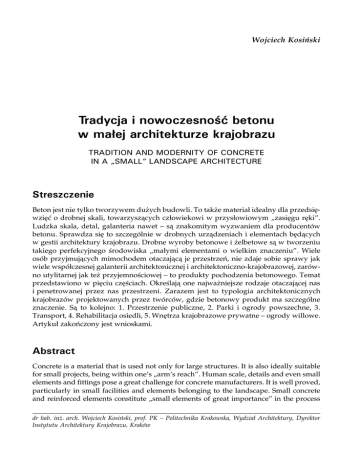 Wojciech Kosiński Tradycja i nowoczesność betonu w małej architekturze krajobrazu TRADITION AND MODERNITY OF CONCRETE IN A „SMALL” LANDSCAPE ARCHITECTURE Streszczenie Beton jest nie tylko tworzywem dużych budowli. To także materiał idealny dla przedsięwzięć o drobnej skali, towarzyszących człowiekowi w przysłowiowym „zasięgu ręki”. Ludzka skala, detal, galanteria nawet – są znakomitym wyzwaniem dla producentów betonu. Sprawdza się to szczególnie w drobnych urządzeniach i elementach będących w gestii architektury krajobrazu. Drobne wyroby betonowe i żelbetowe są w tworzeniu takiego perfekcyjnego środowiska „małymi elementami o wielkim znaczeniu”. Wiele osób przyjmujących mimochodem otaczającą je przestrzeń, nie zdaje sobie sprawy jak wiele współczesnej galanterii architektonicznej i architektoniczno-krajobrazowej, zarówno utylitarnej jak też przyjemnościowej – to produkty pochodzenia betonowego. Temat przedstawiono w pięciu częściach. Określają one najważniejsze rodzaje otaczającej nas i penetrowanej przez nas przestrzeni. Zarazem jest to typologia architektonicznych krajobrazów projektowanych przez twórców, gdzie betonowy produkt ma szczególne znaczenie. Są to kolejno: 1. Przestrzenie publiczne, 2. Parki i ogrody powszechne, 3. Transport, 4. Rehabilitacja osiedli, 5. Wnętrza krajobrazowe prywatne – ogrody willowe. Artykuł zakończony jest wnioskami. Abstract Concrete is a material that is used not only for large structures. It is also ideally suitable for small projects, being within one‘s „arm‘s reach”. Human scale, details and even small elements and fittings pose a great challenge for concrete manufacturers. It is well proved, particularly in small facilities and elements belonging to the landscape. Small concrete and reinforced elements constitute „small elements of great importance” in the process dr hab. inż. arch. Wojciech Kosiński, prof. PK – Politechnika Krakowska, Wydział Architektury, Dyrektor Instytutu Architektury Krajobrazu, Kraków of forming a perfect environment. Many persons who pass by casually the space around them do not realize how many elements of architecture and landscape are made of concrete. This topic has been presented in five parts. They identify the most important types of the space surrounding us and penetrated by us. At the same time, it is a typology of architectural landscapes designed by architects, where a concrete element has a particular importance. Their sequence is as follows: 1. Public spaces, 2. Parks and common gardens, 3. Transport, 4. Rehabilitation of housing estates, 5. Private landscape interiors – villa gardens. The paper ends with conclusions.