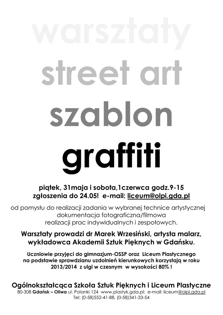 warsztaty street art szablon graffiti piątek, 31maja i sobota,1czerwca godz.9-15 zgłoszenia do 24.05! e-mail: [email protected] od pomysłu do realizacji zadania w wybranej technice artystycznej dokumentacja fotograficzna/filmowa realizacji prac indywidualnych i zespołowych. Warsztaty prowadzi dr Marek Wrzesiński, artysta malarz, wykładowca Akademii Sztuk Pięknych w Gdańsku. Uczniowie przyjęci do gimnazjum-OSSP oraz Liceum Plastycznego na podstawie sprawdzianu uzdolnień kierunkowych korzystają w roku 2013/2014 z ulgi w czesnym w wysokości 80% ! Ogólnokształcąca Szkoła Sztuk Pięknych i Liceum Plastyczne 80-308 Gdańsk – Oliwa ul. Polanki 124 www.plastyk.gda.pl; e-mail: [email protected] Tel: (0-58)552-41-88, (0-58)341-33-54