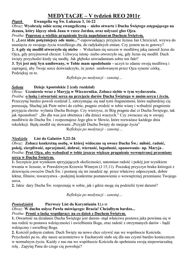MEDYTACJE – V tydzień REO 2011r. Piątek Ewangelia wg Św. Łukasza 3, 16-22 Obraz: Wyobrażę sobie scenę ewangeliczną - niebo otwarte i Ducha Świętego zstępującego na Jezusa, który klęczy obok Jana w rzece Jordan, oraz usłyszeć głos Ojca. Prośba: Poproszę o wielkie pragnienie bycia napełnionym Duchem Świętym. 1. „Lecz idzie potężniejszy ode mnie..."-zapowiadający przyjście Jezusa Jan Chrzciciel, wzywa do usunięcia ze swojego życia wszelkiego zła, do radykalnych zmian. Czy jestem na to gotowy? 2. A gdy się modlił otworzyło się niebo - Wsłucham się sercem w modlitwę jaką zanosił Jezus do Ojca, gdy przyjmował chrzest. Uchwycę istotę- niebo otworzyło się, gdy Jezus się modlił. Duch święty przychodzi kiedy się modlę. Jak głęboko uświadamiam sobie ten fakt? 3. Tyś jest mój Syn umiłowany, w Tobie mam upodobanie - uczyń to zdanie swoją modlitwą i zapragnij, aby Twoje serce doświadczyło, że jesteś umiłowanym przez Ojca synem/ córką . Podziękuj za to. Refleksja po medytacji - zanotuj… Sobota Dzieje Apostolskie 2 (cały rozdział) Obraz: Uczniowie wraz z Maryją w Wieczerniku. Zobacz siebie w tym wydarzeniu. Prośba: o łaskę i otwartość serca na przyjęcie darów Ducha Świętego w moim sercu i życiu. Przeczytaj bardzo powoli rozdział 2, zatrzymując się nad tymi fragmentami, które najbardziej cię poruszają. Słuchaj jak Piotr mówi do ciebie, pragnie zrodzić w tobie wiarę i wzbudzić pragnienie przyjęcia chrztu- wylania Ducha Bożego. Czy wierzysz, że Bóg pragnie dać ci Ducha Świętego, tak jak Apostołom? „Bo dla was jest obietnica i dla dzieci waszych.” Czy zwracasz się w swojej modlitwie do Ducha Św. i rozpoznajesz Jego głos w Słowie, które rozważasz każdego dnia rekolekcji. Będę modlił się słowami „Przyjdź Duchu Święty do mojego życia” Refleksja po medytacji - zanotuj… Niedziela List do Galatów 5,22-26 Obraz: Zobacz konkretną osobę, w której widoczne są owoce Ducha Św.: miłość, radość, pokój, cierpliwość, uprzejmość, dobroć, wierność, łagodność, opanowanie- np. Maryja . Prośba: Proś Ojca, aby wzbudzał w tobie jeszcze większe pragnienie wewnętrznej przemiany serca w Duchu Świętym. 1. Szczęście jest wynikiem sprzyjających okoliczności, natomiast radość i pokój jest wynikiem trwania w Jezusie, w Prawdziwym Krzewie Winnym (J 15,11). Poszukaj przyczyn braku któregoś z dziewięciu owoców Duch Św. i postaraj się im zaradzić np. przez właściwy odpoczynek, dobór lektur, filmów, towarzystwa - podejmij konkretne postanowienie o wewnętrznej przemianie Twojego serca. 2. Jakie dary Ducha Św. rozpoznaję w sobie, jak i gdzie mogę się podzielić tymi darami? Refleksja po medytacji - zanotuj… Poniedziałek Pierwszy List do Koryntianin 12,1-11 Obraz: W duchu usłysz Pawła mówiącego: Bracia! Chciałbym bardzo... Prośba: Prosić o łaskę współpracy na co dzień z Duchem Świętym. 1. Otwartość na działanie Ducha Świętego jest darem- stąd właściwa postawa jaka powinna się w nas rodzić to postawa wdzięczności i uwielbienia Boga, oraz radość z otrzymanych darów - bądź wdzięczny i uwielbiaj Boga. 2. Kościół jednym ciałem. Duch Święty na nowo chce ożywić nas we wspólnocie Kościoła. Przychodzi po to, aby nasze uczestnictwo w Eucharystii stało się dla nas czymś bardzo koniecznym w normalnym życiu. Każdy z nas ma we wspólnocie Kościoła do spełnienia swoją niepowtarzalną rolę . Zapytaj Pana do czego cię powołuje? Refleksja po medytacji - zanotuj… Wtorek Pierwszy List do Koryntianin 13 Obraz: obraz Boga, który jest miłością Prośba: proś, aby Bóg rozwijał w tobie największy dar - miłość. 1. „Pokażę wam teraz drogę, która przewyższa wszystkie inne”- Bóg wskazuje niezawodną drogę, którą jest miłość. Tylko dzięki miłości, wszelkie ludzkie działanie jest piękne i zachowuje swoją wartość. Czy czujesz się zaproszony do kroczenia tą drogą? 2. „Miłość jest...”- wczytuj się powoli w przymioty miłości i rozważaj je w swoim sercu, odnosząc do siebie -ułatwi ci to wstawienie swojego imienia w miejscu słowa „Miłość” podczas czytania. 3. „Gdy byłem dzieckiem...” - proś Pana o wielki dar miłości, abyś był zdolny kochać nawet swoich nieprzyjaciół, aby Jego miłość cię do tego uzdalniała. Refleksja po medytacji - zanotuj… Środa Ewangelia wg Św. Jana 14,25-27; 15,12-17 Obraz: Zobaczyć wspólnotę ludzi, którą prowadzi Duch Święty Prośba: Prosić o łaskę otwarcia się na przemieniające działanie Boga we wspólnocie. 1. Obietnica Jezusa - to troska o każdego z nas, zapewnienie o Jego opiece. To Jego obietnica, że będzie nas prowadził obdarowywał, udzielał światła i mocy. Jak to przyjmuję? 2. Przyjaźń z Jezusem - czynić to, czego chce Bóg, robić to dla Niego, a nie dla siebie , zaangażować się w sprawy Jego Królestwa. Razem z Nim szukać zagubionych owiec, działać nie samemu, ale razem z Nim. Rozmawiaj szczerze z Panem o tym, jak dotychczas wyglądała twoja postawa wobec Niego i jak Pan pragnie cię kształtować? Refleksja po medytacji - zanotuj… Czwartek Ewangelia wg Św. Łukasza 1, 26-38 Obraz: Zobacz Maryję w jej domu w Nazarecie. Stań przy Maryi, która się modli. Prośba: Proś o łaskę ufności w to, że Bóg ma moc uczynić cię świętym. 1. Świętość w zwyczajności - popatrz, że Maryja jest błogosławioną kobietą, ale tak normalnie żyjącą, w małej miejscowości, w skromnych warunkach. Jest dziewczyną, która prowadzi normalne, spokojne życie. Odnieś to do swojego życia. 2. Tajemnica Boga- zobacz jak przychodzi do Niej Anioł. Może zastanawiała się, czy to nie sen, czy to się dzieje naprawdę. Posłuchaj pierwszych słów Anioła, zobacz zdziwienie Maryi, Jej niepewność i to jak prosi Ona o wyjaśnienie, by coś więcej zrozumieć. Bądź przy tej tajemnicy i ucz się odwagi od Maryi.