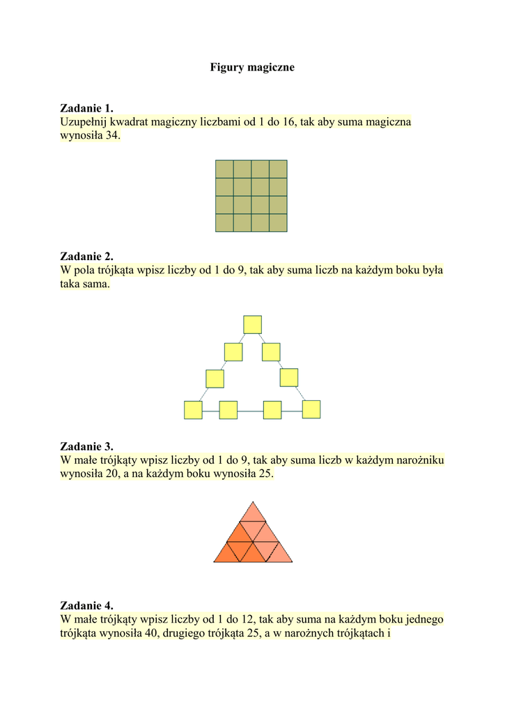 Figury magiczne Zadanie 1. Uzupełnij kwadrat magiczny liczbami od 1 do 16, tak aby suma magiczna wynosiła 34. Zadanie 2. W pola trójkąta wpisz liczby od 1 do 9, tak aby suma liczb na każdym boku była taka sama. Zadanie 3. W małe trójkąty wpisz liczby od 1 do 9, tak aby suma liczb w każdym narożniku wynosiła 20, a na każdym boku wynosiła 25. Zadanie 4. W małe trójkąty wpisz liczby od 1 do 12, tak aby suma na każdym boku jednego trójkąta wynosiła 40, drugiego trójkąta 25, a w narożnych trójkątach i wewnętrznym sześciokącie 39. Zadanie 5. Wpisz w kółka liczby 1, 2, 3, 4, 5, 6, 7, 8, 9 tak, aby suma liczb wzdłuż każdej linii była równa 15. Zadanie 6. Wpisz w kółka liczby 1, 2, 3, 4, 5, 6, 7, 8, 9 tak, aby suma wzdłuż każdej linii była taka sama. Zadanie 7. Uzupełnij rysunek, wpisując w koła liczby 1, 2, 3, 4, 5 tak, aby żadne dwie kolejne liczby nie znalazły się w kółkach połączonych linią. Zadanie 8. Wpisz w kółka liczby 1, 2, 3, 4, 5, 6, 7, 8, 9 tak, aby sumy wzdłuż linii były równe. Zadanie 9. Uzupełnij kółka liczbami 1, 2, 3, 4, 5 tak, żeby żadne dwie kolejne liczby nie były połączone odcinkami.