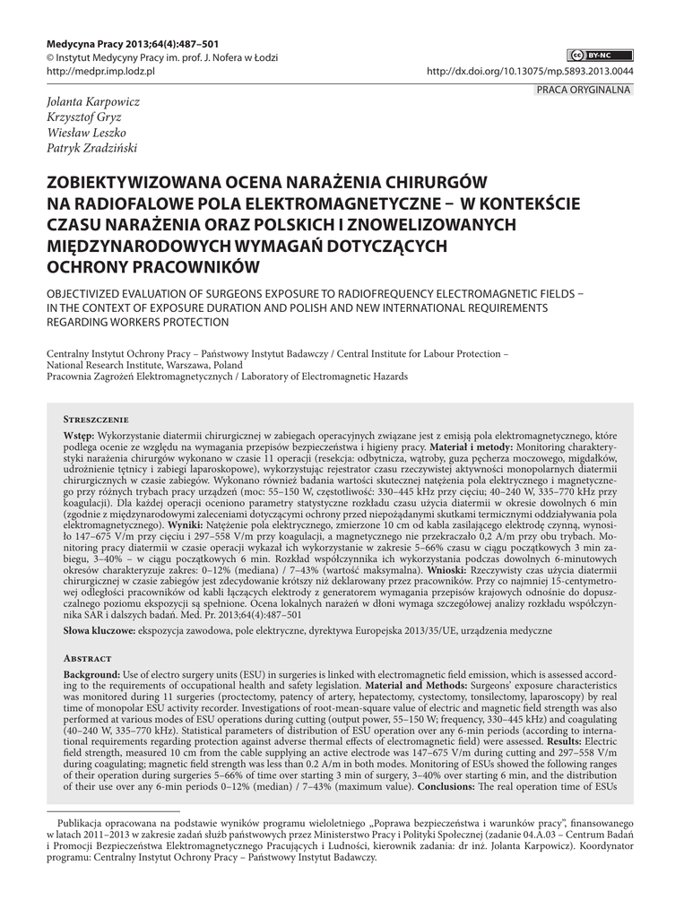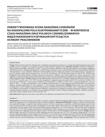 Medycyna Pracy 2013;64(4):487–501 © Instytut Medycyny Pracy im. prof. J. Nofera w Łodzi http://medpr.imp.lodz.pl http://dx.doi.org/10.13075/mp.5893.2013.0044 Jolanta Karpowicz Krzysztof Gryz Wiesław Leszko Patryk Zradziński PRACA ORYGINALNA ZOBIEKTYWIZOWANA OCENA NARAŻENIA CHIRURGÓW NA RADIOFALOWE POLA ELEKTROMAGNETYCZNE – W KONTEKŚCIE CZASU NARAŻENIA ORAZ POLSKICH I ZNOWELIZOWANYCH MIĘDZYNARODOWYCH WYMAGAŃ DOTYCZĄCYCH OCHRONY PRACOWNIKÓW OBJECTIVIZED EVALUATION OF SURGEONS EXPOSURE TO RADIOFREQUENCY ELECTROMAGNETIC FIELDS – IN THE CONTEXT OF EXPOSURE DURATION AND POLISH AND NEW INTERNATIONAL REQUIREMENTS REGARDING WORKERS PROTECTION Centralny Instytut Ochrony Pracy – Państwowy Instytut Badawczy / Central Institute for Labour Protection – National Research Institute, Warszawa, Poland Pracownia Zagrożeń Elektromagnetycznych / Laboratory of Electromagnetic Hazards Streszczenie Wstęp: Wykorzystanie diatermii chirurgicznej w zabiegach operacyjnych związane jest z emisją pola elektromagnetycznego, które podlega ocenie ze względu na wymagania przepisów bezpieczeństwa i higieny pracy. Materiał i metody: Monitoring charakterystyki narażenia chirurgów wykonano w czasie 11 operacji (resekcja: odbytnicza, wątroby, guza pęcherza moczowego, migdałków, udrożnienie tętnicy i zabiegi laparoskopowe), wykorzystując rejestrator czasu rzeczywistej aktywności monopolarnych diatermii chirurgicznych w czasie zabiegów. Wykonano również badania wartości skutecznej natężenia pola elektrycznego i magnetycznego przy różnych trybach pracy urządzeń (moc: 55–150 W, częstotliwość: 330–445 kHz przy cięciu; 40–240 W, 335–770 kHz przy koagulacji). Dla każdej operacji oceniono parametry statystyczne rozkładu czasu użycia diatermii w okresie dowolnych 6 min (zgodnie z międzynarodowymi zaleceniami dotyczącymi ochrony przed niepożądanymi skutkami termicznymi oddziaływania pola elektromagnetycznego). Wyniki: Natężenie pola elektrycznego, zmierzone 10 cm od kabla zasilającego elektrodę czynną, wynosiło 147–675 V/m przy cięciu i 297–558 V/m przy koagulacji, a magnetycznego nie przekraczało 0,2 A/m przy obu trybach. Monitoring pracy diatermii w czasie operacji wykazał ich wykorzystanie w zakresie 5–66% czasu w ciągu początkowych 3 min zabiegu, 3–40% – w ciągu początkowych 6 min. Rozkład współczynnika ich wykorzystania podczas dowolnych 6-minutowych okresów charakteryzuje zakres: 0–12% (mediana) / 7–43% (wartość maksymalna). Wnioski: Rzeczywisty czas użycia diatermii chirurgicznej w czasie zabiegów jest zdecydowanie krótszy niż deklarowany przez pracowników. Przy co najmniej 15-centymetrowej odległości pracowników od kabli łączących elektrody z generatorem wymagania przepisów krajowych odnośnie do dopuszczalnego poziomu ekspozycji są spełnione. Ocena lokalnych narażeń w dłoni wymaga szczegółowej analizy rozkładu współczynnika SAR i dalszych badań. Med. Pr. 2013;64(4):487–501 Słowa kluczowe: ekspozycja zawodowa, pole elektryczne, dyrektywa Europejska 2013/35/UE, urządzenia medyczne Abstract Background: Use of electro surgery units (ESU) in surgeries is linked with electromagnetic field emission, which is assessed according to the requirements of occupational health and safety legislation. Material and Methods: Surgeons’ exposure characteristics was monitored during 11 surgeries (proctectomy, patency of artery, hepatectomy, cystectomy, tonsilectomy, laparoscopy) by real time of monopolar ESU activity recorder. Investigations of root-mean-square value of electric and magnetic field strength was also performed at various modes of ESU operations during cutting (output power, 55–150 W; frequency, 330–445 kHz) and coagulating (40–240 W, 335–770 kHz). Statistical parameters of distribution of ESU operation over any 6-min periods (according to international requirements regarding protection against adverse thermal effects of electromagnetic field) were assessed. Results: Electric field strength, measured 10 cm from the cable supplying an active electrode was 147–675 V/m during cutting and 297–558 V/m during coagulating; magnetic field strength was less than 0.2 A/m in both modes. Monitoring of ESUs showed the following ranges of their operation during surgeries 5–66% of time over starting 3 min of surgery, 3–40% over starting 6 min, and the distribution of their use over any 6-min periods 0–12% (median) / 7–43% (maximum value). Conclusions: The real operation time of ESUs Publikacja opracowana na podstawie wyników programu wieloletniego „Poprawa bezpieczeństwa i warunków pracy”, finansowanego w latach 2011–2013 w zakresie zadań służb państwowych przez Ministerstwo Pracy i Polityki Społecznej (zadanie 04.A.03 – Centrum Badań i Promocji Bezpieczeństwa Elektromagnetycznego Pracujących i Ludności, kierownik zadania: dr inż. Jolanta Karpowicz). Koordynator programu: Centralny Instytut Ochrony Pracy – Państwowy Instytut Badawczy. 488 J. Karpowicz i wsp. Nr 4 during surgeries was significantly shorter than that declared by workers. The distance of at least 15 cm between cables, connecting electrodes with generator and workers meets the requirements of the Polish legislation on permissible exposure limits. The assessment of localized exposure of the hand needs a detailed analysis of the SAR ratio distribution and further studies are required. Med Pr 2013;64(4):487–501 Key words: occupational exposure, electric field, European Directive 2013/35/EU, medical devices Autorka do korespondencji / Corresponding author: Jolanta Karpowicz, Pracownia Zagrożeń Elektromagnetycznych, Centralny Instytut Ochrony Pracy – Państwowy Instytut Badawczy, ul. Czerniakowska 16, 00-701 Warszawa, e-mail: [email protected] Nadesłano: 13 czerwca 2013, zatwierdzono: 21 sierpnia 2013 WSTĘP Radiofalowe pola elektromagnetyczne już od lat 50– 70. ubiegłego wieku zaliczane są do szkodliwyc