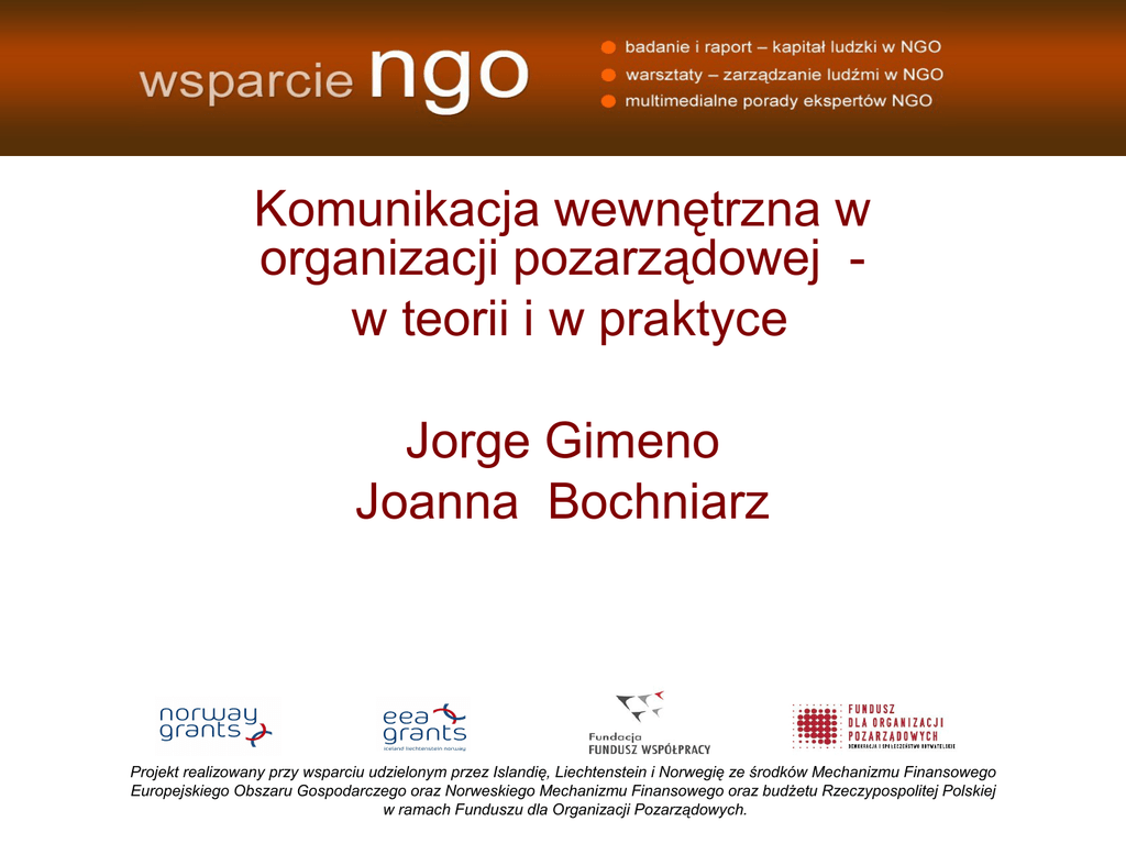 Projekt „Wsparcie dla organizacji pozarządowych działających na rzecz demokracji i społeczeństwa obywatelskiego” Komunikacja wewnętrzna w organizacji pozarządowej w teorii i w praktyce Jorge Gimeno Joanna Bochniarz Projekt realizowany przy wsparciu udzielonym przez Islandię, Liechtenstein i Norwegię ze środków Mechanizmu Finansowego Europejskiego Obszaru Gospodarczego oraz Norweskiego Mechanizmu Finansowego oraz budżetu Rzeczypospolitej Polskiej w ramach Funduszu dla Organizacji Pozarządowych. 1 Projekt „Wsparcie dla organizacji pozarządowych działających na rzecz demokracji i społeczeństwa obywatelskiego” System działów: Specjalizacje: projekty, kampanie, wolontariusze, marketing, finanse, etc. Działy. Jak je zrobić, jakie narzędzia im dać. Stanowiska: dobry opis stanowiska kluczem do sukcesu. Projekt realizowany przy wsparciu udzielonym przez Islandię, Liechtenstein i Norwegię ze środków Mechanizmu Finansowego Europejskiego Obszaru Gospodarczego oraz Norweskiego Mechanizmu Finansowego oraz budżetu Rzeczypospolitej Polskiej w ramach Funduszu dla Organizacji Pozarządowych. 2 Projekt „Wsparcie dla organizacji pozarządowych działających na rzecz demokracji i społeczeństwa obywatelskiego” Polepszenie komunikacji: Misja Wspólny cel Sens naszej roboty Idea Lepsza współpraca Zwiększenie wyników Projekt realizowany przy wsparciu udzielonym przez Islandię, Liechtenstein i Norwegię ze środków Mechanizmu Finansowego Europejskiego Obszaru Gospodarczego oraz Norweskiego Mechanizmu Finansowego oraz budżetu Rzeczypospolitej Polskiej w ramach Funduszu dla Organizacji Pozarządowych. 3 Projekt „Wsparcie dla organizacji pozarządowych działających na rzecz demokracji i społeczeństwa obywatelskiego” Narzędzia komunikacji: Mailing list: (informacja dla organizacji lub dla działów) Forum (korzystajmy z tanich rozwiązań) Maile (standaryzacja pomaga) Zebrania (o czym mamy mówić i jak długo) Ewaluacje (badajmy naszą organizację) Konkluzje (czy mamy odpowiedzi na nasze pytania) Projekt realizowany przy wsparciu udzielonym przez Islandię, Liechtenstein i Norwegię ze środków Mechanizmu Finansowego Europejskiego Obszaru Gospodarczego oraz Norweskiego Mechanizmu Finansowego oraz budżetu Rzeczypospolitej Polskiej w ramach Funduszu dla Organizacji Pozarządowych. 4 Projekt „Wsparcie dla organizacji pozarządowych działających na rzecz demokracji i społeczeństwa obywatelskiego” Kim jesteś? SWOT organizacji pozarządowej Czy organizacji potrzebna jest reorganizacja? - sprawność w realizacji celów - komunikacja na zewnątrz - komunikacja wewnątrz zespołu. Projekt realizowany przy wsparciu udzielonym przez Islandię, Liechtenstein i Norwegię ze środków Mechanizmu Finansowego Europejskiego Obszaru Gospodarczego oraz Norweskiego Mechanizmu Finansowego oraz budżetu Rzeczypospolitej Polskiej w ramach Funduszu dla Organizacji Pozarządowych. 5 Projekt „Wsparcie dla organizacji pozarządowych działających na rzecz demokracji i społeczeństwa obywatelskiego” Reorganizacja – krok 1 „Funkcje organizacji” Czemu / komu służy nasza organizacja? Ustalenie priorytetów Jakie działy należy wyodrębnić? Projekt realizowany przy wsparciu udzielonym przez Islandię, Liechtenstein i Norwegię ze środków Mechanizmu Finansowego Europejskiego Obszaru Gospodarczego oraz Norweskiego Mechanizmu Finansowego oraz budżetu Rzeczypospolitej Polskiej w ramach Funduszu dla Organizacji Pozarządowych. 6 Projekt „Wsparcie dla organizacji pozarządowych działających na rzecz demokracji i społeczeństwa obywatelskiego” Reorganizacja – krok 2 „Ludzie wewnątrz organizacji” Jak dobrać osoby? Jak podzielić kompetencje? Jak podzielić odpowiedzialność? Dalszy rozwój organizacji. Projekt realizowany przy wsparciu udzielonym przez Islandię, Liechtenstein i Norwegię ze środków Mechanizmu Finansowego Europejskiego Obszaru Gospodarczego oraz Norweskiego Mechanizmu Finansowego oraz budżetu Rzeczypospolitej Polskiej w ramach Funduszu dla Organizacji Pozarządowych. 7 Projekt „Wsparcie dla organizacji pozarządowych działających na rzecz demokracji i społeczeństwa obywatelskiego” Reorganizacja – krok 3 „Komunikacja wewnętrzna” Jak zapewnić komunikację wewnątrz działu? Jak zapewnić komunikację pomiędzy działami? Jak pozostać „otwartą” organizacją? Projekt realizowany przy wsparciu udzielonym przez Islandię, Liechtenstein i Norwegię ze środków Mechanizmu Finansowego Europejskiego Obszaru Gospodarczego oraz Norweskiego Mechanizmu Finansowego oraz budżetu Rzeczypospolitej Polskiej w ramach Funduszu dla Organizacji Pozarządowych. 8 Projekt „Wsparcie dla organizacji pozarządowych działających na rzecz demokracji i społeczeństwa obywatelskiego” Pozytywne rezultaty reorganizacji Większa efektywność. Większa przejrzystość. Lepsza komunikacja wewnątrz zespołu. Więcej czasu. Projekt realizowany przy wsparciu udzielonym przez Islandię, Liechtenstein i Norwegię ze środków Mechanizmu Finansowego Europejskiego Obszaru Gospodarczego oraz Norweskiego Mechanizmu Finansowego oraz budżetu Rzeczypospolitej Polskiej w ramach Funduszu dla Organizacji Pozarządowych. 9 Projekt „Wsparcie dla organizacji pozarządowych działających na rzecz demokracji i społeczeństwa obywatelskiego” Ryzyko związane z reorganizacją „Zgubienie” misji Konflikty wewnątrz organizacji Zła reorganizacja Projekt realizowany przy wsparciu udzielonym przez Islandię, Liechtenstein i Norwegię ze środków Mechanizmu Finansowego Europejskiego Obszaru Gospodarczego oraz Norweskiego Mechanizmu Finansowego oraz budżetu Rzeczypospolitej Polskiej w ramach Funduszu dla Organizacji Pozarządowych. 10 Projekt „Wsparcie dla organizacji pozarządowych działających na rzecz demokracji i społeczeństwa obywatelskiego” Organizacja wewnętrzna w sytuacji kryzysowej Ocena sytuacji Utworzenie Grupy wsparcia - po co 