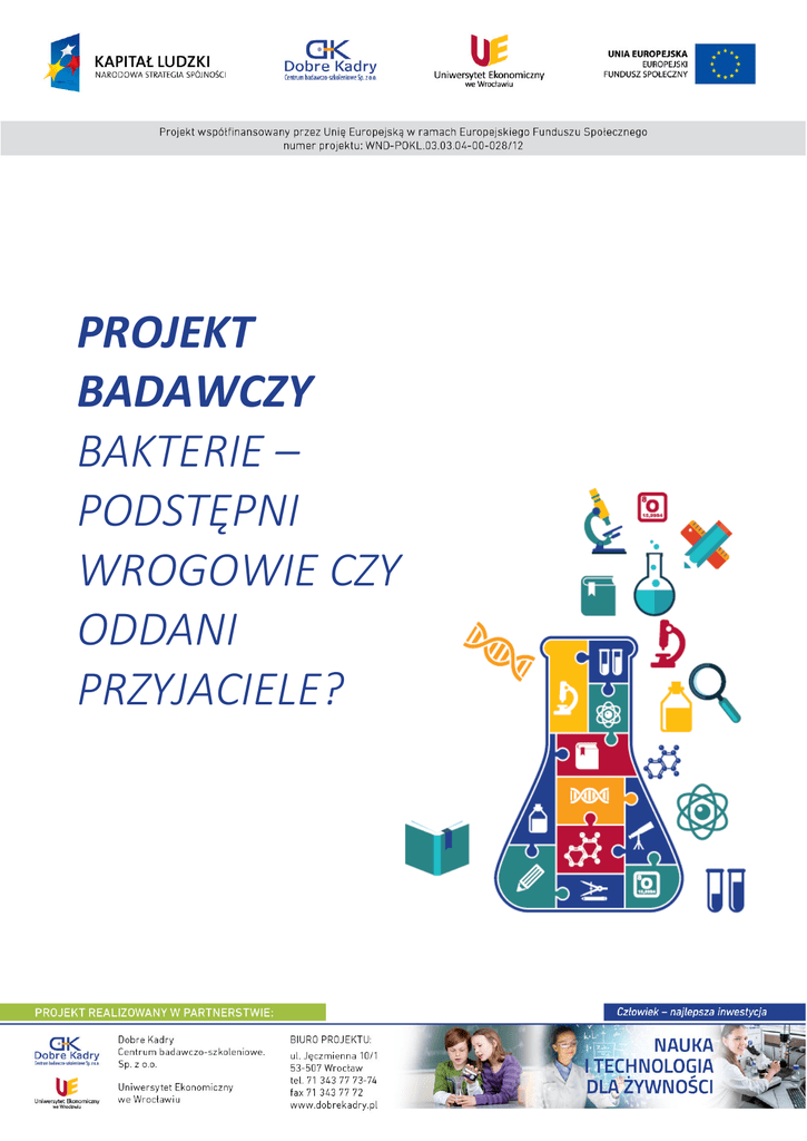 PROJEKT BADAWCZY BAKTERIE – PODSTĘPNI WROGOWIE CZY ODDANI PRZYJACIELE? 1 Nauka i technologia dla żywności Projekt badawczy Temat: Bakterie – podstępni wrogowie czy oddani przyjaciele? Wprowadzenie: Bakterie należą do najczęściej występujących w przyrodzie form życia, są bardzo małe (od 1 do 10 µm) i nie widoczne gołym okiem, dlatego można je obserwować tylko pod mikroskopem. Spotyka się je w ogromnych ilościach w każdym środowisku na Ziemi, nawet takim, które cechują ekstremalne warunki uniemożliwiające przeżycie innym organizmom. Wiele z nich żyje wewnątrz lub na innych większych istotach żywych. Większość z nas boi się bakterii, ale czy słusznie? Powinniśmy się ich bać, czy wręcz przeciwnie – zabiegać o ich obecność w naszym organizmie i wokół nas? Jaka jest prawda – czy bakterie są dobre czy złe? Kiedy przyjrzymy się im bliżej zauważymy, że przed naszymi oczami kryją się dwa zupełnie odmienne światy – z jednej strony świat przerażających i wszechobecnych bakterii chorobotwórczych kolonizujących nasze łazienki i kuchnie, wywołujących choroby i zakażenia, a z drugiej strony, dla równowagi, istnieje drugi świat, świat dobrych bakterii wywierających dobroczynny wpływ na nasz organizm, obecnych np. w serach i jogurtach. Tych złych powinniśmy więc starać się unikać, a z tymi drugimi zaprzyjaźnić się, najlepiej na całe życie. Cel projektu: Celem praktycznym projektu jest zobaczenie przez uczniów bakterii, czyli tego, czego na co dzień wokół siebie dostrzec nie możemy oraz podkreślenie ich pozytywnej roli w życiu człowieka. Wymiernym efektem pracy ucznia będzie przygotowanie prezentacji w programie PowerPoint zatytułowanej „Czasem dobre, czasem złe czyli cała prawda o bakteriach.” Cele kształcenia: Uczeń: - wyjaśnia znaczenie słowa mikrobiologia, - wymienia podstawowe cechy bakterii, - dzieli bakterie na grupy uwzględniając różne kryteria, - wymienia sposoby wykorzystania bakterii dla potrzeb przemysłowo-rolniczych, - podaje przykłady bakterii stosowanych w technologii żywności, - wymienia zarówno pozytywne, jak i negatywne skutki działania bakterii, - wykonuje posiew bakterii w probówkach i płytkach Petriego, - stosuje właściwe materiały oraz narzędzia do posiewu bakterii, - analizuje i opisuje obserwowane hodowle w probówkach i płytkach Petriego, - stosuje właściwy materiał biologiczny oraz przyrządy do sporządzania preparatów mikroskopowych utrwalonych, 2 - wykonuje preparaty bakteryjne utrwalane i barwione jednym barwnikiem, analizuje i opisuje wykonywane preparaty mikroskopowe, wyjaśnia czym jest imersja, stosuje obiektyw imersyjny do obserwacji preparatów bakteryjnych, stosuje kamerę mikroskopową do rejestrowania obrazów mikroskopowych. Pytanie kluczowe: W jakiej roli występują bakterie w naszym życiu – dobrej wróżki czy złej czarownicy? Bakterie – podstępni wrogowie czy oddani przyjaciele? Bakterie są to proste, jednokomórkowe organizmy bytujące we wszystkich środowiskach na Ziemi. Przodkami bakterii są jednokomórkowe organizmy, które pojawiły się na ziemi ok. 4 miliardów lat temu. Przez ok. 3 mld lat wszystkie organizmy były mikroskopijne, a wśród nich bakterie odgrywały dominującą rolę. Od czasu powstania bakterie niewiele się zmieniły, o czym świadczą skamieniałości sprzed ponad 3 mld lat. Niektóre ze znalezionych w nich bakterii niemal nie różnią się od tych żyjących współcześnie. Nazwa bakterie wprowadzona została w 1838r. przez niemieckiego przyrodnika Christiana Gottfrieda Ehrenberga. Wzięła się ona od greckiego słowa baktērion oznaczającego pałeczkę. Typowa komórka bakteryjna ma zwykle ok. 1 μm średnicy i 5 μm długości. Występują również bakterie o mniejszych rozmiarach – wiele ziarniaków ma średnicę 0,5 μm. Największym znanym obecnie gatunkiem bakterii jest Thiomargarita namibiensis – gatunek bakterii siarkowej wyizolowany z osadu dennego u wybrzeży Namibii w 1997 roku i opisany dwa lata później jako największa znana bakteria. Nazwa Thiomargarita oznacza „siarkową perłę”, ze względu na charakterystyczny obraz widziany pod mikroskopem przypominający sznur pereł. Pojedyncza komórka ma zwykle od 0,1 do 0,3 mm średnicy, ale może osiągać nawet ok. 0,75 mm, a więc ok. 1,5 mm długości. Niewielkie rozmiary bakterii (rzędu kilku mikrometrów) były przyczyną tego, że przez długi czas bakterie pozostawały nieznane i niezbadane. Bakterie zostały zauważone po raz pierwszy dopiero w 1686 roku przez holenderskiego przyrodnika i przedsiębiorcę Antoniego van Leeuwenhoek’a przy użyciu własnoręcznie wykonanego mikroskopu. Podczas zajęć uczniowie będą mogli zobaczyć to, czego przez kilkaset lat nie udawało się zobaczyć, czyli bakterie. Narzędziem, które w tym celu zostanie wykorzystane będzie mikroskop laboratoryjny STUDAR Z1, preparaty mikroskopowe bakteryjne oraz barwniki i inne odczynniki chemiczne niezbędne do barwienia bakterii. Bakterie mogą oddychać zarówno tlenowo, jak i beztlenowo. Bakterie tlenowe uzyskują energię w wyniku spalania substancji organicznych z udziałem tlenu. Można je podzielić na tlenowce bezwzględne, którym tlen jest niezbędny do życia i giną przy jego braku i tlenowce względne, które żyją w środowisku tlenowym, jednak gdy tlenu zabraknie zdolne są do oddychania beztlenowego. 3 Bakterie beztlenowe uzyskują energię w procesie fermentacji ( mlekowej, masłowej, metanowej itd.), rozkładając substancje organiczne bez udziału tlenu. Je także można podzielić na bezwzględne beztlenowce, dla których tlen jest toksyczny oraz względne beztlenowce, które żyją w środowisku beztlenowym, lecz tlen nie jest dla nich toksyczny i gdy dostanie się do ich środowiska potrafią wykorzystać go do oddychania. Podczas zajęć uczniowie dokonają posiewów bakterii tlenowych i beztlenowych na podłożach 