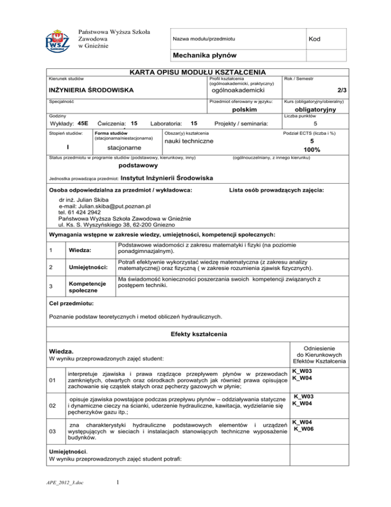Państwowa Wyższa Szkoła Zawodowa w Gnieźnie Nazwa modułu/przedmiotu Kod Mechanika płynów KARTA OPISU MODUŁU KSZTAŁCENIA Kierunek studiów Profil kształcenia (ogólnoakademicki, praktyczny) INŻYNIERIA ŚRODOWISKA Rok / Semestr ogólnoakademicki Specjalność Przedmiot oferowany w języku: 2/3 Kurs (obligatoryjny/obieralny) polskim obligatoryjny Liczba punktów Godziny Wykłady: 45E Stopień studiów: Ćwiczenia: 15 1 Laboratoria: Forma studiów (stacjonarna/niestacjonarna) I 15 Projekty / seminaria: Obszar(y) kształcenia 5 Podział ECTS (liczba i %) 5 100% nauki techniczne stacjonarne Status przedmiotu w programie studiów (podstawowy, kierunkowy, inny) (ogólnouczelniany, z innego kierunku) podstawowy Jednostka prowadząca przedmiot: Instytut Inżynierii Środowiska Osoba odpowiedzialna za przedmiot / wykładowca: Lista osób prowadzących zajęcia: dr inż. Julian Skiba e-mail: [email protected] tel. 61 424 2942 Państwowa Wyższa Szkoła Zawodowa w Gnieźnie ul. Ks. S. Wyszyńskiego 38, 62-200 Gniezno Wymagania wstępne w zakresie wiedzy, umiejętności, kompetencji społecznych: 1 Wiedza: Podstawowe wiadomości z zakresu matematyki i fizyki (na poziomie ponadgimnazjalnym). 2 Umiejętności: Potrafi efektywnie wykorzystać wiedzę matematyczna (z zakresu analizy matematycznej) oraz fizyczną ( w zakresie rozumienia zjawisk fizycznych). 3 Kompetencje społeczne Ma świadomość konieczności poszerzania swoich kompetencji związanych z postępem techniki. Cel przedmiotu: Poznanie podstaw teoretycznych i metod obliczeń hydraulicznych. Efekty kształcenia Wiedza. W wyniku przeprowadzonych zajęć student: Odniesienie do Kierunkowych Efektów Kształcenia 01 K_W03 interpretuje zjawiska i prawa rządzące przepływem płynów w przewodach zamkniętych, otwartych oraz ośrodkach porowatych jak również prawa opisujące K_W04 zachowanie się cząstek stałych oraz pęcherzy gazowych w płynie; 02 opisuje zjawiska powstające podczas przepływu płynów – oddziaływania statyczne i dynamiczne cieczy na ścianki, uderzenie hydrauliczne, kawitacja, wydzielanie się pęcherzyków gazu itp.; K_W03 K_W04 03 zna charakterystyki hydrauliczne podstawowych elementów i urządzeń występujących w sieciach i instalacjach stanowiących techniczne wyposażenie budynków. K_W04 K_W06 Umiejętności. W wyniku przeprowadzonych zajęć student potrafi: APE_2012_3.doc 1 Państwowa Wyższa Szkoła Zawodowa w Gnieźnie Nazwa modułu/przedmiotu Kod Mechanika płynów 01 stosować wiedzę z zakresu mechaniki płynów do projektowania sieci, instalacji K_U16 oraz urządzeń stanowiących techniczne wyposażenie budynków; 02 ocenić urządzenia i instalacje pod względem hydraulicznym; K_U13 03 wykorzystać nabytą wiedzę do kontrolnych pomiarów wielkości hydraulicznych w inżynierii środowiska. K_U08 Kompetencje społeczne. W wyniku przeprowadzonych zajęć student zdobędzie następujące kompetencje: 01 rozumie potrzebę permanentnego kształcenia się i przekazywania w sposób zrozumiały informacji z najbliższym otoczeniem w działalności zawodowej; K_K01 02 rozumie pozatechniczne ( w tym ekologiczne) skutki swojego działania i jego wpływu na środowisko; K_K02 03 potrafi przekazywać informacje i wyjaśniać w sposób powszechnie zrozumiały zagadnienia techniczne. K_K07 Sposoby sprawdzenia efektów kształcenia Wykład ocena aktywności na zajęciach pisemny egzamin końcowy sprawdzający wiedzę teoretyczną i praktyczną (część zadaniowa). Ćwiczenia. audytoryjne ocena aktywności na zajęciach 2 sprawdziany w ciągu semestru, pisemne kolokwium zaliczeniowe Ćwiczenia laboratoryjne: sprawdziany wejściowe pisemne przed każdym ćwiczeniem, ocena sprawozdań z przeprowadzonych doświadczeń laboratoryjnych ocena kreatywności podczas przeprowadzania pomiarów Skala ocen : Liczba punktów ocena powyżej 10 celująca 9 ― 9,9 bardzo dobra (A) 8 ― 8,9 dobra plus (B) 7 ― 7,9 dobra (C) 6 ― 6,9 dostateczna plus (D) 5 ― 5,9 dostateczna (E) poniżej 5 niedostateczna (F) Treści programowe Klasyfikacja płynów. Płyny nienewtonowskie, siły działające w płynach. Elementy statyki płynów: stany spoczynku, podstawowe równanie płynu i jego zastosowanie, przyrządy do pomiaru ciśnienia, parcie cieczy na ścianki płaskie i zakrzywione, wykresy parcia, wypór, równowaga ciał zanurzonych w cieczy, podstawowe pojęcia ruchu płynu. Dynamika cieczy doskonałej: zasada ciągłości przepływu, równanie Bernoulliego i jego interpretacja. Przepływ cieczy rzeczywistej, doświadczenie Reynoldsa, ruch laminarny, turbulentny. Teoria warstwy granicznej. Opory przepływu i profile prędkości w ruchu laminarnym i turbulentnym Hydrauliczne obliczanie przewodów, przepływ w rurach szorstkich, straty liniowe, miejscowe, wykresy piezometrycznej linii ciśnień, obliczenia hydrauliczne pojedynczych przewodów, lewar, obliczanie przewodów długich, układy przewodów, trzy zbiorniki, obliczanie sieci przewodów, Pompowanie cieczy, metody obniżania oporów przepływu. Przepływ gazów w przewodach, uderzenie hydrauliczne. Ruch cieczy w przewodach bezciśnieniowych, przepływ w kanałach otwartych, ruch APE_2012_3.doc 2 Państwowa Wyższa Szkoła Zawodowa w Gnieźnie Nazwa modułu/przedmiotu Kod Mechanika płynów jednostajny w korytach otwartych, przewody kanalizacyjne, ruch krytyczny. Wypływ cieczy ze zbiorników. Dynamiczne działanie strumienia parcie strumienia w przewodzie. Wybrane problemy dynamiki gazów. wypływ adiabatyczny i izotermiczny gazu, Przepływ w kanałach otwartych Przepływ przez warstwy ziarniste, prawo Darcy, współczynnik filtracji, dopływ wody do studni, rowu. Opływy ciał. Przepływ mieszanin wielofazowych ciecz-gaz i ciecz – cząstki ciała stałego. Opadanie cząstek. Sedymentacja. Odpylanie gazów. Napowietrzanie cieczy. Obliczanie wypływu i przepływu gazów. Teoria barbotażu. Elementy hydrotransportu zawiesin. Rozkład ciśnienia w atmosferze. Litera
