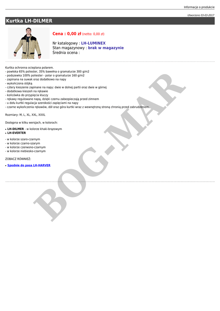 Informacje o produkcie Utworzono 03-03-2017 Kurtka LH-DILMER Cena : 0,00 zł (netto: 0,00 zł) Nr katalogowy : LH-LUMINEX Stan magazynowy : brak w magazynie Średnia ocena : AR Kurtka ochronna ocieplana polarem. - powłoka 65% poliester, 35% bawełna o gramaturze 300 g/m2 - podszewka 100% poliester - polar o gramaturze 160 g/m2 - zapinana na suwak oraz dodatkowo na napy - wykończona stójką - cztery kieszenie zapinane na napy: dwie w dolnej partii oraz dwie w górnej - dodatkowa kieszeń na rękawie - końcówka do przypięcia kluczy - rękawy regulowane napą, dzięki czemu zabezpieczają przed zimnem - u dołu kurtki regulacja szerokości zapięciami na napy - czarne wykończenia rękawów, dół oraz góra kurtki wraz z wewnętrzną stroną chronią przed zabrudzeniem. Rozmiary: M, L, XL, XXL, XXXL ● ● LH-DILMER - w kolorze khaki-brązowym LH-EVERTER - w kolorze szaro-czarnym - w kolorze czarno-szarym - w kolorze czerwono-czarnym - w kolorze niebiesko-czarnym O Spodnie do pasa LH-HARVER B ● G ZOBACZ RÓWNIEŻ: -M Dostępna w kilku wersjach, w kolorach: