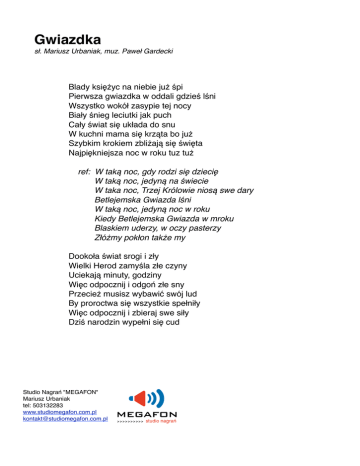 Gwiazdka sł. Mariusz Urbaniak, muz. Paweł Gardecki Blady księżyc na niebie już śpi Pierwsza gwiazdka w oddali gdzieś lśni Wszystko wokół zasypie tej nocy Biały śnieg leciutki jak puch Cały świat się układa do snu W kuchni mama się krząta bo już Szybkim krokiem zbliżają się święta Najpiękniejsza noc w roku tuz tuż & " ref: W taką noc, gdy rodzi się dziecię W taką noc, jedyną na świecie W taka noc, Trzej Królowie niosą swe dary Betlejemska Gwiazda lśni W taką noc, jedyną noc w roku Kiedy Betlejemska Gwiazda w mroku Blaskiem uderzy, w oczy pasterzy Złóżmy pokłon także my Dookoła świat srogi i zły Wielki Herod zamyśla złe czyny Uciekają minuty, godziny Więc odpocznij i odgoń złe sny Przecież musisz wybawić swój lud By proroctwa się wszystkie spełniły Więc odpocznij i zbieraj swe siły Dziś narodzin wypełni się cud Studio Nagrań "MEGAFON" Mariusz Urbaniak tel: 503132283 www.studiomegafon.com.pl [email protected]