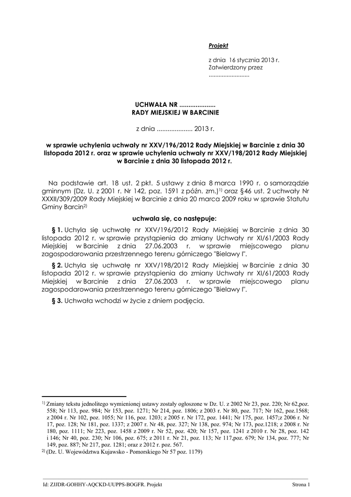 Projekt z dnia 16 stycznia 2013 r. Zatwierdzony przez ......................... UCHWAŁA NR .................... RADY MIEJSKIEJ W BARCINIE z dnia .................... 2013 r. w sprawie uchylenia uchwały nr XXV/196/2012 Rady Miejskiej w Barcinie z dnia 30 listopada 2012 r. oraz w sprawie uchylenia uchwały nr XXV/198/2012 Rady Miejskiej w Barcinie z dnia 30 listopada 2012 r. Na podstawie art. 18 ust. 2 pkt. 5 ustawy z dnia 8 marca 1990 r. o samorządzie gminnym (Dz. U. z 2001 r. Nr 142, poz. 1591 z późn. zm.)1) oraz §46 ust. 2 uchwały Nr XXXII/309/2009 Rady Miejskiej w Barcinie z dnia 20 marca 2009 roku w sprawie Statutu Gminy Barcin2) uchwala się, co następuje: § 1. Uchyla się uchwałę nr XXV/196/2012 Rady Miejskiej w Barcinie z dnia 30 listopada 2012 r. w sprawie przystąpienia do zmiany Uchwały nr XI/61/2003 Rady Miejskiej w Barcinie z dnia 27.06.2003 r. w sprawie miejscowego planu zagospodarowania przestrzennego terenu górniczego "Bielawy I". § 2. Uchyla się uchwałę nr XXV/198/2012 Rady Miejskiej w Barcinie z dnia 30 listopada 2012 r. w sprawie przystąpienia do zmiany Uchwały nr XI/61/2003 Rady Miejskiej w Barcinie z dnia 27.06.2003 r. w sprawie miejscowego planu zagospodarowania przestrzennego terenu górniczego "Bielawy I". § 3. Uchwała wchodzi w życie z dniem podjęcia. 1) Zmiany tekstu jednolitego wymienionej ustawy zostały ogłoszone w Dz. U. z 2002 Nr 23, poz. 220; Nr 62,poz. 558; Nr 113, poz. 984; Nr 153, poz. 1271; Nr 214, poz. 1806; z 2003 r. Nr 80, poz. 717; Nr 162, poz.1568; z 2004 r. Nr 102, poz. 1055; Nr 116, poz. 1203; z 2005 r. Nr 172, poz. 1441; Nr 175, poz. 1457;z 2006 r. Nr 17, poz. 128; Nr 181, poz. 1337; z 2007 r. Nr 48, poz. 327; Nr 138, poz. 974; Nr 173, poz.1218; z 2008 r. Nr 180, poz. 1111; Nr 223, poz. 1458 z 2009 r. Nr 52, poz. 420; Nr 157, poz. 1241 z 2010 r. Nr 28, poz. 142 i 146; Nr 40, poz. 230; Nr 106, poz. 675; z 2011 r. Nr 21, poz. 113; Nr 117,poz. 679; Nr 134, poz. 777; Nr 149, poz. 887; Nr 217, poz. 1281; oraz z 2012 r. poz. 567. 2) (Dz. U. Województwa Kujawsko - Pomorskiego Nr 57 poz. 1179) —————————————————————————————————————————————————— Id: ZJJDR-GOHHY-AQCKD-UUPPS-BOGFR. Projekt Strona 1 Uzasadnienie Wojewoda Kujawsko - Pomorski jako organ nadzorczy wskazał na błędne zapisy w podjętych przez Radę Miejską uchwałach. Zapisy zawierały ustalenia dotyczące przeznaczenia terenu. Zgodnie z wytycznymi Wojewody intencją uchwał w sprawie przystąpienia do sporządzenia zmiany miejscowego planu zagospodarowania przestrzennego winno być wyłącznie zakomunikowanie wszczęcia właściwego procesu planistycznego oraz wyznaczenie w załaczniku graficznym granic obszaru, jakiego będą dotyczyc ustalenia przyszłego planu. Z uwagi na wszczęcie przez Wojewodę z urzedu postępowania w stosunku do podjętych uchwał konieczne jest podjęcie niniejszej uchwały, w celu eliminacji wadliwych uchwał z obiegu prawnego. Sporzadziła i Referuje na komisjach RM: Agnieszka Wołkiewicz - referent ds. gospodarki przestrzennej ..................................... Zatwierdziła i referuje na sesji RM. Eliza Graczyk - Kierownik Referatu Gospodarki Komunalnej, Przestrzennej i Ochrony Środowiska ..................................... Akceptuję: ................................... Wnoszę o wprowadzenie niniejszego projektu do porządku obrad najbliższej sesji Rady Miejskiej: ............................................. —————————————————————————————————————————————————— Id: ZJJDR-GOHHY-AQCKD-UUPPS-BOGFR. Projekt Strona 1