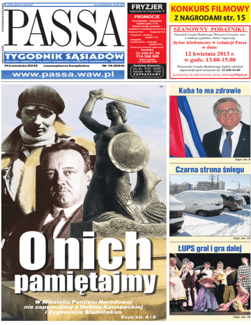 WYCHODZI OD 2000 ROKU ISSN 1640–405X 11 kwietnia 2013 czasopismo bezpłatne Nr 14 (654) M.D. Kuba to ma zdrowie Czyt. str. 8 Czarna strona śniegu Czyt. str. 12 ŁUPS grał i gra dalej W Miesiącu Pamięci Narodowej nie zapomnijmy o Halinie Konopackiej i Zygmuncie Słomińskim Czyt. str. 4 i 5 Czyt. str. 10 2 Pamięć niejedno ma imię rozpadł na skutek wybuchu w powietrzu. ieszczęsna wyprawa, zainicjowana i kierowana przez prezydenta Rzeczypospolitej Lecha Kaczyńskiego, miała być nominalnie jeszcze jednym uczczeniem pamięci 20 tysięcy polskich ofiar mordu, dokonanego w 1940 przez stalinowskich oprawców z NKWD po części w bliskim Smoleńska Katyniu. Jak na ironię, ofiary tamtej, rzeczywistej zbrodni zostały usunięte w cień przez tych, którzy od trzech lat wycinają na grobach załogi i pasażerów tupolewa polityczne hołubce. Nawet brat bliźniak byłego szefa państwa, Jarosław Kaczyński – w odniesieniu do katastrofy u progu wojskowego lotniska pod Smoleńskiem – zaczął w pewnym momencie mówić o „zbrodni”, której sprawcy muszą być ukarani. Bez najmniejszej żenady mąci ludziom w głowach, podpierając się raptem jednym sensacyjnym artykułem w dzienniku „Rzeczpospolita”. ała ta akcja mogłaby nosić kryptonim „Zbrodnia Tuska i Ruska”, bowiem propagandyści ludu smoleńskiego starają się przekonać całą Polskę, iż do katastrofy w 2010 doprowadzili pospołu premierzy Polski i Rosji: Donald Franciszek Tusk i Władymir Władymirowicz Putin (obecny prezydent). No cóż, nawet Józef Wissarionowicz Stalin tarza się w grobie ze śmiechu na takie dictum. Co gorsza zaś, zwolennicy teorii zamachu sami plują we własne gniazdo, wymachując podczas manifestacji symbolem Chrystusowej męki jako „krzyżem smoleńskim”. To już nie jest tak, że nieodpowiedzialny organizator lotniczej pielgrzymki Lech Kaczyński ma być bohaterem narodowym, który z rąk siepaczy poległ za ojczyznę. U czynienie z 96 grobów politycznej trampoliny to swoisty objaw nekroszantażu, jakim posługuje się grupa osób, która wolałaby zapewne, by w wyborach parlamentarnych lub prezydenckich formularze z głosami były wrzucane raczej do trumien niż do urn. Świadczą o tym rekordowo liczne świeckie i kościelne manifestacje, jakich nawałnicę mieliśmy w Warszawie z okazji trzeciej rocznicy katastrofy rządowego tupolewa pod Smoleńskiem. A jeszcze bardziej świadczy propagandowa kampania Antoniego Macierewicza, w której ten szeroko znany w świecie ekspert lotniczy wypowiada się z wielką pogardą o ustaleniach przyczyn wspomnianej tragedii, zaprezentowanych przez państwową komisję, kierowaną przez Jerzego Millera. ieszkańcy Warszawy musieli – chcąc nie chcąc – znosić natłok „patriotycznych” manifestacji, podczas których ogłaszano urbi et orbi, że na nasz rządowy samolot dokonano 10 kwietnia 2010 zamachu. Taką tezę wylansowała „Gazeta Polska”, chociaż sam Macierewicz uchodzący za guru manifestującego „ludu smoleńskiego” nie używa oficjalnie słowa zamach, lecz powiada nieco oględniej, iż tupolew wcale nie walnął plecami o glebę, sprowadzony zbyt nisko we mgle, jeno się M C D PETRO / AUGUSTYN N na Ursynowie dziennikarza sportowego Marka Jóźwika. opiero po wielu latach, gdy udało się dotrzeć do tajnych akt peerelowskiej Służby Bezpieczeństwa, opinia publiczna została poinformowana, iż przyczynami katastrof były nie tylko błędy konstrukcyjne produkowanych w ZSRR Iłów, lecz także eksploatowanie przez polską stronę silników tych maszyn ponad dopuszczalną normę. olejny pasztet mieliśmy 23 stycznia 2008. Z powodu rażącej lekkomyślności dowódców, wracających – nomen omen – z konferencji bezpieczeństwa lotów w Poznaniu, rozbił się w trudnych warunkach atmosferycznych w Mirosławcu wojskowy samolot transportowy CASA C295M. Dziesiątego kwietnia 2010 piloci prowadzący rządowego tupolewa próbowali lądować pod Smoleńskiem w jeszcze gorszych, mimo że Siewierny nie posiadał samonaprowadzającego systemu ILS. We wszystkich wspomnianych wypadkach względy bezpieczeństwa zostały przez decydentów różnego szczebla skandalicznie zlekceważone. Do takiego lekceważenia usiłował też zmusić w 2008 pilota Tu-154M prezydent Kaczyński. Gdyby Grzegorz Pietruczuk złamał wówczas regulamin, wykonując polecenie „zwierzchnika sił zbrojnych” i próbował lądować w Tbilisi, mielibyśmy – być może – głośną katastrofę dużo wcześniej. Wszak pasażerami tupolewa byli, obok prezydenta Polski, również prezydenci Litwy, Estonii i Ukrainy. Wyznawcy kultu smoleńskiego nie chcą jednak apoteozować Pietruczuka. Bo co to za bohater, który nie doprowadził do śmierci? PA S S M I TA On – zdaniem ludu smoleńskiego – bohaterem już jest, a pochówek na Wawelu powinien być wstępem do ogłoszenia go świętym. hociaż już dawno raport wyjaśniający przyczyny upadku tupolewa opublikowała fachowa komisja, jej ustalenia wyznawcy nowego kultu biorą za nic, słuchając tylko jak się w tej sprawie wypowiadają „Gazeta Polska”, Jasna Góra i Radio Maryja. Wszystko to składa się na tragikomiczny serial, którego parę odcinków nadała ostatnio telewizja publiczna, trzymająca się – skądinąd słusznie – zasady pluralizmu medialnego. przeprowadzonej na antenie TVP bałaganiarskiej dyskusji, której C W większość uczestników próbowała zakrzyczeć kontrargumenty, poruszano kwestie drugorzędne, nie wspominając nawet słowem o skandalicznym ciągu zdarzeń, poprzedzającym rozbicie tupolewa pod Siewiernym. A jak to wygląda z mojego akurat punktu widzenia? ieliśmy otóż trzy potężne katastrofy lotnicze, które całemu społeczeństwu zapadły w pamięć. Pierwsza zdarzyła się 14 marca 1980. Wracający z Nowego Jorku Ił-62 Mikołaj Kopernik próbował odejść na drugi krąg już nad lotniskiem Okęcie z powodu niewysunięcia podwozia, gdy pęknięcie turbiny