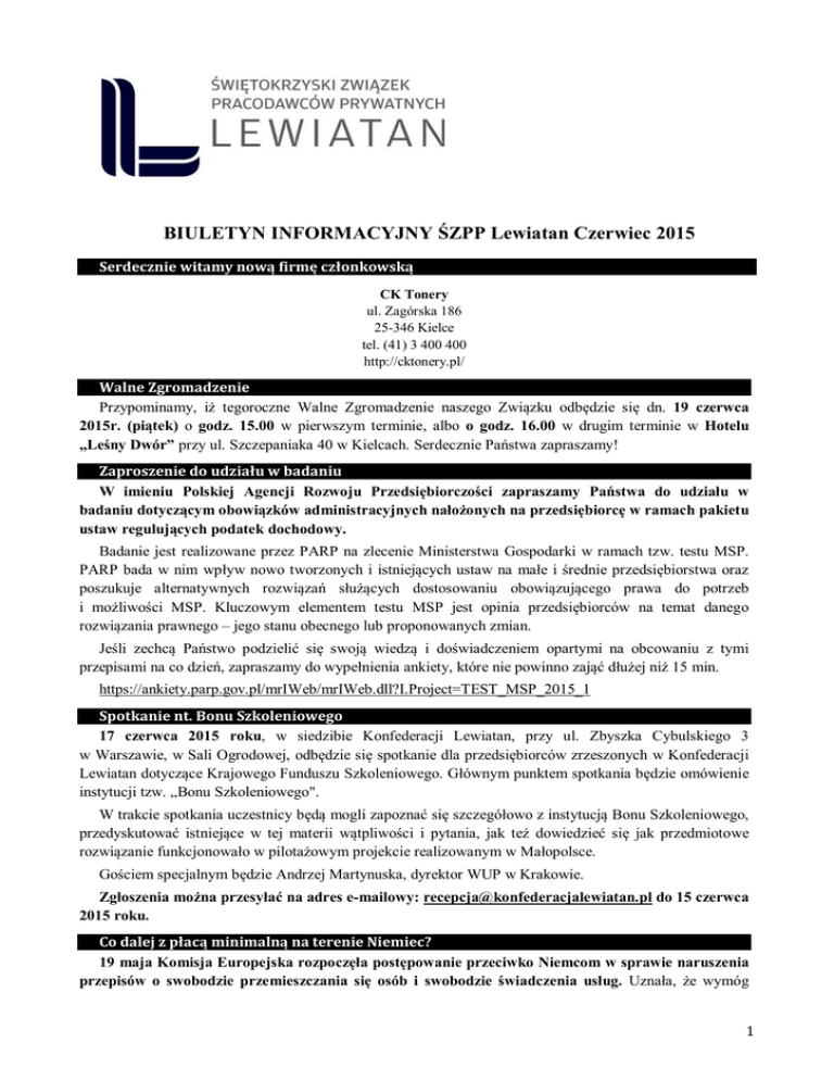 Czerwiec 2015 - Świętokrzyski Związek Pracodawców Prywatnych