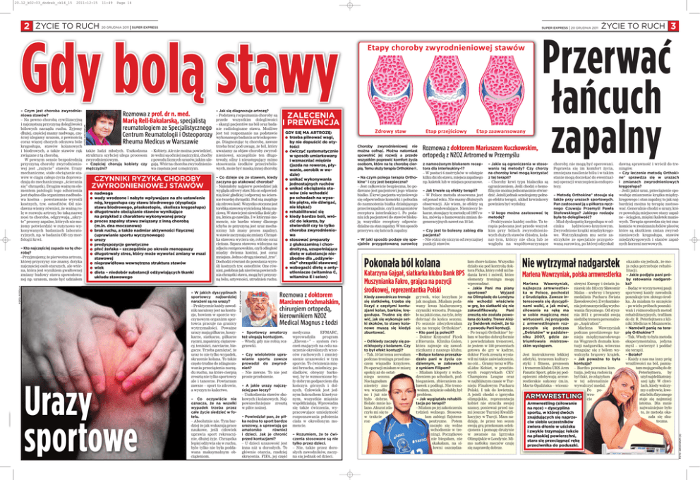 2011-12-15 2 życie to ruch 11:49 Page 14 20 grudnia 2011 SUPER EXPRESS SUPER EXPRESS 20 grudnia 2011 także ludzi młodych. Uszkodzona struktura szybciej ulega procesom zwyrodnieniowym. – Częściej chorują kobiety czy mężczyźni? – Kobiety. Ale nie można powiedzieć, że wolni są od niej mężczyźni, choćby z powodu licznych urazów, jakim ulegają. Wtórna choroba zwyrodnieniowa częstsza jest u mężczyzn. Czynniki ryzyka Choroby zwyrodnieniowej stawów nadwaga wady wrodzone i nabyte wpływające na złe ustawienie nóg, kręgosłupa czy stawu biodrowego (dysplazja stawu biodrowego, płaskostopie, skolioza kręgosłupa) długotrwałe obciążanie stawów wynikające na przykład z charakteru wykonywanej pracy proces zapalny stawu związany z inną chorobą (m.in. dna moczanowa) brak ruchu, a także nadmiar aktywności fizycznej (uprawianie sportu wyczynowego) urazy predyspozycje genetyczne płeć żeńska – szczególnie po okresie menopauzy długotrwały stres, który może wywołać zmiany w mazi stawowej nieprawidłowa wewnętrzna struktura stawów wiek dieta – niedobór substancji odżywiających tkanki układu stawowego FOTO FOTOLIA – kto najczęściej zapada na tę chorobę? –Przyjmujemy, że pierwotna artroza, której przyczyny nie znamy, dotyka najczęściej osób starszych, ale wtórna, która jest wynikiem gwałtownej zmiany budowy stawu spowodowanej np. urazem, może być udziałem Rozmowa z prof. dr n. med. Marią Rell-Bakalarską, specjalistą reumatologiem ze Specjalistycznego Centrum Reumatologii i Osteoporozy Rheuma Medicus w Warszawie Urazy sportowe – jak się diagnozuje artrozę? – Podstawą rozpoznania choroby są przede wszystkim dolegliwości – skargi pacjentów na ból oraz badanie radiologiczne stawu. Możliwe jest też rozpoznanie na podstawie wykonanego badania artroskopowego. Diagnozując tę chorobę, zawsze trzeba brać pod uwagę, że ból, który uważamy za objaw choroby zwyrodnieniowej, szczególnie ten długotrwały, silny i nieustępujący mimo stosowania środków przeciwbólowych, może być maską innej choroby. – Co dzieje się ze stawem, kiedy zaczyna go atakować choroba? – Należałoby najpierw powiedzieć jak wygląda zdrowy staw. Ma on odpowiednią ilość gładkiej i odpornej na ścieranie twardej chrząstki. Pod nią znajduje się zdrowa kość. Wszystko otoczone jest torebką stawową wyścieloną błoną maziową. W stawie jest niewielka ilość płynu, która go nawilża. I w którymś momencie, nie bardzo wiemy dlaczego (chyba że przyczyną jest uraz mechaniczny lub znany proces zapalny), w stawie zaczynają się zmiany. Chrząstka stawowa wyciera się, robi się coraz cieńsza. Szpara stawowa widoczna na zdjęciu rentgenowskim, czyli odległość między dwiema kośćmi, jest coraz mniejsza. Jedna o drugą nieomal „trze”. Dochodzi również do powstania wyrośli kostnych tzw. osteofitów. One również, podobnie jak nierówna powierzchnia chrząstki stawu, mogą być przyczyną bólu, sztywności, utrudnień ruchu. – w jakich dyscyplinach sportowcy najbardziej narażeni są na urazy? – Praktycznie każdy zawodnik narażony jest na kontuzje, bowiem w sporcie wyczynowym organizm sportowca pracuje na granicy wytrzymałości. Poważne urazy mają piłkarze, koszykarze, siatkarze, piłkarze ręczni, zapaśnicy, ciężarowcy, tenisiści, narciarze, biegacze. Trzeba pamiętać, że uraz to nie tylko wypadek, skręcenie kolana. To także często trudne do zdiagnozowania przeciążenia narządu ruchu, na które cierpią zresztą nie tylko sportowcy ale i tancerze. Powtarzam zawsze – sport to zdrowie, a wyczyn to kalectwo. – Co oczywiście nie oznacza, że na wszelki wypadek trzeba przez całe życie siedzieć w fotelu. – Absolutnie nie. Tym bardziej że jak wskazują prace naukowe, jeśli człowiek uprawia sport rekreacyjnie, dłużej żyje. Chrząstka lepiej odżywia się w ruchu, byle tylko nie była poddawana maksymalnym obciążeniom. FOTO ARCHIWUM – Czym jest choroba zwyrodnieniowa stawów? – Na pewno chorobą cywilizacyjną i najczęstszą przyczyną dolegliwości bólowych narządu ruchu. Żyjemy dłużej, częściej mamy nadwagę, częściej ulegamy urazom, z pewnością coraz więcej chorych odczuwa bóle kręgosłupa, stawów kolanowych i biodrowych, a także stawów rąk związane z tą chorobą. W pewnym sensie bezpośrednią przyczyną choroby zwyrodnieniowej jest „zużycie” stawów. Urazy mechaniczne, stałe obciążanie stawów w ciągu całego życia doprowadzają do mechanicznego „ścierania się” chrząstki. Drugim ważnym elementem patologii tego schorzenia jest zbędna dla organizmu nadbudowa kostna – powstawanie wyrośli kostnych, tzw. osteofitów. Od niedawna wiemy również, że ważną rolę w rozwoju artrozy, bo taką nazwę nosi ta choroba, odgrywają „ukryte” procesy zapalne, których nie możemy potwierdzić w rutynowo wykonywanych badaniach laboratoryjnych, np. w badaniu OB czy morfologii krwi. FOTO ARCHIWUM Gdy bolą stawy zaleCenia i prewenCja Gdy się ma artrozę: trzeba pilnować wagi, by nie dopuścić do otyłości ćwiczyć systematycznie w sposób umiarkowany i wzmacniać mięśnie (jazda na rowerze, pływanie, aerobik w wodzie) unikać wykonywania jednostajnych ruchów unikać obciążania stawów (nie wchodzić po schodach na wysokie piętra, nie dźwigać, nie klękać) rehabilitować się kiedy bardzo boli, wrócić do lekarza, by stwierdził czy to tylko choroba zwyrodnieniowa stosować preparaty z glukozaminą i chondroityną, uzupełniające dietę w substancje niezbędne dla „odżywienia” chrząstki stawowej wzbogacić dietę o antyutleniacze (witamina C, witamina E i selen) Rozmowa z doktorem Marcinem Krochmalskim, chirurgiem ortopedą, kierownikiem NZOZ Medical Magnus z Łodzi – sportowcy amatorzy też ulegają kontuzjom. – Wtedy, gdy nie robią rozgrzewki. – Czy wieloletnie uprawianie sportu zawsze prowadzi do zwyrodnień? –