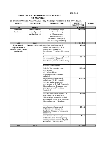 Zał. Nr 5 WYDATKI NA ZADANIA INWESTYCYJNE NA 2007 ROK po zmianach Uchwałą Nr XV/98/2007 Rady Miejskiej w Karczewie z dnia 19.11.2007 r. KOSZTY DZIAŁ ROZDZIAŁ INWESTYCJE INWESTYCJI O10 O1010 Rolnictwo i łowiectwo Infrastruktura wodociągowa i sanitacyjna wsi 400 40002 Wytwarzanie i Dostarczanie wody zaopatrywanie w energię elektryczną, gaz i wodę 1 000 000 modernizacja Stacji uzdatniania wody w Glinkach wraz z modernizacją i rozbudową istniejącej sieci wodociągowej I etap aktualizacja dokumentacji technicznej wodociągu w ul. Karczówek, Ogrodowa, Przechodnia, Trzaskowskich - etap I Budowa wodociagu z przyłaczami ul .Karczówek, Ogrodowa, Przechodnia, Trzaskowskich I etap zmiany 0 1 000 000 1 944 344 43 000 0 400 000 budowa wodociągu na 600 60016 Osiedlu Warszawska wraz z przyłączami ul. Prądzyńskiego, Wysockiego,Chłopickiego zadanie I aktualizacja dokumentacji technicznej (II i III zadanie) budowa wodociągu wraz z przyłaczami w ul. Boh. Powstania Listopadowego- II zadanie oraz 1 przyłącze w ul. Wysockiego (zadanie I) 573 000 budowa sieci wodociągowej Oś. Warszawska w ul. Lelewela, Chłopickiego (na odcinku od ul. Wysockiego do ul. Boh. Powstania Listopadowego) - III zadanie 250 000 650 000 aktualizacja dokumentacji technicznej wodociągu ul. Podlaska, Akacjowa, Wschodnia, Brzozowa 27 000 aktualizacja dokumentacji technicznej sieci wodociągowej wraz z przyłaczami w ul. Dojazd, Kolejkowa i Zakolejkowa 1 344 447 735 0 Transport i łączność 700 Gospodarka mieszkaniowa 750 Administracja publiczna Drogi publiczne aktualizacja dot. dokumentacji technicznej budowy ul. Jagodne i gminne Przemysłowej 20 000 opracowanie dokumentacji technicznej budowy ulic ul. Piłsudskiego (na odcinku od Słowackiego do ul. Mickiewicza) oraz ul. Buczka od ul. Kołłątaja do ul. Sienkiewicza) 28 000 opracowanie dokumentacji projektowo -kosztorysowej budowy ul. Zatylnej, Otwockiej (odc. Leśna - Boh. Westerplatte), Krzewniaka 30 000 opracowanie dokumentacji projektowo- kosztorysowej budowy ul. Leśnej, Gołębiej i Piaski 45 000 opracowanie dokumentacji projektowo-kosztorysowej budowy ul . Żeromskiego, Wyspiańskiego, Chopina, Matejki , Baczyńskiego i Sienkiewicza 99 735 opracowanie dokumentacji projektowo - kosztorysowej budowy ul. Skłodowskiej, Moniuszki, Sucharskiego, Partyzantów, Hubala i Słowackiego 25 000 opracowanie dokumentacji projektowo -kosztorysowej budowy ul. Kołłątaja, Brzóski, Otwocka (odc. Boh. WesterplattePiłsudskiego) i Piłsudskiego (odc. Słowackiego - Kołłtaja) 25 000 Budowa ul. Krótkiej budowa zatoki autobusowej (I etap) w rejonie Publicznego Gimnazjum i organizacja ruchu w tym rejonie miasta 85 000 90 000 70005 opracowanie dokumentacji Gospodarka technicznej oraz prace gruntami i nieruchomościami modernizacyjne związane z wymianą stolarki w budynku Ośrodka Zdrowia w Sobiekursku 75022 Rady gmin (miast i miast na prawach zakup xerokopiarki dla potrzeb Biura Rady Miejskiej powiatu 20 000 20 000 0 1 083 000 7 000 7 000 0 0 75023 Urzędy gmin (miast dokumentacja techniczna Pawilonu Handlowego i miast na modernizacja Pawilonu prawach powiatu Handlowego na cele kulturalne I etap zakup centrali telefonicznej 754 Bezpieczeństwo publiczne i ochrona przeciwpożarowa 801 Oświata i wychowanie 1 076 000 51 000 1 000 000 25 000 40 213 15 213 4 270 75412 Ochotnicze straże zakup karosażu samochodu pożarne zakup pompy pływakowej zakup zestawu R-1 z tlenoterapią 75495 Pozostała działalność słup radarowy 0 0 3 745 7 198 25 000 25 000 36 700 29 000 80101 0 4 000 4 000 Szkoły podstawowe Zakup kotła CO dla Zespołu Szkolno - Przedszkolnego w Sobiekursku zakup maszynki do mielenia mięsa dla Zespołu Szkolno Przedszkolnego w Otwocku Wielkim Zakup kotła CO dla Zespołu Szkolno - Przedszkolnego w Otwocku Wielkim 80104 Przedszkola zakup zmywarki z wyparzaniem oraz podstawy do zmywarki z regulowanymi nóżkami w Gminnym Przedszkolu w Sobiekursku 900 Gospodarka 90001 Kanalizacja deszczowa ul. komunalna i Gospodarka ochrona środowiska ściekowa i ochrona Krakowska wód aktualizacja dokumentacji technicznej kanału sanitarnego w Ul Podlaskiej 12 000 4 000 4 000 13 000 7 700 7 700 0 741 028 599 956 39 000 0 23 956 Wschodniej, Brzozowej, Akacjowej budowa kanalizacji sanitarnej z przykanalikami Ul. Podlaska, Brzozowa, Wschodnia, Akacjowa I etap 525 000 aktualizacja dokumentacji technicznej kanałów sanitarnych w ul. Złotniczej, Ślusarskiej i Stolarskiej wraz z przykanalikami 12 000 90015 Oświetlenie ulic, dokumentacja techniczna placów i dróg modernizacji oświetlenia ulicznego terenu miasta i gminy 57 950 57 950 0 83 122 35 000 0 zakup osprzętu do ciągnika zakup samochodu dostawczego 40 000 zakup pompy na potrzeby przepompowni ścieków przy ul. Chłopickiego w Karczewie 8 122 90095 Pozostała działalność 926 Kultura fizyczna i sport 855 300 540 000 92601 Obiekty sportowe 0 budowa boiska sportowego ogólnodostępnego przy Publicznym Gimnazjum w Karczewie remont podłogi w Miejskiej Hali Sportowej 290 000 zakup rusztowania do wykonywania prac na wysokości w Miejskiej Hali Sportowej 10 300 zakup specjalnych maszyn do czyszczenia parkietu RAZEM 15 000 6 168 320 4 000