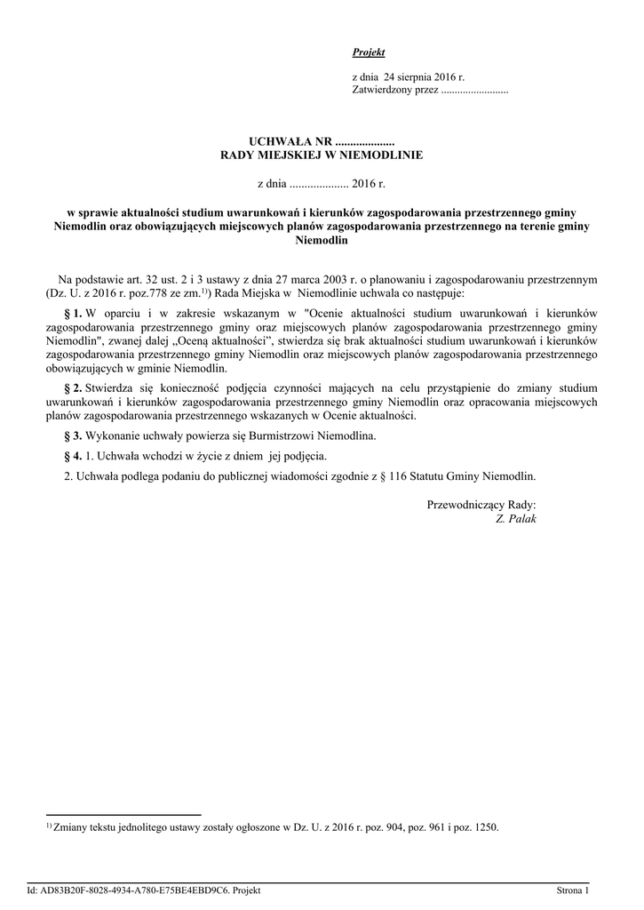 Projekt z dnia 24 sierpnia 2016 r. Zatwierdzony przez ......................... UCHWAŁA NR .................... RADY MIEJSKIEJ W NIEMODLINIE z dnia .................... 2016 r. w sprawie aktualności studium uwarunkowań i kierunków zagospodarowania przestrzennego gminy Niemodlin oraz obowiązujących miejscowych planów zagospodarowania przestrzennego na terenie gminy Niemodlin Na podstawie art. 32 ust. 2 i 3 ustawy z dnia 27 marca 2003 r. o planowaniu i zagospodarowaniu przestrzennym (Dz. U. z 2016 r. poz.778 ze zm.1)) Rada Miejska w Niemodlinie uchwala co następuje: § 1. W oparciu i w zakresie wskazanym w "Ocenie aktualności studium uwarunkowań i kierunków zagospodarowania przestrzennego gminy oraz miejscowych planów zagospodarowania przestrzennego gminy Niemodlin", zwanej dalej „Oceną aktualności”, stwierdza się brak aktualności studium uwarunkowań i kierunków zagospodarowania przestrzennego gminy Niemodlin oraz miejscowych planów zagospodarowania przestrzennego obowiązujących w gminie Niemodlin. § 2. Stwierdza się konieczność podjęcia czynności mających na celu przystąpienie do zmiany studium uwarunkowań i kierunków zagospodarowania przestrzennego gminy Niemodlin oraz opracowania miejscowych planów zagospodarowania przestrzennego wskazanych w Ocenie aktualności. § 3. Wykonanie uchwały powierza się Burmistrzowi Niemodlina. § 4. 1. Uchwała wchodzi w życie z dniem jej podjęcia. 2. Uchwała podlega podaniu do publicznej wiadomości zgodnie z § 116 Statutu Gminy Niemodlin. Przewodniczący Rady: Z. Palak 1) Zmiany tekstu jednolitego ustawy zostały ogłoszone w Dz. U. z 2016 r. poz. 904, poz. 961 i poz. 1250. Id: AD83B20F-8028-4934-A780-E75BE4EBD9C6. Projekt Strona 1 Uzasadnienie Zgodnie z art. 32 ustawy z dnia 27 marca 2003 roku o planowaniu i zagospodarowaniu przestrzennym (Dz. U. z 2016 r. poz. 778 ze zm.) w celu oceny aktualności studium i planów miejscowych burmistrz dokonuje analizy zmian w zagospodarowaniu przestrzennym gminy, ocenia postępy w opracowywaniu planów miejscowych i opracowuje wieloletnie programy ich sporządzania w nawiązaniu do ustaleń studium, z uwzględnieniem decyzji o ustaleniu lokalizacji inwestycji celu publicznego i decyzji o warunkach zabudowy oraz wniosków w sprawie sporządzenia lub zmiany planu miejscowego. Po sporządzeniu analizy zmian w zagospodarowaniu przestrzennym oraz uzyskaniu opinii komisji urbanistyczno-architektonicznej, burmistrz przekazuje Radzie gminy wyniki analiz. Rada gminy podejmuje uchwałę w sprawie aktualności studium i planów miejscowych, a w przypadku uznania ich za nieaktualne w całości lub w części, podejmuje działania prowadzące do zmiany studium lub planów miejscowych. Burmistrz Niemodlina zgodnie z art. 32 ust. 2 ustawy o planowaniu i zagospodarowaniu przestrzennym ma obowiązek wykonywania oceny zachodzących zmian w zagospodarowaniu przestrzennym gminy co najmniej raz w czasie kadencji rady. Burmistrz Niemodlina dokonał oceny aktualności studium uwarunkowań i kierunków zagospodarowania przestrzennego gminy Niemodlin oraz miejscowych planów zagospodarowania przestrzennego na terenie gminy Niemodlin. Ocena aktualności studium uwarunkowań i kierunków zagospodarowania przestrzennego gminy oraz miejscowych planów zagospodarowania przestrzennego gminy Niemodlin przedstawiona została na posiedzeniu Gminnej Komisji Urbanistyczno-Architektonicznej, która zaopiniowała ją pozytywnie. W wyniku dokonanej analizy Studium uwarunkowań i kierunków zagospodarowania przestrzennego gminy Niemodlin uchwalonego uchwałą Nr XVII/110/11 Rady Miejskiej w Niemodlinie z dnia 24.11.2011r., zmienionego w części uchwałą Nr LIII/322/14 Rady Miejskiej w Niemodlinie z dnia 30.01.2014r. ustalono że studium nie spełnia części ustaleń wynikających z art. 10 ust. 1, 2 ustawy tj. w szczególności: nie uwzględnia występujących na terenie gminy wszystkich złóż kopalin, nie wskazuje obszarów szczególnego zagrożenia powodzią zgodnie z obowiązującymi przepisami, nie zawiera: analiz ekonomicznych i możliwości finansowania przez gminę wykonania sieci komunikacyjnej i infrastruktury technicznej, prognoz demograficznych, bilansu terenów przeznaczonych pod zabudowę, uwzględnienia kierunków biorąc pod uwagę audyt krajobrazowy (audytu krajobrazowego dla województwa) oraz zasad ochrony krajobrazu. Ponadto studium nie uwzględnia aktualnie obowiązujących przepisów prawa, w tym aktów prawa miejscowego w zakresie ochrony zabytków (gminny program ochrony zabytków oraz aktualna ewidencja zabytków) oraz obowiązującej koncepcji kanalizacji dla gminy i strategii rozwoju Gminy. Weryfikacji wymaga także wskazanie obszarów dla których przewiduje się rozmieszczenie obszarów, na których ulokowane będą urządzenia wytwarzające energię z odnawialnych źródeł energii o mocy przekraczającej 100kW, a także ich stref ochronnych – dotyczy to w szczególności farm fotowoltaicznych dla których ustalono warunki zabudowy. Dodatkowym problemem jest fakt, że nie sporządzono jeszcze audytu krajobrazowego dla woj. Opolskiego, zatem niemożliwe jest spełnienie wymogów w zakresie kierunków biorąc pod uwagę audyt krajobrazowy. W studium powinny być także zawarte analizy demograficzne i ekonomiczne gminy, a także bilans terenów zgodnie z art. 10 ust. 5. Ponadto zgodnie z art. 10 ust. 7, a określając zapotrzebowanie na nową zabudowę, o którym mowa w ust. 5 pkt 1, bierze się pod uwagę: perspektywę nie dłuższą niż 30 lat, niepewność procesów rozwojowych wyrażającą się możliwością zwiększenia zapotrzebowania w stosunku do wyników analiz nie więcej niż o 30%. Konieczne jest zatem sporządzenie aktualizacji studium w tym zakresie. Jak wynika z dokonanych analiz na potrzeby oceny aktualności w gminie Niemodlin największą część do zainwestowania stanowi zabudowa mieszkaniowa. Tereny istniejącej zabudowy mieszkaniowej i usługowej zajmują ob