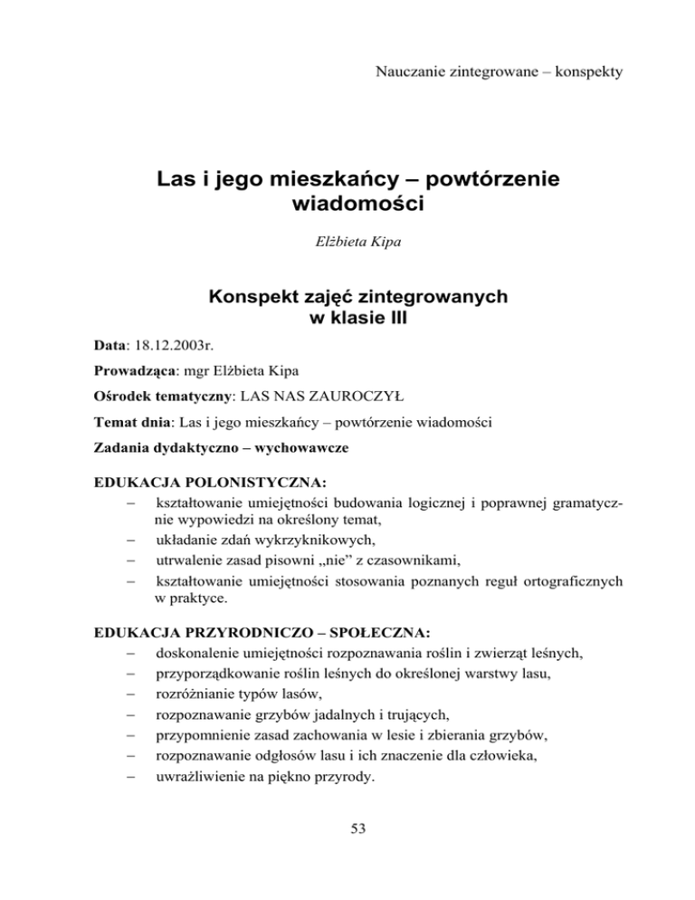 Nauczanie zintegrowane – konspekty Las i jego mieszkańcy – powtórzenie wiadomości Elżbieta Kipa Konspekt zajęć zintegrowanych w klasie III Data: 18.12.2003r. Prowadząca: mgr Elżbieta Kipa Ośrodek tematyczny: LAS NAS ZAUROCZYŁ Temat dnia: Las i jego mieszkańcy – powtórzenie wiadomości Zadania dydaktyczno – wychowawcze EDUKACJA POLONISTYCZNA: − kształtowanie umiejętności budowania logicznej i poprawnej gramatycznie wypowiedzi na określony temat, − układanie zdań wykrzyknikowych, − utrwalenie zasad pisowni „nie” z czasownikami, − kształtowanie umiejętności stosowania poznanych reguł ortograficznych w praktyce. EDUKACJA PRZYRODNICZO – SPOŁECZNA: − doskonalenie umiejętności rozpoznawania roślin i zwierząt leśnych, − przyporządkowanie roślin leśnych do określonej warstwy lasu, − rozróżnianie typów lasów, − rozpoznawanie grzybów jadalnych i trujących, − przypomnienie zasad zachowania w lesie i zbierania grzybów, − rozpoznawanie odgłosów lasu i ich znaczenie dla człowieka, − uwrażliwienie na piękno przyrody. 53 Elżbieta Kipa – Las i jego mieszkańcy – powtórzenie wiadomości. EDUKACJA MATEMATYCZNA: − utrwalenie dodawania i odejmowania sposobem pisemnym, − porządkowanie wyników działań od największego do najmniejszego. EDUKACJA PLASTYCZNO – TECHNICZNA: − doskonalenie umiejętności składania papieru techniką orgiami, − komponowanie drzew liściastych i iglastych zgodnie z instrukcją, − umiejętność dobierania barw zgodnie z określoną porą roku. EDUKACJA MUZYCZNA: − słuchanie odgłosów lasu, − rozpoznawanie dźwięków przyjaznych i hałasu. Metody: a. podające – pogadanka, wyjaśnienie, b. problemowe aktywizujące – gry dydaktyczne, c. eksponujące – pokaz multimedialny, film, d. praktyczne – pokaz, ćwiczenia. Formy pracy: zbiorowa, grupowa, indywidualna. Środki dydaktyczne: prezentacja multimedialna „Las i jego mieszkańcy”, wiersz Wł. Ścisłowskiego pt. „Wycieczka”, koszyk wiklinowy, sylweta drzewa, liście z rozpoczętymi zdaniami, karty z działaniami matematycznymi i rozsypanką sylabową, krzyżówka, wyrazy z lukami – napisy, instrumenty, kółka i gotowe elementy do zajęć plastycznych, kukiełka czarownicy, odznaki „Przyjaciel lasu”. 54 CKPiDN w Mielcu – Zeszyty nauczycielskie – Nr3/2005 PRZEBIEG ZAJĘĆ: 1. 2. Powitanie Podanie tematu zajęć. Rozwiązywanie działań pisemnych. Porządkowanie wyników od największego do najmniejszego. Odczytanie hasła (Las i jego mieszkańcy). 1342 + 739 Las 3. 4. 1796 + 295 i 1022 + 389 934 + 285 1379 + 278 1082 - 265 247 + 58 je go miesz kań cy Wycieczka po lesie – pokaz prezentacji multimedialnej – rośliny leśne. Żywy obraz lasu. Uczniowie uzupełniają wyrazy z lukami (nazwy z trudnościami ortograficznymi) i tworzą warstwy lasu: drzewa – stoją krzewy – wykonują przysiad runo leśne – dzieci siedzą roślin leśnych 5. Grzybobranie. Ustalenie, co trzeba zabrać na grzybobranie (koszyk, atlas grzybów, nożyk) i jakich zasad przestrzegać (nie wyrywać grzybni, zawsze zbierać znane grzyby). Pokaz prezentacji multimedialnej. 6. Zbieranie grzybów. Na tablicy sylweta koszyka, obok nazwy grzybów. Uczniowie przenoszą nazwy grzybów jadalnych do koszyka, a trujących pozostawiają. 7. Rozwiązanie krzyżówki. Praca indywidualna. Odczytanie hasła „Leśne zwierzęta”. 8. 9. Multimedialna prezentacja przedstawicieli zwierząt leśnych. Zagadki o zwierzętach leśnych. Rozwiązywanie zagadek z prezentacji multimedialnej. 10. Znaczenie lasu. Odczytanie i omówienie haseł ze slajdu „Co nam daje las?”. 11. Wiersz pt. „Wycieczka” Wysłuchanie wiersza czytanego przez nauczyciela i jego analiza – wyszukiwanie odpowiednich fragmentów: - O czym należy pamiętać i jak postępować, aby zostać przyjacielem lasu? 55 Elżbieta Kipa – Las i jego mieszkańcy – powtórzenie wiadomości. - Czy bohaterów wiersza można zaliczyć do przyjaciół lasu? 12. Układanie zdań wykrzyknikowych: Czego nie wolno robić w lesie ? Uczniowie otrzymują liście z kartonu z zaczętymi zdaniami. Po dopisaniu zakończenia, odczytują je i przyklejają na sylwecie drzewa na tablicy. Zwracamy uwagę na pisownię przeczenia „nie” z czasownikami. 13. Zabawa w rozpoznawanie odgłosów lasu. Dzieci siedzą w kręgu, mają zamknięte oczy, słuchają odgłosów lasu. Następnie bawią się w strojenie instrumentów. Uczniowie wykorzystują instrumenty perkusyjne i naturalne. Zastanawiają się, jaki wpływ na nasz organizm mają dźwięki przyjazne i hałas? 14. Bajka o wróżce lesie. Nauczyciel trzymając kukiełkę czarownicy, opowiada jak wróżka wyczarowała las. Najpierw wypowiedziała zaklęcie: Ele – mele – lewa – niech wyrosną drzewa! I wyrosły sosny, jodły, świerki, modrzewie. Jaki las wyczarowała? (iglasty) Potem poszła w inne miejsce i znów wypowiedziała zaklęcie: Ele – mele – lewa – niech wyrosną drzewa! I wyrosły dęby, buki, brzozy. Jaki las wyczarowała? (liściasty) Gdy znudziły się jej wyczarowane lasy, pomieszała drzewa i powstał las (mieszany) 15. Prace plastyczne. Las – technika origami na bazie koła – praca grupowa, I grupa – las iglasty zimą, II grupa – las mieszany jesienią, III grupa – las liściasty latem. W czasie pracy dzieci słychać cichą muzykę – śpiew ptaków. 16. Podsumowanie: Znamy las i jego mieszkańców. Wiemy, jak należy zachowywać się w lesie. Otrzymujecie odznakę „Przyjaciel lasu”. Literatura: 1. „Wesoła Szkoła” podręcznik do klasy III, WSiP 56 CKPiDN w Mielcu – Zeszyty nauczycielskie – Nr3/2005 2. 3. 4. 5. 6. 7. 8. 9. „Wesoła Szkoła” karty pracy Ryszard Więckowski „Ćwiczenia słownikowo – frazeologiczne i syntaktyczne w klasach początkowych” „Drzewa – encyklopedia kieszonkowa” Encyklopedia multimedialna PWN Encyklopedia ptaków PWN Biologia PWN Encyklopedia przyrody OPTIMUS