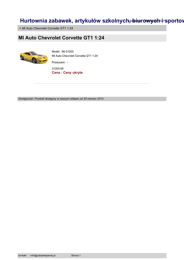 : 03 marzec 2017 Hurtownia zabawek, artykułów szkolnych,Utworzono biurowych i sportow > MI Auto Chevrolet Corvette GT1 1:24 MI Auto Chevrolet Corvette GT1 1:24 Model : MI-31203 MI Auto Chevrolet Corvette GT1 1:24 Producent : 31203 MI Cena : Ceny ukryte Dostępność: Produkt dostępny w naszym sklepie od 20 marzec 2013 kontakt : - [email protected] Strona 1