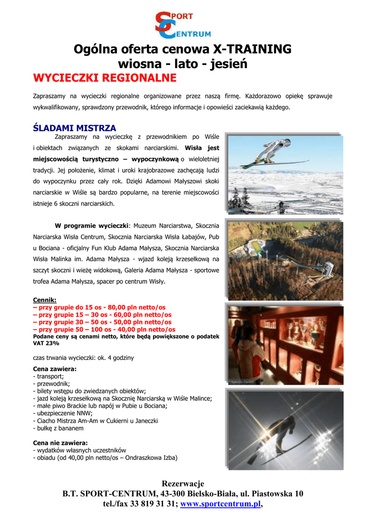Ogólna oferta cenowa X-TRAINING wiosna - lato - jesień WYCIECZKI REGIONALNE Zapraszamy na wycieczki regionalne organizowane przez naszą firmę. Każdorazowo opiekę sprawuje wykwalifikowany, sprawdzony przewodnik, którego informacje i opowieści zaciekawią każdego. ŚLADAMI MISTRZA Zapraszamy na wycieczkę z przewodnikiem po Wiśle i obiektach związanych ze skokami narciarskimi. Wisła jest miejscowością turystyczno – wypoczynkową o wieloletniej tradycji. Jej położenie, klimat i uroki krajobrazowe zachęcają ludzi do wypoczynku przez cały rok. Dzięki Adamowi Małyszowi skoki narciarskie w Wiśle są bardzo popularne, na terenie miejscowości istnieje 6 skoczni narciarskich. W programie wycieczki: Muzeum Narciarstwa, Skocznia Narciarska Wisła Centrum, Skocznia Narciarska Wisła Łabajów, Pub u Bociana - oficjalny Fun Klub Adama Małysza, Skocznia Narciarska Wisła Malinka im. Adama Małysza - wjazd koleją krzesełkową na szczyt skoczni i wieżę widokową, Galeria Adama Małysza - sportowe trofea Adama Małysza, spacer po centrum Wisły. Cennik: – przy grupie do 15 os - 80,00 pln netto/os – przy grupie 15 – 30 os - 60,00 pln netto/os – przy grupie 30 – 50 os - 50,00 pln netto/os – przy grupie 50 – 100 os - 40,00 pln netto/os Podane ceny są cenami netto, które będą powiększone o podatek VAT 23% czas trwania wycieczki: ok. 4 godziny Cena zawiera: - transport; - przewodnik; - bilety wstępu do zwiedzanych obiektów; - jazd koleją krzesełkową na Skocznię Narciarską w Wiśle Malince; - małe piwo Brackie lub napój w Pubie u Bociana; - ubezpieczenie NNW; - Ciacho Mistrza Am-Am w Cukierni u Janeczki - bułkę z bananem Cena nie zawiera: - wydatków własnych uczestników - obiadu (od 40,00 pln netto/os – Ondraszkowa Izba) Rezerwacje B.T. SPORT-CENTRUM, 43-300 Bielsko-Biała, ul. Piastowska 10 tel./fax 33 819 31 31; www.sportcentrum.pl, RAFTING I JASKINIE NA SŁOWACJI Proponujemy Państwu spędzenie całego dnia u naszych sąsiadów Słowaków. Po wczesnym śniadaniu i odebraniu prowiantu wyjeżdżamy z hotelu (8:00) autokarami na Słowację. W czasie ok. 3h docieramy na miejsce - jest to pięknie położona dolina Liptowa otoczona wokół górami – z jednej strony Tatry Wysokie, z drugiej Tatry Niskie, które wcale nie są takie niskie (Chopok). Na początek proponujemy jedną z atrakcji wodnych – Spływ rzeką Vah lub Rafting na profesjonalnym, sztucznym torze raftingowym, a następnie zwiedzanie pięknej Jaskini Wolności. Na zakończenie pobytu na Słowacji odwiedzimy jedną z restauracji w okolicach Liptowskiego Mikulasza gdzie na całą grupę będzie czekał sycący obiad. Spływ Rzeką Vah Grupa po dotarciu autokarem na miejsce spływu (rzeka VAH) przebiera się w stroje neoprenowe. Każdy uczestnik otrzymuje kask oraz kamizelkę asekuracyjną. Następnym punktem jest szkolenie na temat bezpiecznego pływania i manewrowania pontonem. Pierwszy kontakt z wodą jest ważny, można złapać bakcyla lub się zrazić. Prowadzenie pontonu to świetna zabawa, jednak zaczynając walkę z rzeką, musimy być przygotowani na wszystko np: lekką kąpiel... Przed ekipą nie lada wyzwanie – pokonanie kilkunastokilometrowego odcinka rzeki o stopniu trudności WW II do WW III+ w zależności od poziomu wody... Czas trwania spływu ok. 1,5h. Rafting na profesjonalnym, sztucznym torze raftingowym Zapraszamy na profesjonalny tor raftingowy, na którym odbywa się wiele zawodów nawet klasy mistrzowskiej, m.in. w 2003 roku odbyły się Mistrzostwa Europy. Do Państwa dyspozycji są dwa tory – łatwiejszy „Vah” II+ i trudniejszy „Orava” III. Zabawa na torze trwa ok 2,5 godziny. Przed rozpoczęciem pływania każdy z uczestników zostaje Rezerwacje B.T. SPORT-CENTRUM, 43-300 Bielsko-Biała, ul. Piastowska 10 tel./fax 33 819 31 31; www.sportcentrum.pl, wyposażony w kask, wiosło, kamizelkę asekuracyjną oraz kombinezon neoprenowy. Następnie wszyscy przechodzą szkolenie z zasad bezpieczeństwa i sterowania pontonem. Demänovská Jaskinia Slobody Demänovská jaskinia Slobody [Wolności] jest najczęściej zwiedzaną jaskinią na Słowacji. Usytuowana jest w Dolinie Demänovskiej. Odkryto ją w roku 1921 a udostępniono dla zwiedzających w roku 1924. Wejście do jaskini leży na wysokości 870 m n.p.m. Przestrzenie podziemne jaskini wytworzyła rzeczka Demänovka, która płynie w niej na odcinku 2 km Taki fragment jaskini jest udostępniony. Demänovská Jaskinia Slobody posiada ciekawy system korytarzy, podziemnych sieni, budowli, i bogatą dekorację z sopli. W podziemiu można podziwiać stalagmity, stalaktyty, wodospady kamienne, jeziorka z perłami, Przepaść Skoczków, wodospad jaskinny o długości 60m lub organy – zestaw stalagmitów, które po uderzeniu w nie wydają tony gamy. Korytarz Cierpienia nie jest szerszy niż rozpiętość naszych ramion i wysoki 160 cm. Od 1993 roku Demänovská Jaskinia Slobody jest narodowym zabytkiem kulturalnym. Z parkingu do jaskini można poruszać się tylko pieszo, droga trwa około 15 minut. Temperatura w jaskini waha się od 4-6 C, a wilgotność powietrza wynosi 98%. Należy pamiętać o ciepłej odzieży i odpowiednim obuwiu. W jaskini należy pokonać ponad 900 schodów, czeka tam na Państwa wykwalifikowany przewodnik i wykład po polsku. Zwiedzanie jaskini trwa ok. 1,5h. Jaskinia czynna jest przez cały rok z wyjątkiem okresu od połowy listopada do końca grudnia. Cennik: – przy grupie 8 – 15 os – ok. 310,00 pln netto/os – przy grupie 16 – 30 os – ok. 295,00 pln netto/os – przy grupie 31 – 50 os – ok. 270,00 pln netto/os Podane ceny są cenami netto, które będą powiększone o podatek VAT 23% CENY orientacyjne - uzależnione od ilości osób, kursu Euro-PLN. czas trwania wycieczki: cały dzień Cena zawiera: - transport; - przewodnik; Rezerwacje B.T. SPORT-CENTRUM, 43-300 Bielsko-Biała, ul. Piastowska 10 tel./fax 33 819 31 31; www.sportcentrum.pl, - obiad rafting w wy