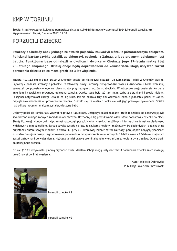 KMP W TORUNIU Źródło: http://www.torun.kujawsko-pomorska.policja.gov.pl/kb3/informacje/wiadomosci/60246,Porzucili-dziecko.html Wygenerowano: Piątek, 3 marca 2017, 19:39 PORZUCILI DZIECKO Strażacy z Chełmży obok jednego ze swoich pojazdów zauważyli wózek z półtorarocznym chłopcem. Policjanci bardzo szybko ustalili, że chłopczyk pochodzi z Zabrza, a jego prawnym opiekunem jest babcia. Funkcjonariusze odnaleźli w okolicach dworca w Chełmży jego 17-letnią matkę i jej 26-letniego znajomego. Dzisiaj oboje będą doprowadzeni do komisariatu. Mogą usłyszeć zarzut porzucenia dziecka za co może grozić do 3 lat więzienia. Wczoraj (12.11.) około godz. 16.00 w Chełmży doszło do nietypowej sytuacji. Do Komisariatu Policji w Chełmży przy ul. Sądowej 2 podeszli strażacy z pobliskiej Państwowej Straży Pożarnej, przyprowadzili wózek z dzieckiem. Chwilę wcześniej zauważyli go pozostawionego na placu straży przy jednym z wozów strażackich. W wózeczku znajdowała się kartka z imieniem i nazwiskiem prawnego opiekuna dziecka. Oprócz tego była też tam m.in. torba z ubrankami i środki higieny. Policjanci natychmiast zaczęli ustalać co się stało. Jak się okazało trzy dni wcześniej jedna z jednostek policji w Zabrzu przyjęła zawiadomienie o uprowadzeniu dziecka. Okazało się, że matka dziecka nie jest jego prawnym opiekunem. Opieka nad półtora rocznym malcem został powierzona babci. Dyżurny policji do komisariatu wezwał Pogotowie Ratunkowe. Chłopczyk został zbadany i trafił do szpitala na obserwację. Nie stwierdzono u niego żadnych zaniedbań ani obrażeń. Rozpoczęło się poszukiwanie osób, które pozostawiły dziecko na placu Straży Pożarnej. Mundurowi natychmiast rozpoczęli poszukiwania wszelkich możliwych informacji na temat wyglądu osób widzianych z tym dzieckiem. Bardzo szybko wyszło na jaw, że szukamy kobiety i mężczyzny. Po około dwóch godzinach na przystanku autobusowym w pobliżu dworca PKP przy ul. Dworcowej jeden z patroli zauważył parę odpowiadającą rysopisowi z ustaleń funkcjonariuszy. Legitymowanie potwierdziło przypuszczenia mundurowych. 17-latka wraz z 26-letnim znajomym zostali zatrzymani do wyjaśnienia. Mężczyzna miał prawie promil alkoholu w organizmie. Kobieta była trzeźwa. Oboje trafili do policyjnego aresztu. Dzisiaj (13.11.) kryminalni planują czynności z ich udziałem. Oboje mogą usłyszeć zarzut porzucenia dziecka za co może jej grozić nawet do 3 lat więzienia. Autor: Wioletta Dąbrowska Publikacja: Wojciech Chrostowski Porzucili dziecko #1 Porzucili dziecko #2 Porzucili dziecko #3 Porzucili dziecko #4 Porzucili dziecko Zainstaluj wtyczkę Flash, aby zobaczyć odtwarzacz. pobierz film - Ocena: 4/5 (1) Tweetnij Chełmża, uprowadzenie
