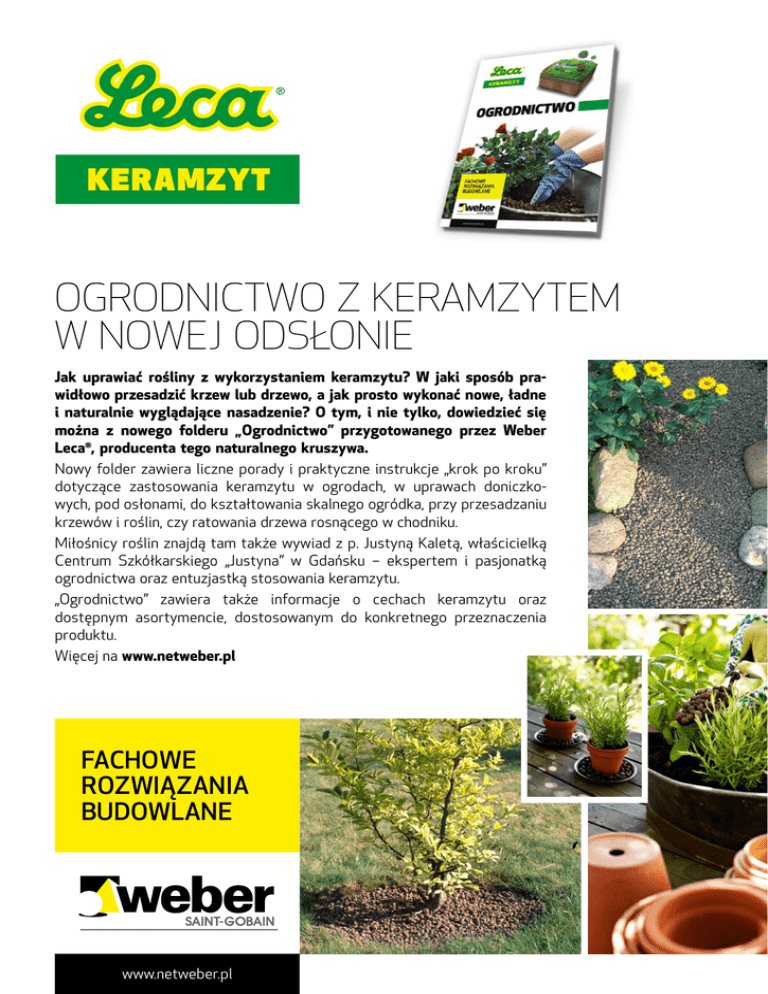 KERAMZYT Ogrodnictwo Z keramzytem w nowej odsłonie Jak uprawiać rośliny z wykorzystaniem keramzytu? W jaki sposób prawidłowo przesadzić krzew lub drzewo, a jak prosto wykonać nowe, ładne i naturalnie wyglądające nasadzenie? O tym, i nie tylko, dowiedzieć się można z nowego folderu „Ogrodnictwo” przygotowanego przez Weber Leca®, producenta tego naturalnego kruszywa. Nowy folder zawiera liczne porady i praktyczne instrukcje „krok po kroku” dotyczące zastosowania keramzytu w ogrodach, w uprawach doniczkowych, pod osłonami, do kształtowania skalnego ogródka, przy przesadzaniu krzewów i roślin, czy ratowania drzewa rosnącego w chodniku. Miłośnicy roślin znajdą tam także wywiad z p. Justyną Kaletą, właścicielką Centrum Szkółkarskiego „Justyna” w Gdańsku – ekspertem i pasjonatką ogrodnictwa oraz entuzjastką stosowania keramzytu. „Ogrodnictwo” zawiera także informacje o cechach keramzytu oraz dostępnym asortymencie, dostosowanym do konkretnego przeznaczenia produktu. Więcej na www.netweber.pl Fachowe rozwiązania budowlane www.netweber.pl