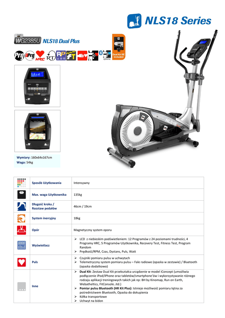 Wymiary: 160x64x167cm Waga: 54kg Sposób Użytkowania Intensywny Max. waga Użytkownika 135kg Długość kroku / Rozstaw pedałów 46cm / 19cm System inercyjny 18kg Opór Magnetyczny system oporu Wyświetlacz LCD z niebieskim podświetleniem: 12 Programów z 24 poziomami trudności, 4 Programy HRC, 5 Programów Użytkownika, Recovery Test, Fitness Test, Program Random Prędkość/RPM, Czas, Dystans, Puls, Watt Puls Czujniki pomiaru pulsu w uchwytach Telemetryczny system pomiaru pulsu – Fale radiowe (opaska w zestawie) / Bluetooth (opaska dodatkowo) Inne Dual Kit: Zestaw Dual Kit przekształca urządzenie w model iConcept (umożliwia podłączenie iPod/iPhone oraz tabletów/smartphone’ów i wykorzystywanie różnego rodzaju aplikacji treningowych takich jak np: BH by Kinomap, Run on Earth, Webatheltics, FitConsole..itd.) Pomiar pulsu Bluetooth (HR Kit Plus): Istnieje możliwość pomiaru tętna za pośrednictwem Bluetooth, Opaska do dokupienia Kółka transportowe Uchwyt na bidon Wymiary: 160x64x167cm Waga: 54kg Sposób Użytkowania Intensywny Max. waga Użytkownika 135kg Długość kroku / Rozstaw pedałów 46cm / 19cm System inercyjny 18kg Opór Magnetyczny system oporu Wyświetlacz LCD z niebieskim podświetleniem: 12 Programów z 24 poziomami trudności, 4 Programy HRC, 5 Programów Użytkownika, Recovery Test, Fitness Test, Program Random Prędkość/RPM, Czas, Dystans, Puls, Watt Puls Czujniki pomiaru pulsu w uchwytach Telemetryczny system pomiaru pulsu – Fale radiowe (opaska w zestawie) Inne Dual Kit do dokupienia: Zestaw Dual Kit przekształca urządzenie w model iConcept (umożliwia podłączenie iPod/iPhone oraz tabletów/smartphone’ów i wykorzystywanie różnego rodzaju aplikacji treningowych takich jak np: BH by Kinomap, Run on Earth, Webatheltics, FitConsole..itd.) Kółka transportowe Uchwyt na bidon Wymiary: 160x64x167cm Waga: 52kg Sposób Użytkowania Regularny Max. waga Użytkownika 135kg Długość kroku / Rozstaw pedałów 46cm / 19cm System inercyjny 16kg Opór Magnetyczny system oporu Wyświetlacz LCD: 12 Programów z 24 poziomami trudności, 4 Programy HRC, 5 Programów Użytkownika, Recovery Test, Fitness Test, Program Random Prędkość/RPM, Czas, Dystans, Puls, Watt Puls Czujniki pomiaru pulsu w uchwytach Telemetryczny system pomiaru pulsu ‐ Bluetooth (opaska dodatkowo) Inne Dual Kit: Zestaw Dual Kit przekształca urządzenie w model iConcept (umożliwia podłączenie iPod/iPhone oraz tabletów/smartphone’ów i wykorzystywanie różnego rodzaju aplikacji treningowych takich jak np: BH by Kinomap, Run on Earth, Webatheltics, FitConsole..itd.) Pomiar pulsu Bluetooth (HR Kit Plus): Istnieje możliwość pomiaru tętna za pośrednictwem Bluetooth, Opaska do dokupienia Kółka transportowe Uchwyt na bidon Wymiary: 160x64x167cm Waga: 52kg Sposób Użytkowania Regularny Max. waga Użytkownika 135kg Długość kroku / Rozstaw pedałów 46cm / 19cm System inercyjny 16kg Opór Magnetyczny system oporu Wyświetlacz LCD: 12 Programów z 24 poziomami trudności, 4 Programy HRC, 5 Programów Użytkownika, Recovery Test, Fitness Test, Program Random Prędkość/RPM, Czas, Dystans, Puls, Watt Puls Czujniki pomiaru pulsu w uchwytach Inne Dual Kit do dokupienia: Zestaw Dual Kit przekształca urządzenie w model iConcept (umożliwia podłączenie iPod/iPhone oraz tabletów/smartphone’ów i wykorzystywanie różnego rodzaju aplikacji treningowych takich jak np: BH by Kinomap, Run on Earth, Webatheltics, FitConsole..itd.) Kółka transportowe Uchwyt na bidon