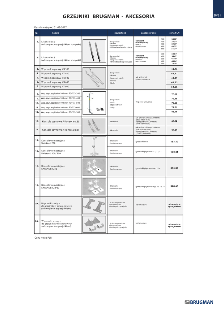20/21 GRZEJNIKI BRUGMAN - AKCESORIA Cennik ważny od 01-02-2017 lp. nazwa 1. L-konsola x 2 (w komplecie z grzejnikiem kompakt) 2. L-konsola x 3 (w komplecie z grzejnikiem kompakt) 3. Wspornik szynowy VK 300 4. Wspornik szynowy VK 400 5. Wspornik szynowy VK 500 6. Wspornik szynowy VK 600 7. Wspornik szynowy VK 900 zawartość zastosowanie cena PLN - 2 wsporniki - 1 korek - 1 odpowietrznik - 1 blokada zabezpieczająca - kompakt (w komplecie) od 400 do 1400 mm 300 400 500 600 900 34,82* 37,31* 39,69* 43,32* 51,71* - 3 wsporniki - 1 korek - 1 odpowietrznik - 1 blokada zabezpieczająca - kompakt (w komplecie) od 1600 do 2200 mm 300 400 500 600 900 52,84* 56,47* 61,18* 64,86* 78,14* 41,73 - 2 wsporniki - 1 korek - 1 odpowietrznik - 2 śruby - 2 kołki 42,41 - vk-universal - piano-universal 54,66 8. Wsp. szyn. szpitalny 100 mm ROFIX - 300 9. Wsp. szyn. szpitalny 100 mm ROFIX - 400 10. Wsp. szyn. szpitalny 100 mm ROFIX - 500 11. Wsp. szyn. szpitalny 100 mm ROFIX - 600 43,09 43,55 70,02 - 2 wsporniki - korek - odpowietrznik - śruby 72,36 - higienic-universal 75,60 77,76 88,56 12. Wsp. szyn. szpitalny 100 mm ROFIX - 900 13. Konsola szynowa J-Konsola (x2) - 2 konsole - vk-universal/ wys. 200 mm (800-1600 mm) - kompakt/ wys. 200 mm (800 - 1600 mm) 66,12 14. Konsola szynowa J-Konsola (x3) - 3 konsole - vk-universal/ wys. 200 mm (1800-3000 mm) - kompakt/ wys. 200 mm (1800 - 3000 mm) 98,55 15. Konsola wolnostojąca Unistand 200 - 2 konsole - 2 osłony stopy - grzejniki mini 187,32 16. Konsola wolnostojąca Unistand 300/ 900 - 2 konsole - 2 osłony stopy - grzejniki płytowe 21 s, 22, 33 180,31 17. Konsole wolnostojące EXPANDER 21S - 2 konsole - 2 osłony stopy - grzejniki płytowe - typ 21 s 355,85 18. Konsole wolnostojące EXPANDER 22/33 - 2 konsole - 2 osłony stopy - grzejniki płytowe - typ 22, 30, 33 378,65 19. Wsporniki stojące do grzejników kolumnowych (w komplecie z grzejnikiem) - liczba wsporników dostosowana do długości grzejnika - kolumnowe 20. Wsporniki wiszące do grzejników kolumnowych (w komplecie z grzejnikiem) Ceny netto PLN - liczba wsporników dostosowana do długości grzejnika - kolumnowe w komplecie z grzejnikiem w komplecie z grzejnikiem GRZEJNIKI BRUGMAN - AKCESORIA Cennik ważny od 01-02-2017 lp. 21. 22. nazwa Szpitalne wsporniki wiszące do grzejników kolumnowych (10 cm) zawartość zastosowanie cena PLN - 2 wsporniki - górny i dolny (liczba wsporników dostosowana do długości grzejnika) - kolumnowe 14,11 - zestaw z korkami 2 szt - płytowe typ 11 18,14 - zestaw z korkami 3 szt - płytowe typ 11 22,68 - universal mini 33,54 - universal mini 134,60 Mocowanie grzejnika płytowego - typ 11 23. UNISET 11 13911630111 24. UNISET 11 F 13911630100 25. UNISET 11 S 13911630131 26. UNISET 11 SF 13911630130 27. Konsole do Mini Standard (22-33) L150 - 1 28. Konsole do Mini Standard (22-33) L200 - 1 29. Konsole do Mini Standard (34-36) L150 - 1 30. Konsole do Mini Standard (34-36) L200 - 1 - wkładka zaworowa Oventrop 101 80 86 - korek - wkładka zaworowa Oventrop 101 80 96 - korek - wkładka zaworowa Oventrop 101 80 83 - korek - wkładka zaworowa Oventrop 101 80 98 - korek - vk-universal - piano-universal 34,50 - vk-universal - piano-universal 172,49 - mini standard typy 22-33, wys. 150, 200 mm 36,75 - mini standard typy 34-36, wys. 150, 200 mm 61,22 - mini kompakt, piano od 800 do 1600 55,44 38,96 - 1 konsola 64,58 31. Konsole do Mini KP, Piano L150 - 2 32. Konsole do Mini KP, Piano L200 - 2 33. Konsole do Mini KP, Piano L150 - 3 34. Konsole do Mini KP, Piano L200 - 3 35. korek - 1 korek - wszystkie grzejniki 2,72* 36. odpowietrznik - 1 odpowietrznik - wszystkie grzejniki 3,63* * ceny akcesoriów przy osobnym zamówieniu - 2 konsole 48,41 - 3 konsole - mini kompakt, piano od 1800 do 3000 83,16 72,66 Ceny netto PLN