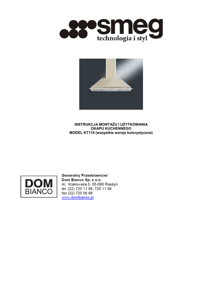 INSTRUKCJA MONTAŻU I UŻYTKOWANIA OKAPU KUCHENNEGO MODEL KT110 (wszystkie wersje kolorystyczne) Dziękujemy za zaufanie i zakup naszego wyrobu. Gratulujemy dokonania dobrego wyboru. Mamy nadzieję, że urządzenie będzie Państwu służyć przez wiele lat. Okap kuchenny jest przeznaczony do stosowania w indywidualnych gospodarstwach domowych i służy do usuwania lub oczyszczania powietrza z substancji powstających podczas gotowania potraw. -1Spis treści 1. Ostrzeżenia podstawowe 2. Działanie okapu 3. Montaż i instalacja 4. Użytkowanie 5. Czyszczenie i obsługa bieżąca 6. Gwarancja i serwis 7. Zgodność z dyrektywami UE 2 3 3 8 10 15 16 -2- 1. OSTRZEŻENIA PODSTAWOWE • Prosimy o uważne zapoznanie się z niniejszą instrukcją przed przystąpieniem do montażu i/lub użytkowania okapu. • Przed podłączeniem okapu do domowej instalacji elektrycznej należy upewnić się, czy parametry prądu w instalacji odpowiadają wymaganym podanym na tabliczce znamionowej. • Po wyjęciu urządzenia z opakowania fabrycznego należy upewnić się, czy nie uległo ono uszkodzeniu. W przypadku uszkodzenia okapu nie wolno go użytkować i należy skontaktować się z serwisem Generalnego Przedstawiciela. • Zaleca się, aby montażu i instalacji dokonała odpowiednio przeszkolona osoba. • Minimalna odległość między dolną powierzchnią okapu a najwyższym punktem płyty kuchennej znajdującej się pod nim wynosił 750 mm (gazowe płyty kuchenne) lub 650 mm (elektryczne kuchenne płyty grzewcze). • Przed przystąpieniem do jakichkolwiek czynności związanych z czyszczeniem i/lub obsługą techniczną okapu należy odłączyć go od domowej instalacji elektrycznej. • Wszystkie filtry należy dokładnie czyścic i obsługiwać zgodnie z zaleceniami podanymi przez producenta. • Pod okapem nie należy przygotowywać potraw flambowanych („płonących”) oraz mogących ulec zapaleniu się, gdyż płomienie mogą zostać zassane do wnętrza urządzenia i doprowadzić do pożaru. • Okap należy czyścić za pomocą wilgotnej szmatki i płynnych detergentów nie zawierających substancji wybielających. • Należy zapewnić właściwą wentylację pomieszczenia, w którym jest zainstalowany okap, w przypadku, gdy w pomieszczeniu są zainstalowane urządzenia zasilane gazem (rozporządzenie Ministra Infrastruktury z dnia 12 kwietnia 2002 r. w sprawie warunków technicznych, jakim powinny odpowiadać budynki i ich usytuowanie, Dz.U. nr 75 z 2002 r., poz. 690 z późniejszymi zmianami i uzupełnieniami). • Podczas użytkowania okapu należy stosować się do obowiązujących zasad wymiany powietrza w pomieszczeniach. • Nie wolno podłączać okapu w wersji wyciąg do kanałów dymowych i spalinowych, którymi usuwane są produkty spalania paliw w innych urządzeniach, niż elektryczne. • Okap nie może być obsługiwany przez dzieci i osoby z ograniczeniami motorycznymi lub psychicznymi, o ile nie znajdują się one pod nadzorem osób dorosłych lub innych odpowiedzialnych za ich bezpieczeństwo. -3Producent i Generalny Przedstawiciel nie ponoszą żadnej odpowiedzialności prawnej i/lub materialnej za straty i szkody, które mogą powstać w wyniku niestosowania się do zaleceń podanych w niniejszej instrukcji. 2. DZIAŁANIE OKAPU Okap jest skonstruowany tak, aby mógł pracować w trybie wyciąg (usuwanie powietrza na zewnątrz pomieszczenia) lub pochłaniacz (oczyszczanie powietrza w pomieszczeniu i kierowanie go ponownie do pomieszczenia. Wersja wyciąg Aby okap działał w trybie wyciągowym należy zespół silnikowy połączyć z otworem ściennym prowadzącym na zewnątrz budynku za pomocą odpowiednich rur o średnicy wewnętrznej nie mniejszej od 120 mm. Uwaga Należy z wnętrza okapu usunąć filtry z węgla aktywowanego. Wersja pochłaniacz Jeżeli nie ma technicznych możliwości usuwania powietrza z pomieszczenia kuchennego na zewnątrz budynku, to okap można przystosować do oczyszczania powietrza i kierowania go z powrotem do pomieszczenia. W tej wersji powietrze jest oczyszczane z niepożądanych substancji za pomocą filtrów z węgla aktywowanego i tłoczone do kuchni przez kratki wylotowe umieszczone na bocznych ściankach maskownicy komina. 3. MONTAŻ I INSTALACJA Okap jest dostarczany wraz ze wszystkimi niezbędnymi do jego instalacji akcesoriami. Minimalna odległość między dolną powierzchnią okapu a najwyższym punktem płyty kuchennej znajdującej się pod nim wynosił 750 mm (gazowe płyty kuchenne) lub 650 mm (elektryczne kuchenne płyty grzewcze – rys. 1 na następnej stronie). -4- Urządzenie jest wyposażone w nakrywę silnika (rys. 2). Nie jest ona fabrycznie połączona z zespołem silnikowym, a jej montaż jest możliwy za pomocą wkrętów wchodzących w skład dostawy (dla nakrywy typu 1) lub zatrzasków (nakrywa typu 2). Jeżeli zespół silnikowy jest wyposażony w zawór zwrotny, to należy upewnić się, czy działa on prawidłowo. -5Montaż należy prowadzić w następujący sposób: a) oś symetrii okapu powinna pokrywać się z krótsza osią symetrii kuchenki (płyty kuchennej), b) w wyposażeniu okapu znajdują się dwa zawiesia (a) – rys. 3, lub uchwyt do zawieszania (b), które należy przymocować do ściany za pomocą odpowiednich kołków rozporowych; odpowiednie otwory L1 pod wkręty znajdują się na tylnej ścianie korpusu okapu, c) zdemontować filtry przeciw tłuszczowe, przyłożyć korpus okapu do ściany i zaznaczyć na niej umieszczenie otworów, d) wywiercić w zaznaczonych miejscach otwory , e) przykręcić zawiesia lub uchwyt do ściany, f) zaznaczyć położenie otworów L2 służących do zainstalowania wkrętów zabezpieczających (rys. 4); wywiercić otwory i umieścić w niuch kołki rozporowe, g) zawiesić okap na uchwytach (rys. 5) i spoziomować korpus wykorzystując w tym celu .śruby regulacyjne (rys. 3a), i) ostatecznie przymocować korpus dokręcając wkręty mocujące zawiesia. -6- 3.1. Wersj