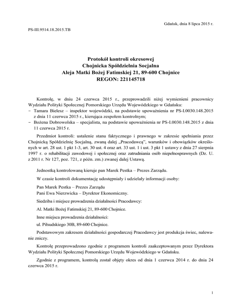 Gdańsk, dnia 8 lipca 2015 r. PS-III.9514.18.2015.TB Protokół kontroli okresowej Chojnicka Spółdzielnia Socjalna Aleja Matki Bożej Fatimskiej 21, 89-600 Chojnice REGON: 221145718 Kontrolę, w dniu 24 czerwca 2015 r., przeprowadzili niżej wymienieni pracownicy Wydziału Polityki Społecznej Pomorskiego Urzędu Wojewódzkiego w Gdańsku: - Tamara Bielesz – inspektor wojewódzki, na podstawie upoważnienia nr PS-I.0030.148.2015 z dnia 11 czerwca 2015 r., kierująca zespołem kontrolnym; - Bożena Dobrowolska – specjalista, na podstawie upoważnienia nr PS-I.0030.148.2015 z dnia 11 czerwca 2015 r. Przedmiot kontroli: ustalenie stanu faktycznego i prawnego w zakresie spełniania przez Chojnicką Spółdzielnię Socjalną, zwaną dalej „Pracodawcą”, warunków i obowiązków określonych w art. 28 ust. 1 pkt 1-3, art. 30 ust. 4 oraz art. 33 ust. 1 i ust. 3 pkt 1 ustawy z dnia 27 sierpnia 1997 r. o rehabilitacji zawodowej i społecznej oraz zatrudniania osób niepełnosprawnych (Dz. U. z 2011 r. Nr 127, poz. 721, z późn. zm.) zwanej dalej Ustawą. Jednostką kontrolowaną kieruje pan Marek Pestka – Prezes Zarządu. W czasie kontroli dokumentację udostępniały i udzielały informacji osoby: Pan Marek Pestka – Prezes Zarządu Pani Ewa Nierzwicka – Dyrektor Ekonomiczny. Siedziba i miejsce prowadzenia działalności Pracodawcy: Al. Matki Bożej Fatimskiej 21, 89-600 Chojnice. Inne miejsca prowadzenia działalności: ul. Piłsudskiego 30B, 89-600 Chojnice. Podstawowym zakresem działalności gospodarczej Pracodawcy jest produkcja świec, nalewanie zniczy. Kontrolę przeprowadzono zgodnie z programem kontroli zaakceptowanym przez Dyrektora Wydziału Polityki Społecznej Pomorskiego Urzędu Wojewódzkiego w Gdańsku. Zgodnie z programem, kontrolą został objęty okres od dnia 1 czerwca 2014 r. do dnia 24 czerwca 2015 r. 1 W trakcie kontroli ustalono, co następuje: 1. Status prawny Pracodawcy: Pracodawca prowadzi działalność na podstawie: - Wpisu do KRS numer 0000372800 Rejestru Przedsiębiorców prowadzonego przez Sąd Rejonowy Gdańsk-Północ w Gdańsku, VIII Wydział Gospodarczy Krajowego Rejestru Sądowego - Decyzji Wojewody Pomorskiego nr D/03/2012 z dnia 30 kwietnia 2012 r. 2. Spełnianie przez Pracodawcę warunków określonych w art. 28 ustawy z dnia 27 sierpnia 1997 r. o rehabilitacji zawodowej i społecznej oraz zatrudniania osób niepełnosprawnych: 1) stan zatrudnienia ogółem: […]*osoby ([..]* etatów), w tym niepełnosprawnych [..]* osób ([.]* etatów). Wszystkie osoby zatrudnione są na podstawie przepisów kodeksu pracy. [..]*osób ([..]*etatów) ma orzeczony umiarkowany stopień niepełnosprawności, [...]*osoby ([.]*etaty) mają orzeczony znaczny stopień niepełnosprawności (zestawienie stanowi tabela nr 3 w załączniku nr 1 do protokołu). Pracodawca przedstawił zespołowi kontrolnemu stan zatrudnienia w losowo wybranym czasie kontrolowanego okresu: informacja o stanie zatrudnienia w miesiącu czerwcu, październiku i grudniu 2014 r. (załącznik nr 2 do protokołu), informacja o stanie zatrudnienia w miesiącu lutym i kwietniu 2015 r. ( tabela nr 1 i 2 w załączniku nr 1 do protokołu). Zespół kontrolny stwierdził, że w okresie poddanym kontroli pracodawca wypełniał warunki zatrudnienia, określone w art. 28 ust. 1 ustawy z dnia 27 sierpnia 1997 r. o rehabilitacji zawodowej i społecznej oraz zatrudniania osób niepełnosprawnych, dla pracodawców posiadających status zakładu pracy chronionej. W trakcie czynności kontrolnych skontrolowano akta osobowe []* losowo wybranych osób niepełnosprawnych zatrudnionych w zakładzie: []*osób mających orzeczony znaczny stopień niepełnosprawności, [.]*osób mających orzeczony umiarkowany stopień niepełnosprawności (zestawienie stanowi załącznik nr 3 do protokołu). We wszystkich aktach osobowych, objętych kontrolą, stwierdza się aktualne umowy o pracę (z treści umowy wynika zakres czynności), aktualne zaświadczenia lekarskie o braku przeciwwskazań zdrowotnych do wykonywania pracy na stanowisku oraz orzeczenia o stopniu niepełnosprawności. 2) wskaźnik zatrudnienia osób niepełnosprawnych wynosi [..]*%, wskaźnik zatrudnienia osób niepełnosprawnych z umiarkowanym lub znacznym stopniem niepełnosprawności wynosi [...]*% (stan na dzień kontroli). Pracodawca przedstawił wskaźniki zatrudnienia w ww. miesiącach kontrolowanego okresu. Zespół kontrolny stwierdził, że w okresie poddanym kontroli pracodawca osiągał wartości wskaźników zatrudnienia, określone w art. 28 ust. 1 pkt 1a 2 ustawy z dnia 27 sierpnia 1997 r. o rehabilitacji zawodowej i społecznej oraz zatrudniania osób niepełnosprawnych, dla pracodawców posiadających status zakładu pracy chronionej. 3) obiekt i pomieszczenia w Chojnicach przy Al. Matki Bożej Fatimskiej 21, użytkowane na podstawie decyzji Państwowej Inspekcji Pracy Inspektora Pracy Okręgowego Inspektoratu Pracy w Gdańsku Oddział w Słupsku nr rej.: 03153-51200-K082-Ao027/11 z dnia 13 grudnia 2011 r., obiekt biurowo – usługowy w Chojnicach przy ul. Piłsudskiego 30B, składający się z 2 pomieszczeń użytkowych wraz z zapleczem socjalnym, użytkowany na podstawie decyzji Państwowej Inspekcji Pracy Oddział w Słupsku nr rej.: 03281-51200-K8-Ao001/15 z dnia 9 lutego 2015 r. Ww. decyzje Państwowej Inspekcji Pracy potwierdzają, że obiekty i pomieszczenia użytkowane przez Pracodawcę, w ramach statusu zakładu pracy chronionej odpowiadają przepisom i zasadom bezpieczeństwa i higieny pracy, uwzględniają potrzeby osób niepełnosprawnych w zakresie przystosowania stanowisk pracy, pomieszczeń higieniczno-sanitarnych i ciągów komunikacyjnych oraz spełniają wymagania dostępności do nich. Wyniki ostatniej kontroli Państwowej Inspekcji Pracy, zakończonej protokołem nr 03208-5317-K080-Pt/14 z dnia 23 grudnia 2014 r., potwierdzają, że obiekty są przystosowane dla potrzeb zatrudnionych osób niepełnosprawnych. Pomieszcz
