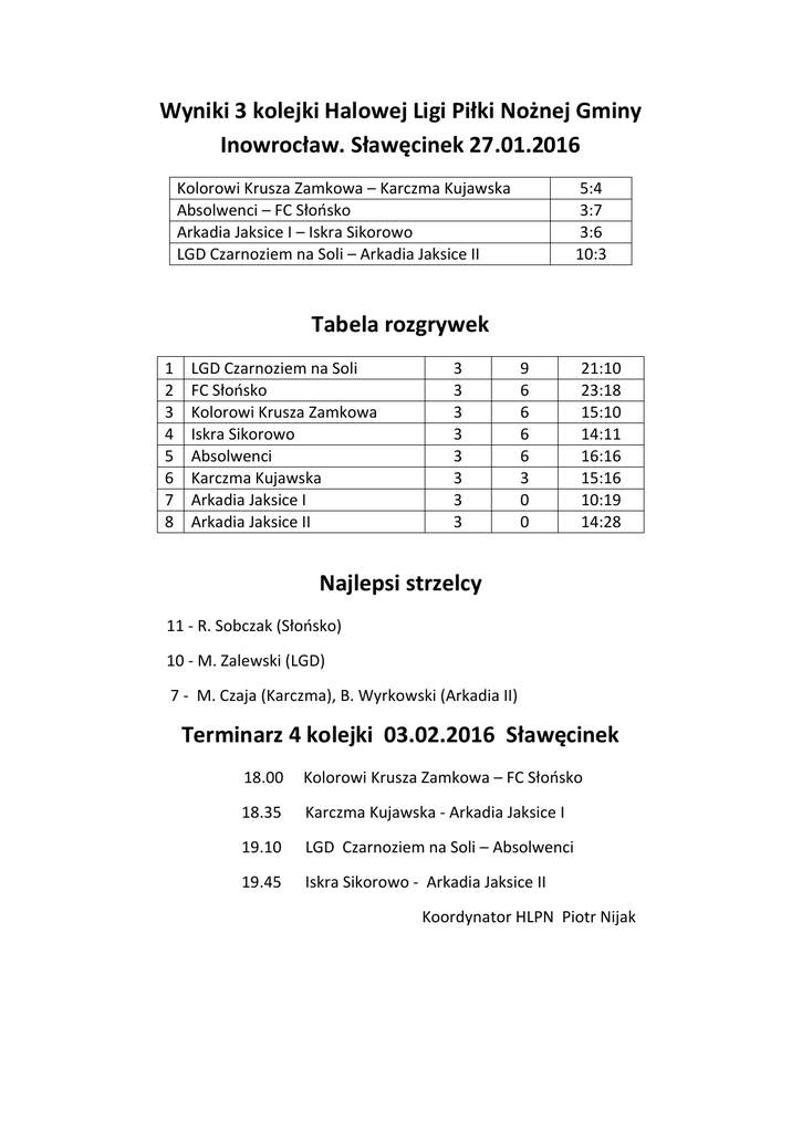 Wyniki 3 kolejki Halowej Ligi Piłki Nożnej Gminy Inowrocław. Sławęcinek 27.01.2016 Kolorowi Krusza Zamkowa – Karczma Kujawska Absolwenci – FC Słońsko Arkadia Jaksice I – Iskra Sikorowo LGD Czarnoziem na Soli – Arkadia Jaksice II 5:4 3:7 3:6 10:3 Tabela rozgrywek 1 2 3 4 5 6 7 8 LGD Czarnoziem na Soli FC Słońsko Kolorowi Krusza Zamkowa Iskra Sikorowo Absolwenci Karczma Kujawska Arkadia Jaksice I Arkadia Jaksice II 3 3 3 3 3 3 3 3 9 6 6 6 6 3 0 0 21:10 23:18 15:10 14:11 16:16 15:16 10:19 14:28 Najlepsi strzelcy 11 - R. Sobczak (Słońsko) 10 - M. Zalewski (LGD) 7 - M. Czaja (Karczma), B. Wyrkowski (Arkadia II) Terminarz 4 kolejki 03.02.2016 Sławęcinek 18.00 Kolorowi Krusza Zamkowa – FC Słońsko 18.35 Karczma Kujawska - Arkadia Jaksice I 19.10 LGD Czarnoziem na Soli – Absolwenci 19.45 Iskra Sikorowo - Arkadia Jaksice II Koordynator HLPN Piotr Nijak