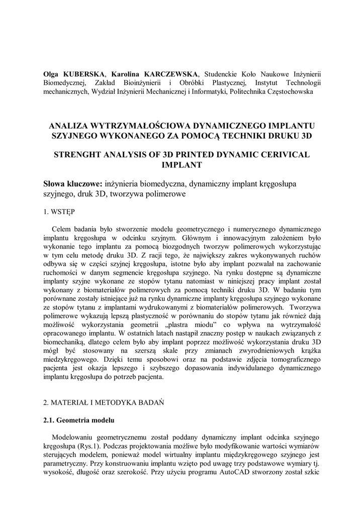 Olga KUBERSKA, Karolina KARCZEWSKA, Studenckie Koło Naukowe Inżynierii Biomedycznej, Zakład Bioinżynierii i Obróbki Plastycznej, Instytut Technologii mechanicznych, Wydział Inżynierii Mechanicznej i Informatyki, Politechnika Częstochowska ANALIZA WYTRZYMAŁOŚCIOWA DYNAMICZNEGO IMPLANTU SZYJNEGO WYKONANEGO ZA POMOCĄ TECHNIKI DRUKU 3D STRENGHT ANALYSIS OF 3D PRINTED DYNAMIC CERIVICAL IMPLANT Słowa kluczowe: inżynieria biomedyczna, dynamiczny implant kręgosłupa szyjnego, druk 3D, tworzywa polimerowe 1. WSTĘP Celem badania było stworzenie modelu geometrycznego i numerycznego dynamicznego implantu kręgosłupa w odcinku szyjnym. Głównym i innowacyjnym założeniem było wykonanie tego implantu za pomocą biozgodnych tworzyw polimerowych wykorzystując w tym celu metodę druku 3D. Z racji tego, że największy zakres wykonywanych ruchów odbywa się w części szyjnej kręgosłupa, istotne było aby implant pozwalał na zachowanie ruchomości w danym segmencie kręgosłupa szyjnego. Na rynku dostępne są dynamiczne implanty szyjne wykonane ze stopów tytanu natomiast w niniejszej pracy implant został wykonany z biomateriałów polimerowych za pomocą techniki druku 3D. W badaniu tym porównane zostały istniejące już na rynku dynamiczne implanty kręgosłupa szyjnego wykonane ze stopów tytanu z implantami wydrukowanymi z biomateriałów polimerowych. Tworzywa polimerowe wykazują lepszą plastyczność w porównaniu do stopów tytanu jak również dają możliwość wykorzystania geometrii „plastra miodu” co wpływa na wytrzymałość opracowanego implantu. W ostatnich latach nastąpił znaczny postęp w naukach związanych z biomechaniką, dlatego celem było aby implant poprzez możliwość wykorzystania druku 3D mógł być stosowany na szerszą skale przy zmianach zwyrodnieniowych krążka miedzykręgowego. Dzięki temu sposobowi oraz na podstawie zdjęcia tomograficznego pacjenta jest okazja lepszego i szybszego dopasowania indywidulanego dynamicznego implantu kręgosłupa do potrzeb pacjenta. 2. MATERIAŁ I METODYKA BADAŃ 2.1. Geometria modelu Modelowaniu geometrycznemu został poddany dynamiczny implant odcinka szyjnego kręgosłupa (Rys.1). Podczas projektowania możliwe było modyfikowanie wartości wymiarów sterujących modelem, ponieważ model wirtualny implantu międzykręgowego szyjnego jest parametryczny. Przy konstruowaniu implantu wzięto pod uwagę trzy podstawowe wymiary tj. wysokość, długość oraz szerokość. Przy użyciu programu AutoCAD stworzony został szkic XIII Konferencja Naukowa Majówka Młodych Biomechaników im. prof. Dagmary Tejszerskiej s. 76 implantu. Następnie projekt wyeksportowano do programu CATIA, gdzie utworzono model 3D. W badaniu rozpatrzone zostały dwa rodzaje geometrii modelu: pierwszy o strukturze wypełnienia gładkiej oraz drugi wypełniony przy pomocy struktury plastra miodu. Po utworzeniu geometrii implantu niezbędne było przekonwertowanie modelu o formatu STL, umożliwiającego wydruk 3D. Rys.1. Model geometryczny dynamicznego implantu szyjnego 2.2 Model materiału W badaniu zastosowano trzy rodzaje materiałów, z których wykonany został implant tj. polilaktyd, poliwęglan oraz polietylen. Wszystkie użyte biomateriały były dobrane zgodnie z przewidzianym zastosowaniem, aby nie pogarszały stanu, bezpieczeństwa oraz zdrowia pacjenta. 2.3 Sposób wykonania implantu Do wytworzenia dynamicznego implantu odcinka szyjnego kręgosłupa zastosowano technikę druku 3D. Z uwagi na fakt, że daje to możliwość wyprodukowania pojedynczego elementu bez konieczności uruchamiania specjalistycznej linii produkcyjnej jest to tanie i przyszłościowe rozwiązanie. Za pomocą techniki druku 3D możliwe jest dostosowywanie wielkości implantu do potrzeb danego pacjenta oraz daje możliwość drukowania zaawansowanych geometrii. 2.3 Ocena wytrzymałościowa konstrukcji implantu Zaprojektowana konstrukcja implantu została poddana analizie wytrzymałościowej pod kątem doboru materiału na elementy składowe oraz wpływu implantu na struktury kostne kręgów w odcinku szyjnym kręgosłupa. LITERATURA [1] Ślimak P., Wolański W., Gzik M.: Wpływ stabilizacji przedniej na biomechanikę odcinka szyjnego kręgosłupa człowieka. Aktualne Problemy Biomechaniki, nr 5/2011, s.165-170 [2] Gzik M.: Identyfikacja sił w strukturach anatomicznych kręgosłupa szyjnego człowieka. Wyd. Politechniki Śląskiej, Gliwice, 2008 [3] Mazgajczyk E., Szymczyk P., Chlebus E.: Zastosowanie technologii Rep-Rap do wytwarzania funkcjonalnych struktur z PLA. Aktualne Problemy Biomechaniki, nr 8/2014, s.109-114
