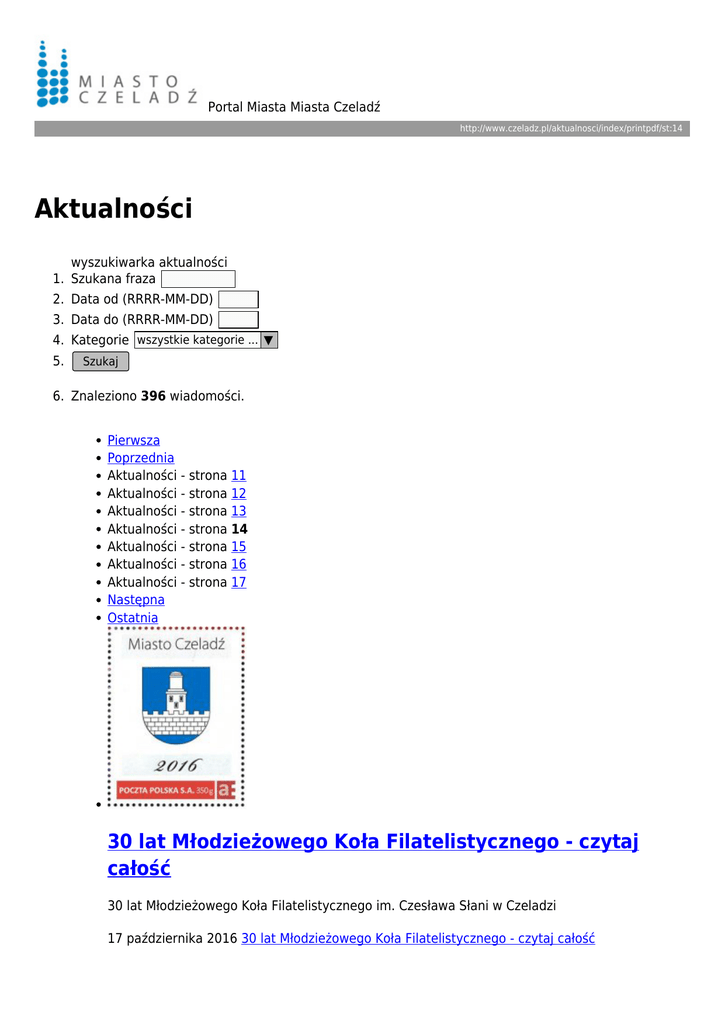 Portal Miasta Miasta Czeladź http://www.czeladz.pl/aktualnosci/index/printpdf/st:14 Aktualności wyszukiwarka aktualności 1. Szukana fraza 2. Data od (RRRR-MM-DD) 3. Data do (RRRR-MM-DD) 4. Kategorie wszystkie kategorie ... ▼ 5. Szukaj 6. Znaleziono 396 wiadomości. Pierwsza Poprzednia Aktualności - strona 11 Aktualności - strona 12 Aktualności - strona 13 Aktualności - strona 14 Aktualności - strona 15 Aktualności - strona 16 Aktualności - strona 17 Następna Ostatnia 30 lat Młodzieżowego Koła Filatelistycznego - czytaj całość 30 lat Młodzieżowego Koła Filatelistycznego im. Czesława Słani w Czeladzi 17 października 2016 30 lat Młodzieżowego Koła Filatelistycznego - czytaj całość Uroczyście zakończyli Rok Pasieczny - czytaj całość W minioną sobotę, 15 października 2016 roku, Zagłębiowski Związek Pszczelarzy zorganizował uroczyste zakończenie Roku Pszczelego. 17 października 2016 Uroczyście zakończyli Rok Pasieczny - czytaj całość Kolejne wyróżnienia w dziedzinie edukacji - czytaj całość 12 października 2016 roku Burmistrz Miasta Czeladź Zbigniew Szaleniec odebrał, drugi raz z rzędu tytuł, "Samorządowego Lidera Edukacji". 14 października 2016 Kolejne wyróżnienia w dziedzinie edukacji - czytaj całość Nie tylko plac zabaw, czyli BO po nowemu - czytaj całość Budżet Obywatelski w Czeladzi, od początku funkcjonowania, jednoznacznie kojarzony jest z inwestycją ściśle związaną z wykorzystaniem działek, należących do samorządu. Tymczasem wydatkowanie środków z budżetu partycypacyjnego daje dużo więcej możliwości. 14 października 2016 Nie tylko plac zabaw, czyli BO po nowemu - czytaj całość Dzień Edukacji Narodowej - czytaj całość Najlepsze życzenia dla wszystkich nauczycieli i pracowników oświaty z okazji Dnia Edukacji Narodowej. 14 października 2016 Dzień Edukacji Narodowej - czytaj całość Czeladź wspiera małe i średnie przedsiębiorstwa - czytaj całość Miasto Czeladź zostało laureatem VI Edycji Programu "Samorząd, który wspiera MŚP". 14 października 2016 Czeladź wspiera małe i średnie przedsiębiorstwa - czytaj całość Zmarła Małgorzata Świder - dyrektor Miejskiego Zespołu Szkół w Czeladzi - czytaj całość Dziś, 12 października zmarła Małgorzata Świder - dyrektor Miejskiego Zespołu Szkół w Czeladzi, ceniony pedagog i wspaniały człowiek. 14 października 2016 Zmarła Małgorzata Świder - dyrektor Miejskiego Zespołu Szkół w Czeladzi - czytaj całość Wojska Napoleona na czeladzkim Rynku - czytaj całość W sobotę, 15 października na czeladzkim Rynku stoczą bitwę wojska napoleońskie i pruskie. 13 października 2016 Wojska Napoleona na czeladzkim Rynku - czytaj całość Mistrzynie z Czeladzi - czytaj całość W sobotę, 08.10.2016 odbyły się Mistrzostwa Europy w Nordic-Walking w Legnicy. Miasto Czeladź miało w nich swoją reprezentację. 13 października 2016 Mistrzynie z Czeladzi - czytaj całość Zostań Liderem SZLACHETNEJ PACZKI - czytaj całość Zarządzanie projektami i ludźmi, umiejętności komunikacyjne i interpersonalne, doświadczenie w organizowaniu dużych wydarzeń, praca w grupie, współpraca z biznesem i wiele innych – chcesz zdobyć cenne na rynku pracy kompetencje? Zostań Liderem SZLACHETNEJ PACZKI lub AKADEMII PRZYSZŁOŚCI 13 października 2016 Zostań Liderem SZLACHETNEJ PACZKI - czytaj całość Pierwsza Poprzednia Aktualności - strona 11 Aktualności - strona 12 Aktualności - strona 13 Aktualności - strona 14 Aktualności - strona 15 Aktualności - strona 16 Aktualności - strona 17 Następna Ostatnia