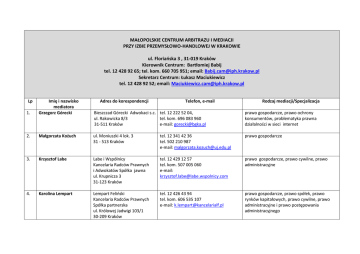 MAŁOPOLSKIE CENTRUM ARBITRAZU I MEDIACJI PRZY IZBIE PRZEMYSŁOWO-HANDLOWEJ W KRAKOWIE ul. Floriańska 3 , 31-019 Kraków Kierownik Centrum: Bartłomiej Babij tel. 12 428 92 65; tel. kom. 660 705 951; email: [email protected] Sekretarz Centrum: Łukasz Maciukiewicz tel. 12 428 92 52; email: [email protected] Lp 1. Imię i nazwisko mediatora Grzegorz Górecki Adres do korespondencji Telefon, e-mail 2. Małgorzata Kożuch ul. Moniuszki 4 lok. 3 31 - 513 Kraków tel. 12 341 42 36 tel. 502 210 987 e-mail: [email protected] prawo gospodarcze 3. Krzysztof Labe Labe i Wspólnicy Kancelaria Radców Prawnych i Adwokatów Spółka jawna ul. Krupnicza 3 31-123 Kraków tel. 12 429 12 57 tel. kom. 507 005 060 e-mail: [email protected] prawo gospodarcze, prawo cywilne, prawo administracyjne 4. Karolina Lempart Lempart Feliński Kancelaria Radców Prawnych Spółka partnerska ul. Królowej Jadwigi 103/1 30-209 Kraków tel. 12 426 43 94 tel. kom. 606 535 107 e-mail: [email protected] prawo gospodarcze, prawo spółek, prawo rynków kapitałowych, prawo cywilne, prawo administracyjne i prawo postępowania administracyjnego Bieszczad Górecki Adwokaci s.c. tel. 12 222 52 04, ul. Rakowicka 8/3 tel. kom. 696 083 960 3 31-511 Kraków e-mail: [email protected] Rodzaj mediacji/Specjalizacja prawo gospodarcze, prawo ochrony konsumentów, problematyka prawna działalności w sieci internet 5. Magdalena Makieła Śledziejowice 361 32-020 Wieliczka tel. kom. 501 148 545 e-mail: [email protected] prawo gospodarcze, prawo cywilne 6. Jerzy Muzyk Kancelaria Radcy Prawnego Jerzy Muzyk ul. Wielopole 32/5 31-072 Kraków tel. 12 429 31 06 tel. kom. 502 206 581 e- mail: [email protected] prawo gospodarcze, prawo ubezpieczeniowe 7. Joanna Wsołek tel. kom. 695 623 745 e-mail: [email protected] prawo gospodarcze, prawo cywilne, prawo ubezpieczeniowe 8. Andrzej Zacharzewski Kancelaria Adwokacka ul. Zaleskiego 16/1 31-525 Kraków „Zacharzewski i Wspólnicy” ul. Wasilewskiego 20/9 30 – 305 Kraków tel. 12 446 78 00 tel. kom. 602 586 720 e-mail: [email protected] prawo gospodarcze, bankowe, obsługa prawna transakcji w handlu międzynarodowym 9. Karol Zawiślak ul. Grunwaldzka 13 31 – 524 Kraków tel. 12 417 40 77 tel. kom. 608 133 948 e-mail: [email protected] prawo gospodarcze, prawo cywilne