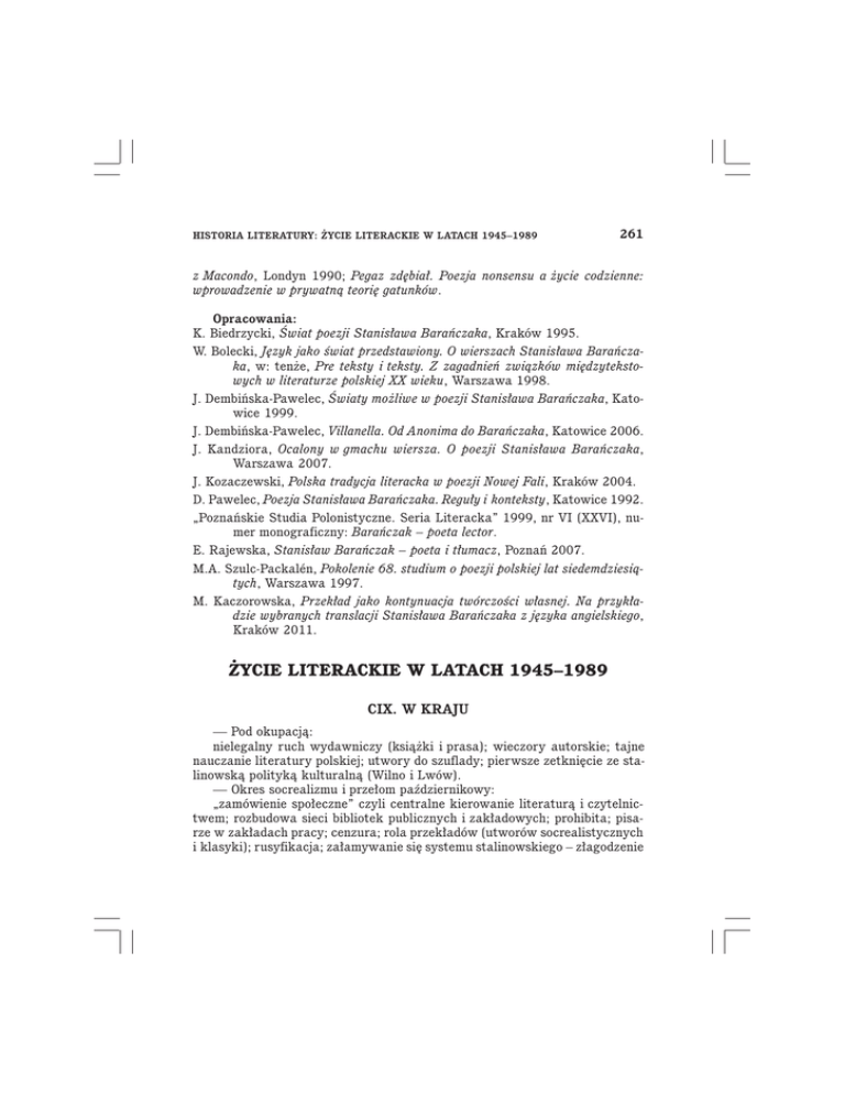 HISTORIA LITERATURY: ŻYCIE LITERACKIE W LATACH 1945–1989 261 z Macondo, Londyn 1990; Pegaz zdębiał. Poezja nonsensu a życie codzienne: wprowadzenie w prywatną teorię gatunków. Opracowania: K. Biedrzycki, Świat poezji Stanisława Barańczaka, Kraków 1995. W. Bolecki, Język jako świat przedstawiony. O wierszach Stanisława Barańczaka, w: tenże, Pre teksty i teksty. Z zagadnień związków międzytekstowych w literaturze polskiej XX wieku, Warszawa 1998. J. Dembińska-Pawelec, Światy możliwe w poezji Stanisława Barańczaka, Katowice 1999. J. Dembińska-Pawelec, Villanella. Od Anonima do Barańczaka, Katowice 2006. J. Kandziora, Ocalony w gmachu wiersza. O poezji Stanisława Barańczaka, Warszawa 2007. J. Kozaczewski, Polska tradycja literacka w poezji Nowej Fali, Kraków 2004. D. Pawelec, Poezja Stanisława Barańczaka. Reguły i konteksty, Katowice 1992. „Poznańskie Studia Polonistyczne. Seria Literacka” 1999, nr VI (XXVI), numer monograficzny: Barańczak – poeta lector. E. Rajewska, Stanisław Barańczak – poeta i tłumacz, Poznań 2007. M.A. Szulc-Packalén, Pokolenie 68. studium o poezji polskiej lat siedemdziesiątych, Warszawa 1997. M. Kaczorowska, Przekład jako kontynuacja twórczości własnej. Na przykładzie wybranych translacji Stanisława Barańczaka z języka angielskiego, Kraków 2011. ŻYCIE LITERACKIE W LATACH 1945–1989 CIX. W KRAJU — Pod okupacją: nielegalny ruch wydawniczy (książki i prasa); wieczory autorskie; tajne nauczanie literatury polskiej; utwory do szuflady; pierwsze zetknięcie ze stalinowską polityką kulturalną (Wilno i Lwów). — Okres socrealizmu i przełom październikowy: „zamówienie społeczne” czyli centralne kierowanie literaturą i czytelnictwem; rozbudowa sieci bibliotek publicznych i zakładowych; prohibita; pisarze w zakładach pracy; cenzura; rola przekładów (utworów socrealistycznych i klasyki); rusyfikacja; załamywanie się systemu stalinowskiego – złagodzenie 262 PRZEWODNIK PO TEMATACH OLIMPIADY LITERATURY I JĘZYKA POLSKIEGO cenzury, nowe tytuły czasopism, przekłady współczesnej literatury zachodniej, łatwiejsze kontakty z wydawnictwami emigracyjnymi, obrachunki ze stalinizmem jako „wypaczeniem socjalizmu”. — Niezależne instytucje literackie w l. 1976–1989: pierwsze czasopisma i książki „poza cenzurą”, wyjście na powierzchnię w l. 1980–1981, rozkwit podziemnego życia literackiego w okresie stanu wojennego – publikacje, nagrody literackie, stypendia dla pisarzy, wieczory autorskie, spektakle, żywa wymiana między krajem a emigracją. Opracowania: L.M. Bartelski, Genealogia ocalonych. Szkice o latach 1939–1944, wyd. 3, Kraków 1974. T. Burek, Zapomniana literatura polskiego Października, w: tenże, Żadnych marzeń, Londyn 1987. J. Czachowska, B. Dorosz, Literatura i krytyka poza cenzurą 1977–1989 (Bibliografia druków zwartych), Wrocław 1992. J. Czachowska, M.K. Maciejewska, T. Tyszkiewicz, Literatura polska i teatr w latach drugiej wojny światowej. Bibliografia, t. 3, Wrocław 1986. O.S. Czarnik, Między dwoma Sierpniami. Polska kultura literacka 1944–1980, Warszawa 1993. M. Głowiński, Nowomowa po polsku, Warszawa 1990. M. Głowiński, Rytuał i demagogia. Trzynaście szkiców o sztuce zdegradowanej, Warszawa 1992. M. Inglot, Polska kultura literacka Lwowa lat 1939–1941. Ze Lwowa i o Lwowie. Lata sowieckiej okupacji w poezji polskiej. Antologia utworów poetyckich w wyborze, Wrocław 1995. Literatura i demokracja. Bezpieczne i niebezpieczne związki, Warszawa 1995. Konspiracyjna publicystyka literacka 1940–1944. Antologia, oprac. Z. Jastrzębski, Warszawa 1973. Z. Jarosiński, Nadwiślański socrealizm, Warszawa 1999. R. Legutko, Bez gniewu i uprzedzenia, Paryż 1989. J. Łukasiewicz, Wiersze w gazetach 1945–1949, Wrocław 1992. J. Kott, Przyczynek do biografii, Londyn 1989 lub Warszawa 1991. A. Michnik, Z dziejów honoru w Polsce. Wypisy więzienne, Paryż 1985 (lub inne wyd.). Cz. Miłosz, Zniewolony umysł, Paryż 1953 lub Kraków 1990. Cz. Miłosz, Strefa chroniona, w: tenże, Ogród nauk, Paryż 1979 lub Lublin 1991. HISTORIA LITERATURY: ŻYCIE LITERACKIE W LATACH 1945–1989 263 T. Nyczek, Powiedz tylko słowo. Szkice literackie wokół „pokolenia 68”, Londyn 1985. A. Paczkowski, Konspiracyjne czasopisma literackie okresu drugiej wojny światowej w kraju, w: Słownik literatury polskiej XX wieku, red. A. Brodzka i in., Wrocław 1993. J. Prokop, Wyobraźnia pod nadzorem. Z dziejów literatury i polityki w PRL, Kraków 1994. M. Puchalska, „Zapis”, w: Słownik literatury polskiej XX wieku, red. A. Brodzka i in., Wrocław 1993. L. Rola [Burska], Samoobrona czy walka o nową treść? O funkcjach „Zapisu” i „Pulsu”, w zbiorze: Literatura źle obecna (Rekonesans), Londyn 1984. J. Sławiński, Krytyka nowego typu, „Wezwanie” 1985 nr 8, (przedr. w: tenże, Teksty i teksty, Warszawa 1990). J. Sławiński, Zanik centrali, „Kresy” 1994, nr 18. J. Smulski, Pękanie lodów, Toruń 1995. J. Święch, Literatura polska w latach II wojny światowej, Warszawa 1997 (rozdz. I-III, s. 15–102). W. Tomasik, Polska powieść tendencyjna 1949–1955: problem perswazji literackiej, Wrocław 1988. W. Tomasik, Słowo o socrealizmie. Szkice, Bydgoszcz 1991. J. Trznadel, Hańba domowa. Rozmowy z pisarzami, Paryż 1986 (lub np. Warszawa 1990). J. Walc, Wolna wałkowa, w: tenże, Wybierane, Warszawa 1989 (Biblioteka „Krytyki”). A. Wat, Mój wiek. Pamiętnik mówiony, przedmowa Cz. Miłosz, oprac. L. Ciołkoszowa, cz. 1–2, Londyn 1977 (lub Warszawa 1990). J. Sławiński, Zanik centrali, „Kresy” 1994, nr 18. G. Wołowiec, Nowocześni w PRL: Przyboś i Sandauer, Wrocław 1999. CX. NA EMIGRACJI — Krąg paryskiej „Kultury”: twórca pisma i jego współpracownicy, historia pisma oraz Instytutu Literackiego, ich rola w kształtowaniu wiedzy i świadomości odbiorców w świecie i ojczyźnie; inicjatywy wydawnicze; akcje w obronie wolnego sł