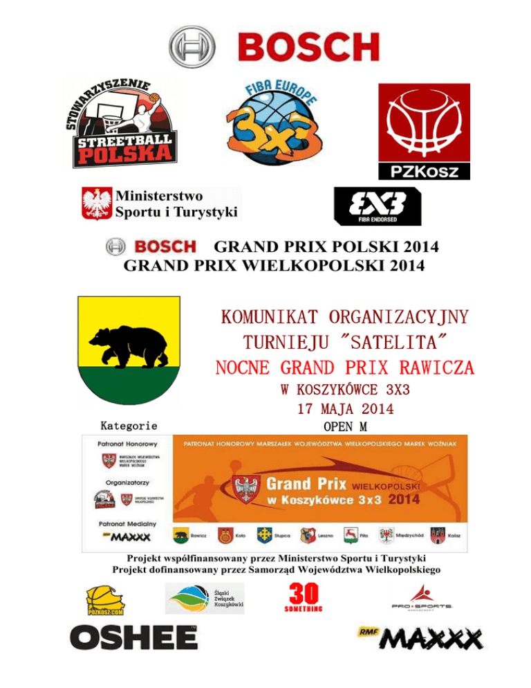 GRAND PRIX POLSKI 2014 GRAND PRIX WIELKOPOLSKI 2014 KOMUNIKAT ORGANIZACYJNY TURNIEJU "SATELITA" "SATELITA" NOCNE GRAND PRIX RAWICZA W KOSZYKÓWCE 3X3 17 MAJA 2014 Kategorie OPEN M Projekt współfinansowany przez Ministerstwo Sportu i Turystyki Projekt dofinansowany przez Samorząd Województwa Wielkopolskiego I. TERMIN I MIEJSCE Turniej jest eliminacją dwóch cykli rozgrywkowych: BOSCH GRAND PRIX POLSKI 2014 GRAND PRIX WIELKOPOLSKI 2014 zostanie rozegrany w dniu 17 maja 2014 roku, od godziny 20:00, na obiektach zaadoptowanych w Miasteczku Festiwalowym 24 godzinnego Rawickiego Festiwalu Sportu przy ul. Marcinkowskiego w Rawiczu. W przypadku niesprzyjających warunków atmosferycznych rozgrywki zostaną przeprowadzone w Hali Sportowej przy ul. Kopernika 9. Początek gier o godzinie 20:00. II. UCZESTNICY Turniej kategorii "SATELITA" prowadzony będzie w kategorii OPEN MĘŻCZYZN. Prawo gry mają wszyscy chętni urodzeni w roku 2000 i starsi po spełnieniu następujących warunków organizacyjnych: osobistym, indywidualnym zarejestrowaniu się na stronie www.3X3planet.com poprzez wejście na stronę www.3X3planet.com/singup, wypełnienie swoich danych i zatwierdzenie ich przyciskiem SING UP - nie dotyczy zawodników już zarejestrowanych - przesłaniu do Stowarzyszenia STREETBALL POLSKA zgłoszenia zespołu poprzez wykorzystanie aktywnego druku zgłoszeń na stronie www.streetballpolska.pl. W zgłoszeniu należy wypełnić wszystkie rubryki podając numer KARTY UCZESTNIKA ZAWODÓW dla każdego członka drużyny. W przypadku kiedy zgłaszani zawodnicy nie posiadają KARTY UCZESTNIKA ZAWODÓW w zgłoszeniu należy pozostawić wolne pole, co automatycznie stanowić będzie złożenie wniosku o wydanie KARTY UCZESTNIKA ZAWODÓW. Podczas weryfikacji przed turniejem każdy zawodnik nie posiadający KARTY UCZESTNIKA ZAWODÓW otrzyma do podpisu wniosek o jej wydanie i po zaakceptowaniu wniosku i dokonaniu opłaty w wysokości 10,00 złotych otrzyma KARTĘ. UWAGA!!! Zawodniczki/cy niepełnoletni muszą podczas weryfikacji dostarczyć wypełniony i podpisany druk zgody opiekunów prawnych, który stanowi załącznik do Regulaminu KARTY UCZESTNIKA ZAWODÓW dostępny na stronie www.streetballpolska.pl w dziale REGULAMINY. W turnieju mają prawo udziału drużyny klubowe, szkolne, instytucjonalne lub swobodnie stowarzyszone, których wszyscy zawodnicy/czki, dopełnią powyższych formalności. W przypadku startu drużyn klubowych lub szkolnych nie ogranicza się ilości zespołów reprezentujących dany klub lub szkołę. Turniej ma formę otwartą dla wszystkich zespołów z terenu naszego kraju oraz zagranicy, które spełniają wymagania regulaminowe /Regulamin BOSCH GRAND PRIX POLSKI 2014 oraz Regulamin GRAND PRIX WIELKOPOLSKI 2014 w koszykówce 3X3 dostępny na stronie www.streetballpolska.pl/. III. ZGŁOSZENIA Zgłoszenia do turnieju przyjmowane są wyłącznie drogą elektroniczną przy pomocy aktywnego druku zgłoszeń na stronie www.streetballpolska.pl. Termin zgłoszeń upływa 14 maja br. o godzinie 21:00. przyjmowane. Po tym terminie żadne zgłoszenia nie będą IV. SYSTEM ROZGRYWEK Turniej w zależności od ilości zgłoszonych zespołów zostanie przeprowadzony systemem eliminacji w grupach i fazy play off do wyłonienia zwycięzców lub innym systemem, który gwarantuje każdemu zespołowi rozegranie minimum trzech spotkań w turnieju. V. PRZEPISY Turniej rozgrywany będzie według przepisów gry 3x3 FIBA wersji 2014/szczegółowa treść przepisów na stronie www.streetballpolska.pl w dziale przepisy/. VI. ZASADY KWALIFIKACJI DO TURNIEJU FINAŁOWEGO Zespoły startujące w cyklu BOSCH GRAND PRIX POLSKI 2014 w turnieju eliminacyjnym "SATELITA" walczą o kwalifikację do turnieju finałowego oraz punkty do klasyfikacji generalnej. W kategorii OPEN MĘŻCZYZN z turnieju NOCNE GRAND PRIX RAWICZA zespoły zajmujące miejsca 1 - 2 kwalifikują się do turnieju finałowego a zespoły zajmujące miejsca 3 - 8 otrzymują punkty do klasyfikacji generalnej według klucza: III miejsce - 10 pkt, IV miejsce 7 pkt, miejsca V-VIII - 5 pkt, wszyscy pozostali uczestnicy 1 pkt. W przypadku zajęcia miejsca premiowanego awansem do turnieju finałowego przez zespół, który wcześniej wywalczył kwalifikację z tego miejsca żaden zespół nie zdobywa kwalifikacji a w puli finałowej powiększa się liczbę miejsc dla drużyn uzyskujących kwalifikację z najlepszych miejsc w klasyfikacji generalnej BOSCH GRAND PRIX POLSKI 2014. Zespoły startujące w cyklu GRAND PRIX WIELKOPOLSKI 2014 w turnieju eliminacyjnym "SATELITA" walczą o kwalifikację do turnieju finałowego oraz punkty do klasyfikacji generalnej. W kategorii OPEN MĘŻCZYZN z turnieju NOCNE GRAND PRIX RAWICZA zespoły zajmujące miejsce 1 kwalifikują się do turnieju finałowego a zespoły zajmujące miejsca 2 - 8 otrzymują punkty do klasyfikacji generalnej według klucza: II miejsce - 10 pkt, III miejsce - 7 pkt, IV miejsce - 5 pkt, miejsca V-VIII - 3 pkt, wszyscy pozostali uczestnicy 1 pkt. W przypadku zajęcia miejsca premiowanego awansem do turnieju finałowego przez zespół, który wcześniej wywalczył kwalifikację z tego miejsca żaden zespół nie zdobywa kwalifikacji a w puli finałowej powiększa się liczbę miejsc dla drużyn uzyskujących kwalifikację z najlepszych miejsc w klasyfikacji generalnej GRAND PRIX WIELKOPOLSKI 2014. VII. KONKURSY W trakcie trwania rozgrywki finałowej przeprowadzone zostaną dwa konkursy otwarte w rzutach za 3 punkty i w rzutach osobistych. Zgłoszenia do konkursów można będzie dokonywać w biurze zawodów. Organizator zastrzega sobie prawo do ograniczenia liczby uczestników w konkursach. VIII. NAGRODY KATEGORIA OPEN MĘŻCZYZN - I MIEJSCE - awans do finału BOSCH GRAND PRIX POLSKI 2014, awans do finału GRAND PRIX WIELKOPOLSKI 2014, nagroda finansowa w wysokości 1000,00 złotych i pamiątkowe statuetki dla każdego zawodnika - II MIEJSCE - awans do finału BOSCH GRAND PRIX POLSKI 2014 i nagrody