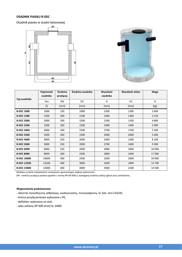 OSADNIK PIASKU B-DEC Osadnik piasku w studni betonowej Pojemność osadnika Średnica przyłączy Średnica osadnika Wysokość osadnika Wysokość wlotu Waga Vos DN D2 H H1 G [l] [mm] [mm] [mm] [mm] [kg] B-DEC 1000 1000 150 1000 2200 1300 2 600 B-DEC 1500 1500 200 1200 2300 1300 4 150 B-DEC 2000 2000 200 1500 2100 1100 4 800 B-DEC 2500 2500 200 1500 2400 1400 5 000 B-DEC 3000 3000 200 1500 2700 1700 5 300 B-DEC 3500 3500 200 1500 3000 2000 5 600 B-DEC 4000 4000 250 2000 2400 1300 8 100 B-DEC 5000 5000 250 2000 2700 1600 9 300 B-DEC 6000 6000 250 2000 3000 1900 10 000 B-DEC 8000 8000 300 2500 2800 1600 17 000 B-DEC 10000 10000 300 2500 3200 2000 19 000 B-DEC 12500 12500 400 3000 3200 1800 13 700 B-DEC 15000 15000 400 3000 3500 2100 14 500 Typ osadnika Możliwe są także indywidualne rozwiązania, gwarantujące większe pojemności. DN - średnica przyłączy podana zgodnie z normą PN-EN 858-2, wymaganą średnicę należy zgłosić przy zamówieniu. Wyposażenie podstawowe: - zbiornik monolityczny żelbetowy, wodoszczelny, mrozoodporny, kl. bet. min.C35/45, - króćce przyłączeniowe wykonane z PE, - deflektor wykonany ze stali, - właz żeliwny DP 600 [mm] kl. D400. www.ekoivent.pl 17