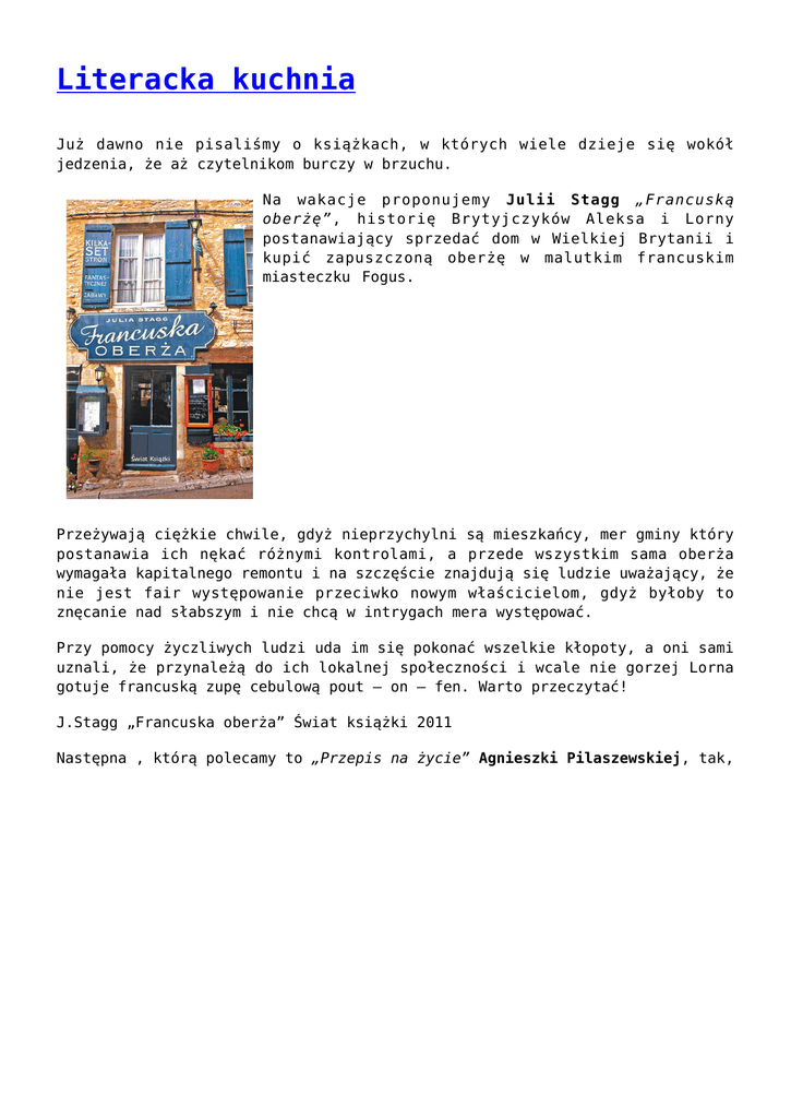Literacka kuchnia Już dawno nie pisaliśmy o książkach, w których wiele dzieje się wokół jedzenia, że aż czytelnikom burczy w brzuchu. Na wakacje proponujemy Julii Stagg „Francuską oberżę”, historię Brytyjczyków Aleksa i Lorny postanawiający sprzedać dom w Wielkiej Brytanii i kupić zapuszczoną oberżę w malutkim francuskim miasteczku Fogus. Przeżywają ciężkie chwile, gdyż nieprzychylni są mieszkańcy, mer gminy który postanawia ich nękać różnymi kontrolami, a przede wszystkim sama oberża wymagała kapitalnego remontu i na szczęście znajdują się ludzie uważający, że nie jest fair występowanie przeciwko nowym właścicielom, gdyż byłoby to znęcanie nad słabszym i nie chcą w intrygach mera występować. Przy pomocy życzliwych ludzi uda im się pokonać wszelkie kłopoty, a oni sami uznali, że przynależą do ich lokalnej społeczności i wcale nie gorzej Lorna gotuje francuską zupę cebulową pout – on – fen. Warto przeczytać! J.Stagg „Francuska oberża” Świat książki 2011 Następna , którą polecamy to „Przepis na życie” Agnieszki Pilaszewskiej, tak, tak tej scenarzystki z serialu o tym samym tytule. W książce wiele jest przepisów na masę frykasów np. zupę z dyni, warto poznać bo przecież zbliża się IV Festiwal Dyniowy, a przede wszystkim zbliża się jesień. Cebulę pokroić, zeszklić na odrobinie oliwy, dodać obraną i pokrojoną dynię, dolać tyle wody, żeby przykryła warzywa, posolić, dodać kostkę rosołową, wrzucić pół papryczki chili. Kiedy dynia się rozgotuje warzywa zmiksować, potem dodać czosnek, świeżą startą gałkę muszkatołową śmietanę, imbir i zioła. Posypać z wierzchu pestkami dyni i udekorować gałązką świeżych ziół do dekoracji. Albo przepis na „sos pomidorowy do mięs” w końcu jest na to sezon, warto z nim się zapoznać, a przyda się nieraz: Pomidory sparzyć wrzątkiem, obrać ze skóry, usunąć gniazda nasienne, paprykę podpiec przez 15 minut w piekarniku o temp. 200° C, wyjąć, ostudzić, obrać ze skórki. Pokroić i wrzucić do blendera z migdałami (pół garści), chili, czosnkiem, papryką sproszkowaną , skórką cytryny. Zmiksować, zachowując grudkowatą teksturę, dodać pieprzu, soli, kilka kropli octu winnego, odrobiny bazylii, pietruszki i gotowe. Bohaterce Ance – zwariowanej matce Mani, zawsze się udaje, gdyż miała pasję do gotowania, dzięki niej znajduje pracę po rozwodzie. Książka jest świetna, tak jak serial, a przepisy łatwe do wykonania i dostępna jest w naszej bibliotece. Dla młodych kucharzy, proponujemy przepis z najnowszej książki Agnieszki Tyszki – przypomnijmy naszego gościa z imprezy „Książki na walizkach” „Mejle na miotle”, opisującej perypetie licealistki Amandy – kochającej flamenco oraz imprezy i niestety to wszystko wpłynęło, że bohaterka ma poprawkę z historii, której nie cierpi, za karę wysyła ją surowy ojciec do ciotki Sydonii, ponurej, kościstej baby, pozbawionej poczucia humoru, ale od czego jest przyjaciółka Kornelia, uzdolniona literacko humanistka. Ciotka wspólnie z Amandą smażyły kwiaty dzikiego bzu , w cieście i był to przysmak dzieciństwa,przekazywany z pokolenia na pokolenie, smażyła ciotce babcia, mama, aż w końcu Amanda się nauczyła i wcale nie jest to skomplikowane, opłukane i osuszone kwiaty zanurzało się w czymś co przypomina ciasto naleśnikowe, a potem ta breja ląduje na patelni i jak to określiła Amanda, każdy na swoje osobliwe kulinarne gusta. Warto popróbować i przeczytać książkę, gdyż akcja jest intrygująca, a opisy o czarownicach bardzo działają na wyobraźnię. I wypada uwierzyć, że nadprzyrodzone moce są po właściwej stronie. Wakacje mogą sprzyjać nie tylko czytaniu, ale też żeby trochę poeksperymentować w kuchni a ,że jest wszystko w książkach to ułatwia nam życie.