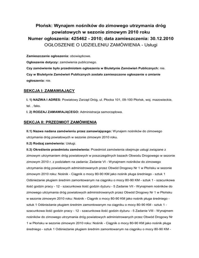 Płońsk: Wynajem nośników do zimowego utrzymania dróg powiatowych w sezonie zimowym 2010 roku Numer ogłoszenia: 425462 - 2010; data zamieszczenia: 30.12.2010 OGŁOSZENIE O UDZIELENIU ZAMÓWIENIA - Usługi Zamieszczanie ogłoszenia: obowiązkowe. Ogłoszenie dotyczy: zamówienia publicznego. Czy zamówienie było przedmiotem ogłoszenia w Biuletynie Zamówień Publicznych: nie. Czy w Biuletynie Zamówień Publicznych zostało zamieszczone ogłoszenie o zmianie ogłoszenia: nie. SEKCJA I: ZAMAWIAJĄCY I. 1) NAZWA I ADRES: Powiatowy Zarząd Dróg, ul. Płocka 101, 09-100 Płońsk, woj. mazowieckie, tel. , faks. I. 2) RODZAJ ZAMAWIAJĄCEGO: Administracja samorządowa. SEKCJA II: PRZEDMIOT ZAMÓWIENIA II.1) Nazwa nadana zamówieniu przez zamawiającego: Wynajem nośników do zimowego utrzymania dróg powiatowych w sezonie zimowym 2010 roku. II.2) Rodzaj zamówienia: Usługi. II.3) Określenie przedmiotu zamówienia: Przedmiot zamówienia obejmuje usługi związane z zimowym utrzymaniem dróg powiatowych w poszczególnych bazach Obwodu Drogowego w sezonie zimowym 2010 r. z podziałem na zadania: Zadanie VI - Wynajmem nośników do zimowego utrzymania dróg powiatowych administrowanych przez Obwód Drogowy Nr 1 w Płońsku w sezonie zimowym 2010 roku: Nośnik - Ciągnik o mocy 80-90 KM jako nośnik pługa średniego - sztuk 1 Odśnieżanie pługiem średnim zamontowanym na ciągniku o mocy 80-90 KM - sztuk 1 - szacunkowa ilość godzin pracy - 12 - szacunkowa ilość godzin dyżuru - 5 Zadanie VII - Wynajmem nośników do zimowego utrzymania dróg powiatowych administrowanych przez Obwód Drogowy Nr 1 w Płońsku w sezonie zimowym 2010 roku: Nośnik - Ciągnik o mocy 80-90 KM jako nośnik pługa średniego sztuk 1 Odśnieżanie pługiem średnim zamontowanym na ciągniku o mocy 80-90 KM - sztuk 1 szacunkowa ilość godzin pracy - 12 - szacunkowa ilość godzin dyżuru - 5 Zadanie VIII - Wynajmem nośników do zimowego utrzymania dróg powiatowych administrowanych przez Obwód Drogowy Nr 1 w Płońsku w sezonie zimowym 2010 roku: Nośnik - Ciągnik o mocy 80-90 KM jako nośnik pługa średniego - sztuk 1 Odśnieżanie pługiem średnim zamontowanym na ciągniku o mocy 80-90 KM - sztuk 1 - szacunkowa ilość godzin pracy - 12 - szacunkowa ilość godzin dyżuru - 5 Zadanie X Wynajmem nośników do zimowego utrzymania dróg powiatowych administrowanych przez Obwód Drogowy Nr 1 w Płońsku w sezonie zimowym 2010 roku: Nośnik - Ciągnik o mocy 60 KM z rozsypywaczem RCW - 3 i pługiem lekkim - sztuk 1 Uszorstnienie nawierzchni przy użyciu rozsypywacza RCW - 3 współpracującego z ciągnikiem o mocy 60 KM z zamontowanym pługiem lekkim - sztuk 1 - szacunkowa ilość godzin pracy - 15 - szacunkowa ilość godzin dyżuru - 5 Zadanie XI - Wynajem nośników do zimowego utrzymania dróg powiatowych administrowanych przez Obwód Drogowy Nr 2 w Raciążu w sezonie zimowym 2010 roku: Nośnik - Samochód o masie 10-12 Mg jako nośnik pod pług lekki - sztuk 1 Odśnieżanie pługiem lekkim zamontowanym na samochodzie o masie 10-12 Mg - sztuk 1 - szacunkowa ilość godzin dyżuru - 5 Zadanie XII Wynajem nośników do zimowego utrzymania dróg powiatowych administrowanych przez Obwód Drogowy Nr 2 w Raciążu w sezonie zimowym 2010 roku: Samochód o masie powyżej 20 Mg jako nośnik pod pług średni - sztuk 1 Odśnieżanie pługami średnimi zamontowanymi na samochodzie o masie powyżej 20 Mg - sztuk 1 - szacunkowa ilość godzin pracy - 12 Zadanie XIII - Wynajem nośników do zimowego utrzymania dróg powiatowych administrowanych przez Obwód Drogowy Nr 2 w Raciążu w sezonie zimowym 2010 roku: Nośnik - Samochód o masie powyżej 20 Mg jako nośnik pod pług średni - sztuk 1 Odśnieżanie pługami średnimi zamontowanymi na samochodzie o masie powyżej 20 Mg - sztuk 1 - szacunkowa ilość godzin dyżuru - 5 Zadanie XIV - Wynajem nośników do zimowego utrzymania dróg powiatowych administrowanych przez Obwód Drogowy Nr 2 w Raciążu w sezonie zimowym 2010 roku: Nośnik - Ciągnik o mocy 80-90 KM jako nośnik pługa średniego - sztuk 1 Odśnieżanie pługiem średnim zamontowanym na ciągniku o mocy 80-90 KM sztuk 1 - szacunkowa ilość godzin pracy - 12 - szacunkowa ilość godzin dyżuru - 5 Zadanie XV Wynajem nośników do zimowego utrzymania dróg powiatowych administrowanych przez Obwód Drogowy Nr 2 w Raciążu w sezonie zimowym 2010 roku: Nośnik - Ciągnik o mocy 80-90 KM jako nośnik pługa średniego - sztuk 1 Odśnieżanie pługiem średnim zamontowanym na ciągniku o mocy 80-90 KM - sztuk 1 - szacunkowa ilość godzin pracy - 12 - szacunkowa ilość godzin dyżuru - 5 Zadanie XVI - Wynajem nośników do zimowego utrzymania dróg powiatowych administrowanych przez Obwód Drogowy Nr 2 w Raciążu w sezonie zimowym 2010 roku: Nośnik - Ciągnik o mocy 60 KM jako nośnik pługa lekkiego - sztuk 1 Odśnieżanie pługiem lekkim zamontowanym na ciągniku o mocy 60 KM - sztuk 1 - szacunkowa ilość godzin pracy - 12 - szacunkowa ilość godzin dyżuru - 5 Przedmiot zamówienia obejmuje również wszystkie prace i obowiązki wykonawcy wymienione we wzorze umowy i warunkach ogólnych dla umów na wykonanie prac związanych z zimowym utrzymaniem dróg oraz specyfikacją techniczną robót zimowego utrzymania dróg. UWAGA: Rozliczenie za wykonanie zadania nastąpi z faktycznie wykonanych usług objętych przedmiotem zamówienia w poszczególnych zadaniach potwierdzonych przez Kierownika właściwego Obwodu Drogowego.. II.4) Wspólny Słownik Zamówień (CPV): 90.62.00.00-9, 90.63.00.00-2. SEKCJA III: PROCEDURA III.1) TRYB UDZIELENIA ZAMÓWIENIA: Zamówienie z wolnej ręki III.2) INFORMACJE ADMINISTRACYJNE Zamówienie dotyczy projektu/programu finansowanego ze środków Unii Europejskiej: nie SEKCJA IV: UDZIELENIE ZAMÓWIENIA Część NR: 1 Nazwa: Zadanie VI - Wynajmem nośników do zimowego utrzymania dróg powiatowych administrowanych przez Obwód Drogowy Nr 1 w Płońsku w sezonie zimowym 2010 r