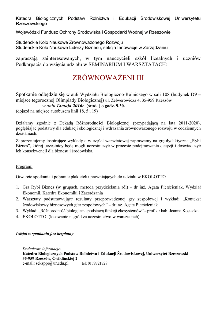 Katedra Biologicznych Rzeszowskiego Podstaw Rolnictwa i Edukacji Środowiskowej Uniwersytetu Wojewódzki Fundusz Ochrony Środowiska i Gospodarki Wodnej w Rzeszowie Studenckie Koło Naukowe Zrównoważonego Rozwoju Studenckie Koło Naukowe Liderzy Biznesu, sekcja Innowacje w Zarządzaniu zapraszają zainteresowanych, w tym nauczycieli szkół licealnych i uczniów Podkarpacia do wzięcia udziału w SEMINARIUM I WARSZTATACH: ZRÓWNOWAŻENI III Spotkanie odbędzie się w auli Wydziału Biologiczno-Rolniczego w sali 108 (budynek D9 – miejsce tegorocznej Olimpiady Biologicznej) ul. Zelwerowicza 4, 35-959 Rzeszów w dniu 18maja 2016r. (środa) o godz. 9.30. (dojazd na miejsce autobusem linii 18, 5 i 19) Działamy zgodnie z Dekadą Różnorodności Biologicznej (przypadającą na lata 2011-2020), pogłębiając podstawy dla edukacji ekologicznej i wdrażania zrównoważonego rozwoju w codziennych działaniach. Zaprezentujemy inspirujące wykłady a w części warsztatowej zapraszamy na grę dydaktyczną „Rybi Biznes”, której uczestnicy będą mogli uczestniczyć w procesie podejmowania decyzji i doświadczyć ich konsekwencji dla biznesu i środowiska. Program: Otwarcie spotkania i pobranie plakietek uprawniających do udziału w EKOLOTTO 1. Gra Rybi Biznes (w grupach, metodą przydzielania ról) – dr inż. Agata Pierścieniak, Wydział Ekonomii, Katedra Ekonomiki i Zarządzania 2. Warsztaty podsumowujące rezultaty przeprowadzonej gry zespołowej i wykład: „Kontekst środowiskowy biznesowych gier zespołowych” – dr inż. Agata Pierścieniak 3. Wykład: „Różnorodność biologiczna podstawą funkcji ekosystemów” – prof. dr hab. Joanna Kostecka 4. EKOLOTTO (losowanie nagród za uczestnictwo w warsztatach) Udział w spotkaniu jest bezpłatny Dodatkowe informacje: Katedra Biologicznych Podstaw Rolnictwa i Edukacji Środowiskowej, Uniwersytet Rzeszowski 35-959 Rzeszów, Ćwiklińskiej 2 e-mail: [email protected] tel: 0178721728 Prosimy o potwierdzenie udziału w Warsztatach elektronicznie do dnia 15.05.2016. na adres: [email protected] oczekując potwierdzenia zgłoszenia Potwierdzam uczestnictwo w SEMINARIUM i WARSZTATACH: ZRÓWNOWAŻENI III w dniu 18 maja 2016. Nazwisko i imię nauczyciela ……………………………………………………..……. Szkoła …………………………………………………………………………..……… Uczniowie (koniecznie podać liczbę osób zainteresowanych uczestnictwem) …………