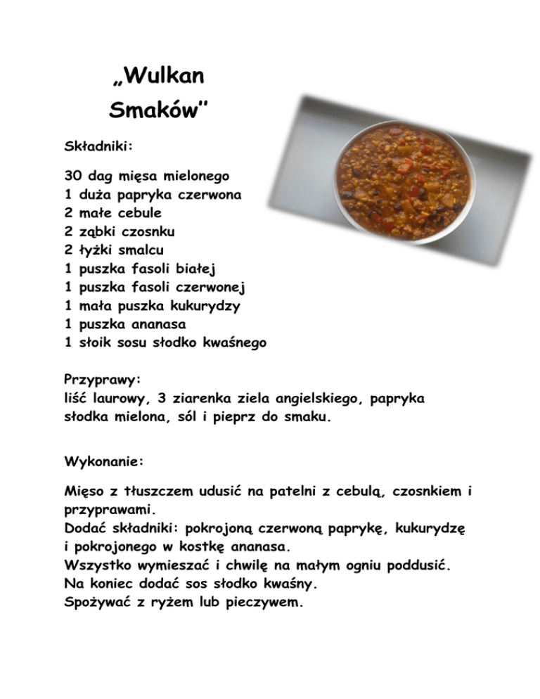 „Wulkan Smaków’’ Składniki: 30 dag mięsa mielonego 1 duża papryka czerwona 2 małe cebule 2 ząbki czosnku 2 łyżki smalcu 1 puszka fasoli białej 1 puszka fasoli czerwonej 1 mała puszka kukurydzy 1 puszka ananasa 1 słoik sosu słodko kwaśnego Przyprawy: liść laurowy, 3 ziarenka ziela angielskiego, papryka słodka mielona, sól i pieprz do smaku. Wykonanie: Mięso z tłuszczem udusić na patelni z cebulą, czosnkiem i przyprawami. Dodać składniki: pokrojoną czerwoną paprykę, kukurydzę i pokrojonego w kostkę ananasa. Wszystko wymieszać i chwilę na małym ogniu poddusić. Na koniec dodać sos słodko kwaśny. Spożywać z ryżem lub pieczywem.