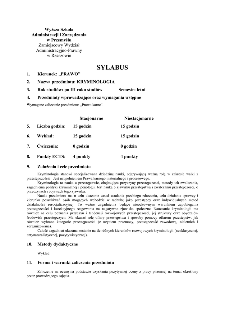WyŜsza Szkoła Administracji i Zarządzania w Przemyślu Zamiejscowy Wydział Administracyjno-Prawny w Rzeszowie SYLABUS 1. Kierunek: „PRAWO” 2. Nazwa przedmiotu: KRYMINOLOGIA 3. Rok studiów: po III roku studiów 4. Przedmioty wprowadzające oraz wymagania wstępne Semestr: letni Wymagane zaliczenie przedmiotu: „Prawo karne”. Stacjonarne Niestacjonarne 5. Liczba godzin: 15 godzin 15 godzin 6. Wykład: 15 godzin 15 godzin 7. Ćwiczenia: 0 godzin 0 godzin 8. Punkty ECTS: 4 punkty 4 punkty 9. ZałoŜenia i cele przedmiotu Kryminologia stanowi specjalizowana dziedzinę nauki, odgrywającą waŜną rolę w zakresie walki z przestępczością. Jest uzupełnieniem Prawa karnego materialnego i procesowego. Kryminologia to nauka o przestępstwie, obejmująca przyczyny przestępczości, metody ich zwalczania, zagadnienia polityki kryminalnej i penologii. Jest nauką o zjawisku przestępstwa i zwalczaniu przestępczości, o przyczynach i objawach tego zjawiska. Nauka przedmiotu ma n celu ukazanie zasad ustalania przebiegu zdarzenia, celu działania sprawcy i kierunku poszukiwań osób mogących wchodzić w rachubę jako przestępcy oraz indywidualnych metod działalności resocjalizacyjnej. To waŜne zagadnienia będące nieodzownym warunkiem zapobiegania przestępczości i korekcyjnego reagowania na negatywne zjawiska społeczne. Nauczanie kryminologii ma równieŜ na celu poznania przyczyn i tendencji rozwojowych przestępczości, jej struktury oraz obyczajów środowisk przestępczych. Ma ukazać rolę ofiary przestępstwa i sposoby pomocy ofiarom przestępstw, jak równieŜ wybrane kategorie przestępczości (z uŜyciem przemocy, przestępczość zawodową, nieletnich i zorganizowaną). Całość zagadnień ukazana zostanie na tle róŜnych kierunków rozwojowych kryminologii (neoklasycznej, antynaturalistycznej, pozytywistycznej). 10. Metody dydaktyczne Wykład 11. Forma i warunki zaliczenia przedmiotu Zaliczenie na ocenę na podstawie uzyskania pozytywnej oceny z pracy pisemnej na temat określony przez prowadzącego zajęcia. 12. Treści programowe Lp. I II III IV V VI VII VIII IX Liczba godzin stacjonarne wykład ćwiczenia Tematyka zajęć pojęcie kryminologii; najwaŜniejsze działy kryminologii; kryminologia klasyczna – podstawowe załoŜenia; kryminologia pozytywistyczna: a) kierunek biopsychologiczny – przegląd najwaŜniejszych teorii (teorie antropologiczne, koncepcje dziedziczenia skłonności do zachowań aspołecznych, koncepcje nawiązujące do zaburzeń chromosomów lub ośrodkowego układu nerwowego, koncepcje typów psychosomatycznych, teorie nieprawidłowej osobowości); b) kierunek socjologiczny (koncepcja ekologiczne, strukturalne, zróŜnicowania kulturowego, uczenia się zachowań przestępnych, teorie kontroli – koncepcje E. Durkheima); kryminologia antynaturalistyczna – przegląd podstawowych teorii (teoria naznaczenia społecznego, koncepcje odwołujące się do konfliktu społecznego, nurt fenomenologiczny); kryminologia neoklasyczna – główne załoŜenia (sprawiedliwa odpłata, wolna wola, ekonomiczna teoria przestępczości) i przedstawiciele (A. Von Hirsch, E. van den Haag, J. Q. Wilson); 6) podstawy statystyki kryminalnej; szczególne kategorie przestępczości: z uŜyciem przemocy, zawodowa, zorganizowana, nieletnich; kara pozbawienia wolności jako środek resocjalizacji; przestępczość na tle innych patologii społecznych, tj. alkoholizm czy narkomania 1 1 1 2 1 1 1 2 2 2 2 2 2 2 2 2 2 2 13. Literatura podstawowa 1. 2. 3. 4. J. Błachut, A. Gaberle, K. Krajewski, Kryminologia, Gdańsk 2003 B. Hołyst, Kryminologia, wyd. 6-te, Warszawa 2000; Siemaszko, Teorie dewiacji, Warszawa 1989; Siemaszko, Granice tolerancji, Warszawa 1993; 14. Liczba godzin niestacjonarne wykład ćwiczenia Literatura uzupełniająca 1. K. Ostrowska, D. Wójcik, Teorie kryminologiczne, Warszawa 1986 2. E. Pływaczewski (red.), Aktualne problemy prawa karnego i kryminologii, Białystok 1998 3. J. Malec, Przestępczość – to ciekawe zjawisko. Kryminologia nieelitarna, Warszawa 2006 15. Nazwisko osoby prowadzącej zajęcia na studiach stacjonarnych - wykład: dr hab. J. Świtka - ćwiczenia: 16. Nazwisko osoby prowadzącej zajęcia na studiach niestacjonarnych - wykład: dr hab. J. Świtka - ćwiczenia:
