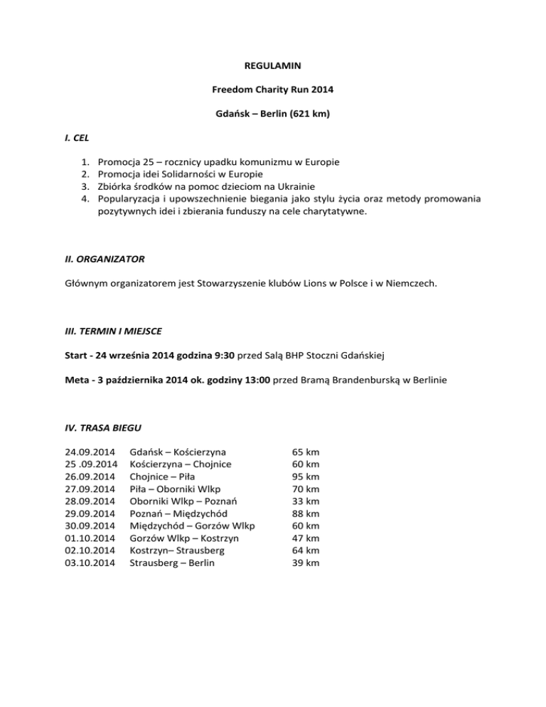 REGULAMIN Freedom Charity Run 2014 Gdańsk – Berlin (621 km) I. CEL 1. 2. 3. 4. Promocja 25 – rocznicy upadku komunizmu w Europie Promocja idei Solidarności w Europie Zbiórka środków na pomoc dzieciom na Ukrainie Popularyzacja i upowszechnienie biegania jako stylu życia oraz metody promowania pozytywnych idei i zbierania funduszy na cele charytatywne. II. ORGANIZATOR Głównym organizatorem jest Stowarzyszenie klubów Lions w Polsce i w Niemczech. III. TERMIN I MIEJSCE Start - 24 września 2014 godzina 9:30 przed Salą BHP Stoczni Gdańskiej Meta - 3 października 2014 ok. godziny 13:00 przed Bramą Brandenburską w Berlinie IV. TRASA BIEGU 24.09.2014 25 .09.2014 26.09.2014 27.09.2014 28.09.2014 29.09.2014 30.09.2014 01.10.2014 02.10.2014 03.10.2014 Gdańsk – Kościerzyna Kościerzyna – Chojnice Chojnice – Piła Piła – Oborniki Wlkp Oborniki Wlkp – Poznań Poznań – Międzychód Międzychód – Gorzów Wlkp Gorzów Wlkp – Kostrzyn Kostrzyn– Strausberg Strausberg – Berlin 65 km 60 km 95 km 70 km 33 km 88 km 60 km 47 km 64 km 39 km V. UCZESTNICY Bieg ma formę otwartą. Każdy kto chce uczestniczyć w przedsięwzięciu może przyłączyć się w każdej chwili i na dowolnym odcinku. Udział jest bezpłatny (dzieci i osoby niepełnoletnie powinny załączyć zgodę rodziców lub opiekunów), ale organizatorzy zwracają się do potencjalnych uczestników o dobrowolne datki na cel charytatywny biegu, pomoc dla dzieci na Ukrainie. W biegu może wziąć udział każdy, komu jest bliska idea wolnej i demokratycznej Europy bez granic. Udział jest bezpłatny, ale organizatorzy zwracają się do potencjalnych uczestników z apelem o dobrowolne datki na cel charytatywny biegu. Dzieci szkolne: 5 PLN Pozostali uczestnicy: 20 PLN Za dodatkowe 20 PLN można kupić pamiątkową koszulkę z nadrukiem. VI. ZGŁOSZENIA • • Zgłoszenia drogą elektroniczną przyjmowane do 22.09.2014. Koszulki można zamawiać do 10.09.2014r. VII.OPŁATY Dobrowolne opłaty na cele charytatywne z dopiskiem „datek charytatywny” prosimy wpłacać na konto: Okręg 121 POLSKA Międzynarodowego Stowarzyszenia Klubów Lions 61-545 Poznań, ul. Krzyżowa 7/1 Bank: BNP Paribas Bank Polska S.A. O/Poznań 61-569 Poznań, ul. Wierzbięcice 1 Swift code: PPABPLPK 84 1600 1084 0004 0503 6264 6196 Nr konta w EURO: 29 1600 1084 0004 0503 6264 6022 Nr konta w USD: 56 1600 1084 0004 0503 6264 6021 Wpłaty za koszulki prosimy wpłacać na to samo konto z dopiskiem „koszulka, rozmiar __” UWAGA: W tytule przelewu proszę dopisać „bieg FCR 2014”. VIII. KWALIFIKACJE Udział w biegu to symboliczne wsparcie idei biegu i celu charytatywnego. Organizatorzy nie dokonują pomiaru czasu i nie prowadzą żadnej klasyfikacji. Nie liczy się czas, liczy się wspólny bieg w tym samym kierunku. IX. NAGRODY I WYRÓŻNIENIA Każdy uczestnik biegu bez względu na dystans otrzyma drogą elektroniczną certyfikat. 2. Każdy, kto wykupi minimum 1 kilometr biegu otrzyma: koszulkę techniczną Puma z pamiątkowym nadrukiem, książkę „Droga do Wolności” z autografem prof. L. Balcerowicza, certyfikat, a także zostanie umieszczony w księdze pamiątkowej biegu opublikowanej w internecie. Jeśli chcesz zachować anonimowość prosimy o zaznaczenie tego na wpłacie. 3. Każdy z pierwszych 100 zapisanych uczestników biegu w Gdańsku i Poznaniu oraz pierwszych 50 zapisanych uczestników biegu w pozostałych miejscowościach na trasie, ma możliwość wykupienia książki „Droga do Wolności” z autografem prof. L. Balcerowicza w cenie 10 PLN. Wszyscy pozostali uczestnicy mogą zamówić tę książkę wraz z autografem w cenie 20 PLN. 4. Wśród uczestników każdego z etapów zostanie rozlosowane obuwie biegowe marki PUMA. 1. X. POSTANOWIENIA KOŃCOWE 1. Zawodnicy uczestniczący w biegu startują na własną odpowiedzialność i ponosi związane z tym ryzyko. Organizatorzy nie biorą na siebie jakiejkolwiek odpowiedzialności za stan zdrowia uczestnika oraz niekorzystne zdarzenia jakie mogą mieć miejsce podczas biegu. 2. Każdy zawodnik ubezpiecza się indywidualnie. 3. Uczestnicy biegu przyjeżdżają na miejsce startu, nocują i odżywiają się na własny koszt. 4. Wpłaty na cele charytatywne lub za koszulkę nie podlegają zwrotowi i są niezależne od uczestnictwa. 5. Organizatorzy nie zapewniają posiłków regeneracyjnych i napojów.