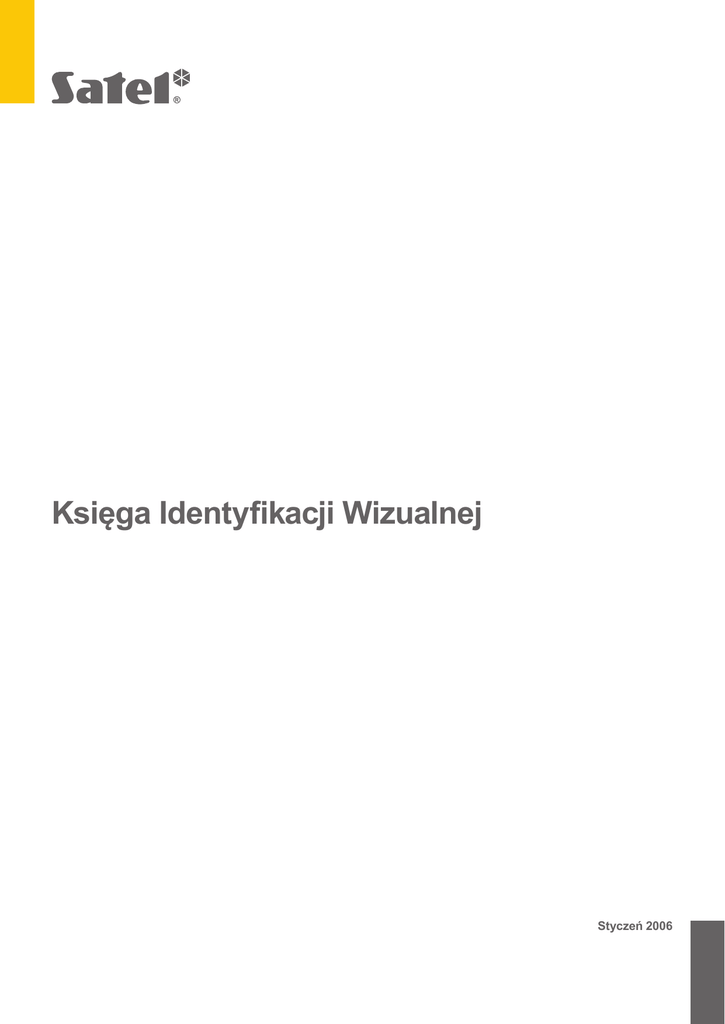 Księga Identyfikacji Wizualnej Styczeń 2006 ELEMENTY BAZOWE ZNAK - WERSJA PODSTAWOWA SIATKA MODUŁOWA 01 Siatka zbudowana jest z kwadratów o boku 1m, który jest 1/31 szerokości logotypu. Siatkę modułową stosujemy jedynie wtedy, gdy nie możemy zastosować wzorca elektronicznego. Siatkę modułową można stosować w przypadku wielkoformatowych reprodukcji logotypu, gdy niemożliwe jest elektroniczne zastosowanie wzorca, np.: podczas malowania logotypu na ścianie budynku. Siatka pokazuje też prawidłowe proporcje znaku. SATEL KSIĘGA IDENTYFIKACJI WIZUALNEJ 2006 ELEMENTY BAZOWE ZNAK - WERSJA PODSTAWOWA POLE OCHRONNE Pole ochronne zostało zdefiniowane w celu ochrony logotypu przed szumem informacyjnym od innych elementów znajdujących się na tej samej powierzchni. 02 Podstawową miarą wyznaczania pola ochronnego jest godło logotypu SATEL. SATEL KSIĘGA IDENTYFIKACJI WIZUALNEJ 2006 ELEMENTY BAZOWE ZNAK - WERSJA PODSTAWOWA ROZMIAR MINIMALNY Ze względu na czytelność logotypu określono jego wielkość minimalną. Przy wielkości minimalnej zaleca się stosowanie logotypu w wersjach podstawowych uwzględniając pole podstawowe w odpowiednim dla projektu kolorze. 03 skalowanie logotypu - wielkości poglądowe rozmiar minimalny wynosi 10 mm SATEL KSIĘGA IDENTYFIKACJI WIZUALNEJ 2006 ELEMENTY BAZOWE PODSTAWOWE WERSJE KOLORYSTYCZNE Logotyp pokazany na tłach kolorystyki firmowej. Podstawowymi kolorami firmy SATEL są: żółty, szary oraz czarny. 04 znak podstawowy tło białe znak podstawowy tło żółte znak odwrócony tło szare znak odwrócony tło czarne SATEL KSIĘGA IDENTYFIKACJI WIZUALNEJ 2006 ELEMENTY BAZOWE KOLORY FIRMOWE SPECYFIKACJA KOLORYSTYCZNA 05 Kolorystyka firmowa to kolory dominujące w różnego rodzaju materiałach promocyjnych oraz dokumentacji firmy SATEL. Wszystkie kolory Pantone mają swoje odwzorowanie w trybie CMYK oraz RGB. Kolorystyka RGB przeznaczona jest na potrzeby internetu i multimediów. model black model yellow model grey PANTONE C Black C 116 2X C Cool Grey 10 C PANTONE U Black U 108 U Cool Grey 10 U CMYK 0/0/0/100 0/20/100/0 0/0/0/70 RGB 0/0/0 255/204/0 102/102/102 DRUK MULTIMEDIA SATEL KSIĘGA IDENTYFIKACJI WIZUALNEJ 2006 ELEMENTY BAZOWE ZNAK ZASADY ODWRACANIA S K A L A S Z A R O Ś C I 06 SATEL KSIĘGA IDENTYFIKACJI WIZUALNEJ 2006 ELEMENTY BAZOWE MULTIPLIKACJA ZNAKU 07 Multiplikacja Multiplikacja - zasady konstrukcji SATEL KSIĘGA IDENTYFIKACJI WIZUALNEJ 2006